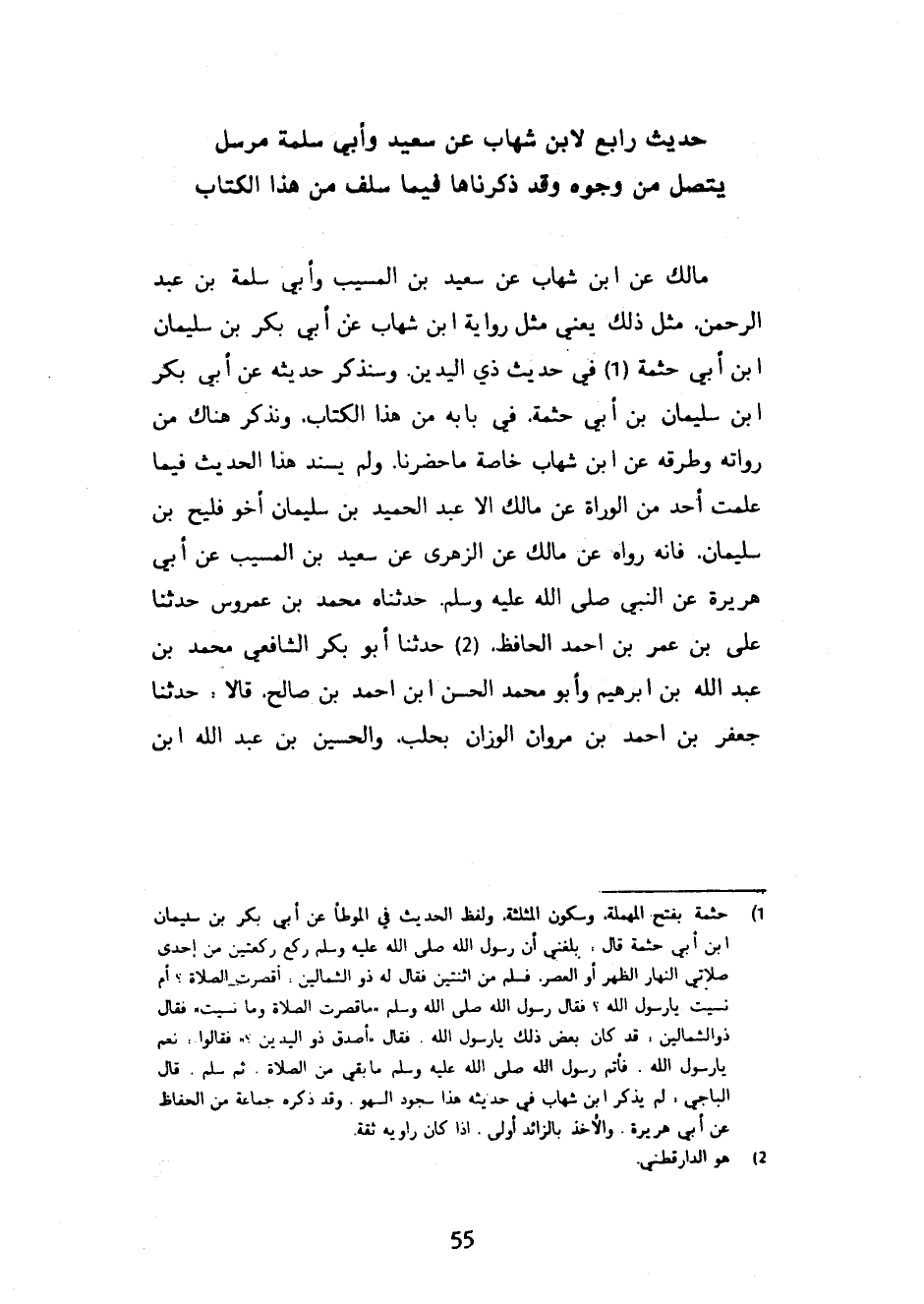 حَدِيثٌ رَابِعٌ لِابْنِ شِهَابٍ عَنْ سَعِيدٍ وَأَبِي سَلَمَةَ مُرْسَلٌ يَتَّصِلُ مِنْ وُجُوهٍ وَقَدْ ذَكَرْنَاهَا فِيمَا سَلَفَ مِنْ هَذَا الْكِتَابِ مَالِكٌ عَنِ ابْنِ شِهَابٍ عَنْ سَعِيدِ بْنِ الْمُسَيَّبِ وَأَبِي سَلَمَةَ بْنِ عَبْدِ الرَّحْمَنِ مِثْلُ ذَلِكَ يَعْنِي مِثْلَ رِوَايَةِ ابْنُ شِهَابٍ عَنْ أَبِي بَكْرِ بْنِ سُلَيْمَانَ ابن أَبِي حَثْمَةَ فِي حَدِيثِ ذِي الْيَدَيْنِ وَسَنَذْكُرُ حديثه عن أبي بكر ابن سُلَيْمَانَ بْنِ أَبِي حَثْمَةَ فِي بَابِهِ مِنْ هَذَا الْكِتَابِ وَنَذْكُرُ هُنَاكَ مِنْ رُوَاتِهِ وَطُرُقِهِ عَنِ ابْنِ شِهَابٍ خَاصَّةً مَا حَضَرَنَا وَلَمْ يُسْنِدْ هَذَا الْحَدِيثَ فِيمَا عَلِمْتُ أَحَدٌ مِنَ الرُّوَاةِ عَنْ مَالِكٍ إِلَّا عَبْدُ الْحَمِيدِ بْنُ سُلَيْمَانَ أَخُو فُلَيْحِ بْنِ سُلَيْمَانَ فَإِنَّهُ رَوَاهُ عَنْ مَالِكٌ عَنِ الزُّهْرِيِّ عَنْ سَعِيدِ بْنِ الْمُسَيَّبِ عَنْ أَبِي هُرَيْرَةَ عَنِ النَّبِيِّ صَلَّى اللَّهُ عَلَيْهِ وَسَلَّمَ حَدَّثَنَاهُ مُحَمَّدُ بْنُ عَمْرُوسٍ حَدَّثَنَا عَلِيُّ بْنُ عُمَرَ بْنِ أَحْمَدَ الْحَافِظُ حَدَّثَنَا أَبُو بَكْرٍ الشَّافِعِيُّ مُحَمَّدُ بْنُ عَبْدِ الله بن إبراهيم وأبو محمد الحسن ابن أَحْمَدَ بْنِ صَالِحٍ قَالَا حَدَّثَنَا جَعْفَرُ بْنُ أَحْمَدَ بْنِ مَرْوَانَ الْوَزَّانُ بِحَلَبَ وَالْحُسَيْنُ بْنُ عبد الله ابن