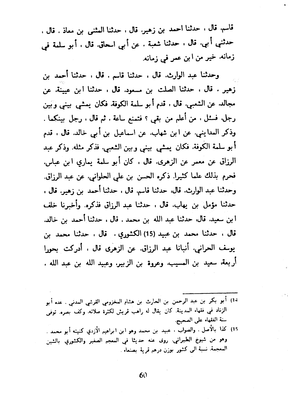 قَاسِمٌ قَالَ حَدَّثَنَا أَحْمَدُ بْنُ زُهَيْرٍ قَالَ حَدَّثَنَا الْمُثَنَّى بْنُ مُعَاذٍ قَالَ حَدَّثَنِي أَبِي قَالَ حَدَّثَنَا شُعْبَةُ عَنْ أَبِي إِسْحَاقَ قَالَ أَبُو سَلَمَةَ فِي زَمَانِهِ خَيْرٌ مِنَ ابْنِ عُمَرَ فِي زَمَانِهِ وَحَدَّثَنَا عَبْدُ الْوَارِثِ قَالَ حَدَّثَنَا قَاسِمٌ قَالَ حَدَّثَنَا أَحْمَدُ بْنُ زُهَيْرٍ قَالَ حَدَّثَنَا الصَّلْتُ بْنُ مَسْعُودٍ قَالَ حَدَّثَنَا ابْنُ عُيَيْنَةَ عَنْ مُجَالِدٍ عَنِ الشَّعْبِيِّ قَالَ قَدِمَ أَبُو سَلَمَةَ الْكُوفَةَ فَكَانَ يَمْشِي بَيْنِي وَبَيْنَ رَجُلٍ فَسُئِلَ مَنْ أَعْلَمُ مَنْ بَقِيَ فَتَمَنَّعَ سَاعَةً ثُمَّ قَالَ رَجُلٌ بَيْنَكُمَا وَذَكَرَ الْمَدَايِنِيُّ عَنِ ابْنِ شِهَابٍ عَنْ إِسْمَاعِيلَ بْنِ أَبِي خَالِدٍ قَالَ قَدِمَ أَبُو سَلَمَةَ الْكُوفَةَ فَكَانَ يَمْشِي بَيْنِي وَبَيْنَ الشَّعْبِيِّ فَذَكَرَ مِثْلَهُ وَذَكَرَ عَبْدُ الرَّزَّاقِ عَنْ مَعْمَرٍ عَنْ الزُّهْرِيِّ قَالَ كَانَ أَبُو سَلَمَةَ يُمَارِي ابْنَ عَبَّاسٍ فَحُرِمَ بِذَلِكَ عِلْمًا كَثِيرًا ذَكَرَهُ الْحَسَنُ بْنُ عَلِيٍّ الْحُلْوَانِيُّ عَنْ عَبْدِ الرَّزَّاقِ وَحَدَّثَنَا عَبْدُ الْوَارِثِ قَالَ حَدَّثَنَا قَاسِمٌ قَالَ حَدَّثَنَا أَحْمَدُ بْنُ زُهَيْرٍ قَالَ حَدَّثَنَا مُؤَمِّلُ بْنُ يَهَابَ قَالَ حَدَّثَنَا عَبْدُ الرَّزَّاقِ فَذَكَرَهُ وَأَخْبَرَنَا خَلَفُ بْنُ سَعِيدٍ قَالَ حَدَّثَنَا عَبْدُ اللَّهِ بْنُ مُحَمَّدٍ قَالَ حَدَّثَنَا أَحْمَدُ بْنُ خَالِدٍ قَالَ حَدَّثَنَا مُحَمَّدُ بْنُ عُبَيْدٍ الْكَشْوَرِيُّ قَالَ حَدَّثَنَا مُحَمَّدُ بْنُ يُوسُفَ الْحَرَّانِيُّ أَنْبَأَنَا عَبْدُ الرَّزَّاقِ عَنِ الزُّهْرِيِّ قَالَ أَدْرَكْتُ بُحُورًا أَرْبَعَةً سَعِيدَ بْنَ الْمُسَيَّبِ وَعُرْوَةَ بْنَ الزُّبَيْرِ وَعُبَيْدَ اللَّهِ بْنَ عَبْدِ اللَّهِ