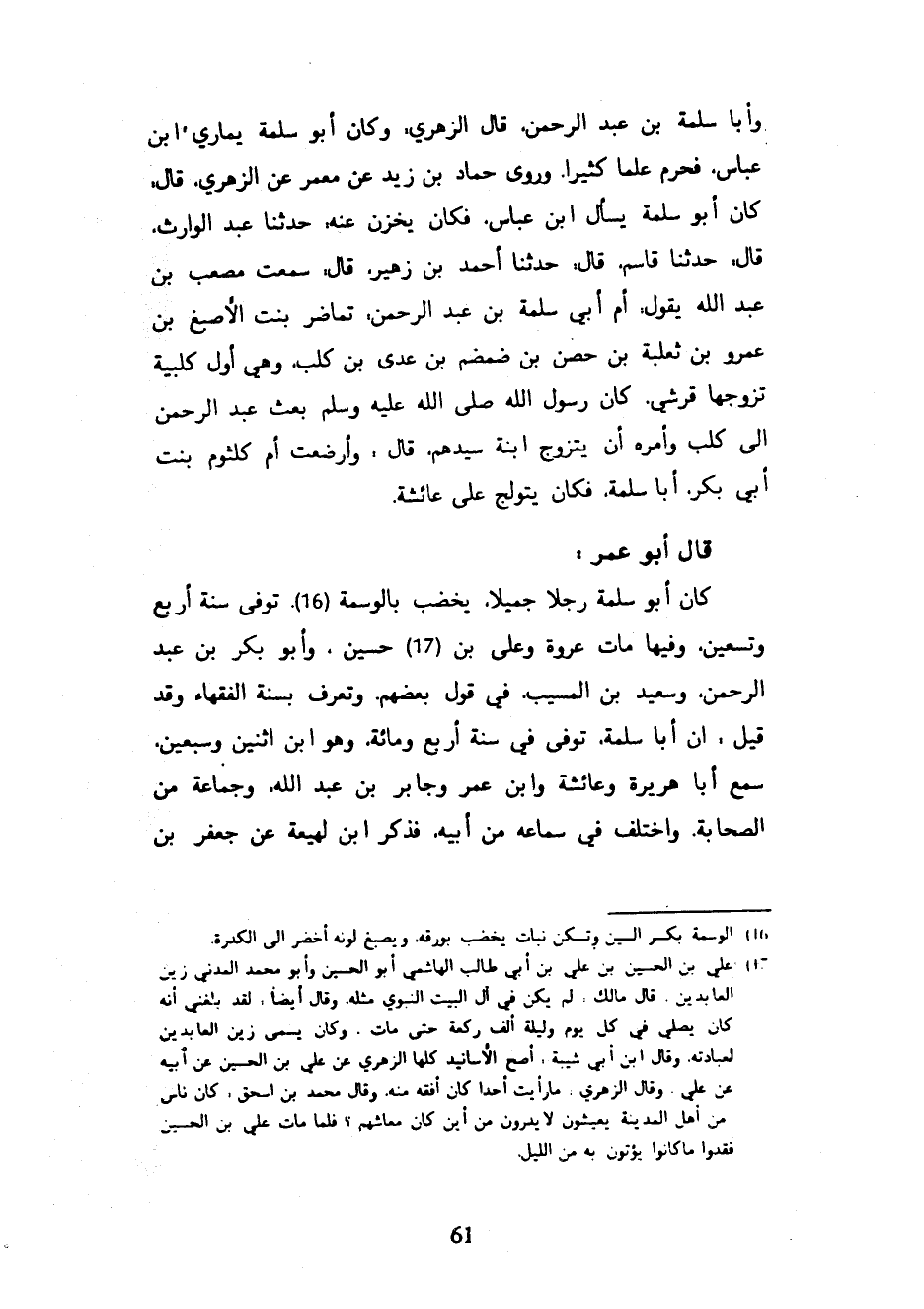 وَأَبَا سَلَمَةَ بْنَ عَبْدِ الرَّحْمَنِ قَالَ الزُّهْرِيُّ وَكَانَ أَبُو سَلَمَةَ يُمَارِي ابْنَ عَبَّاسٍ فَحُرِمَ عَلِمًا كَثِيرًا وَرَوَى حَمَّادُ بْنُ زَيْدٍ عَنْ مَعْمَرٍ عَنِ الزُّهْرِيِّ قَالَ كَانَ أَبُو سَلَمَةَ يَسْأَلُ ابْنَ عَبَّاسٍ فَكَانَ يُخَزِّنُ عَنْهُ حَدَّثَنَا عَبْدُ الْوَارِثِ قَالَ حَدَّثَنَا قَاسِمٌ قَالَ حَدَّثَنَا أَحْمَدُ بْنُ زُهَيْرٍ قَالَ سَمِعْتُ مُصْعَبَ بْنَ عَبْدِ اللَّهِ يَقُولُ أُمُّ أَبِي سَلَمَةَ بْنِ عَبْدِ الرَّحْمَنِ تُمَاضِرُ بِنْتُ الْأَصْبَغِ بْنِ عَمْرِو بْنِ ثَعْلَبَةَ بْنِ حِصْنِ بْنِ ضَمْضَمَ بْنِ عَدِيِّ بْنِ كَلْبٍ وَهِيَ أَوَّلُ كَلْبِيَّةٌ تَزَوَّجَهَا قُرَشِيٌّ كَانَ رَسُولُ اللَّهِ صَلَّى اللَّهُ عَلَيْهِ وَسَلَّمَ بَعَثَ عَبْدَ الرَّحْمَنِ إِلَى كَلْبٍ وَأَمَرَهُ أَنْ يَتَزَوَّجَ ابْنَةَ سَيِّدِهِمْ قَالَ وَأَرْضَعَتْ أُمُّ كُلْثُومٍ بِنْتُ أَبِي بَكْرٍ أَبَا سَلَمَةَ فَكَانَ يَتَوَلَّجُ عَلَى عَائِشَةَ قَالَ أَبُو عُمَرَ كَانَ أَبُو سَلَمَةَ رَجُلًا جَمِيلًا يُخَضِّبُ بِالْوَسْمَةِ تُوُفِّيَ سَنَةَ أَرْبَعٍ وَتِسْعِينَ وَفِيهَا مَاتَ عُرْوَةُ وَعَلِيُّ بْنُ حُسَيْنٍ وَأَبُو بَكْرِ بْنُ عَبْدِ الرَّحْمَنِ وَسَعِيدُ بْنُ الْمُسَيَّبِ فِي قَوْلِ بَعْضِهِمْ وَتُعْرَفُ بِسُنَّةِ الْفُقَهَاءِ وَقَدْ قِيلَ إِنَّ أَبَا سَلَمَةَ تُوُفِّيَ فِي سَنَةِ أَرْبَعٍ وَمِائَةٍ وَهُوَ ابْنُ اثْنَيْنِ وَسَبْعِينَ سَمِعَ أَبَا هُرَيْرَةَ وَعَائِشَةَ وَابْنَ عُمَرَ وَجَابِرَ بْنَ عَبْدِ اللَّهِ وَجَمَاعَةً مِنَ الصَّحَابَةِ وَاخْتُلِفَ فِي سَمَاعِهِ مِنْ أَبِيهِ فَذَكَرَ ابْنُ لَهِيعَةَ عَنْ جَعْفَرِ بْنِ