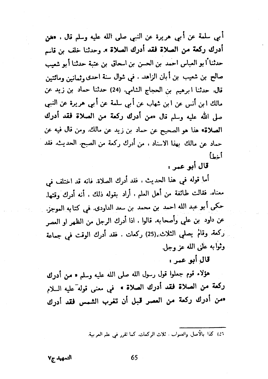 أَبِي سَلَمَةَ عَنْ أَبِي هُرَيْرَةَ عَنِ النَّبِيِّ صَلَّى اللَّهُ عَلَيْهِ وَسَلَّمَ قَالَ مَنْ أَدْرَكَ رَكْعَةً مِنَ الصَّلَاةِ فَقَدْ أَدْرَكَ الصَّلَاةَ وَحَدَّثَنَا خَلَفُ بْنُ قَاسِمٍ حَدَّثَنَا أَبُو الْعَبَّاسِ أَحْمَدُ بْنُ الْحَسَنِ بْنِ إِسْحَاقَ بْنِ عُتْبَةَ حَدَّثَنَا أَبُو شُعَيْبٍ صَالِحُ بْنُ شُعَيْبِ بْنِ أَبَانٍ الزَّاهِدُ فِي شَوَّالٍ سَنَةَ إِحْدَى وَثَمَانِينَ وَمِائَتَيْنِ قال حدثنا إبرهيم بن الحجاج الشام حَدَّثَنَا حَمَّادُ بْنُ زَيْدٍ عَنْ مَالِكِ بْنِ أَنَسٍ عَنِ ابْنِ شِهَابٍ عَنْ أَبِي سَلَمَةَ عَنْ أَبِي هُرَيْرَةَ عَنِ النَّبِيِّ صَلَّى اللَّهُ عَلَيْهِ وَسَلَّمَ قَالَ مَنْ أَدْرَكَ رَكْعَةً مِنَ الصَّلَاةِ فَقَدْ أَدْرَكَ الصَّلَاةَ هَذَا هُوَ الصَّحِيحُ عَنْ حَمَّادِ بْنِ زَيْدٍ عَنْ مَالِكٍ وَمَنْ قَالَ فِيهِ عَنْ حَمَّادٍ عَنْ مَالِكٍ بِهَذَا الْإِسْنَادِ مَنْ أَدْرَكَ رَكْعَةً مِنَ الصُّبْحِ الْحَدِيثَ فَقَدْ أَخْطَأَ - قَالَ أَبُو عُمَرَ أَمَّا قَوْلُهُ فِي هَذَا الْحَدِيثِ فَقَدْ أَدْرَكَ الصَّلَاةَ فَإِنَّهُ قَدِ اخْتُلِفَ فِي مَعْنَاهُ فَقَالَتْ طَائِفَةٌ مِنْ أَهْلِ الْعِلْمِ أَرَادَ بِقَوْلِهِ ذَلِكَ أَنَّهُ أَدْرَكَ وَقْتَهَا حَكَى أَبُو عَبْدِ اللَّهِ أَحْمَدُ بْنُ مُحَمَّدِ بْنِ سَعْدٍ الدَّاوُدِيُّ فِي كِتَابِهِ الْمُوجَزِ عَنْ دَاوُدَ بْنِ عَلِيٍّ وَأَصْحَابِهِ قَالُوا إِذَا أَدْرَكَ الرَّجُلُ مِنَ الظُّهْرِ أَوِ الْعَصْرِ رَكْعَةً وَقَامَ يُصَلِّي الثَّلَاثَ رَكَعَاتٍ فَقَدْ أَدْرَكَ الْوَقْتَ فِي جَمَاعَةٍ وَثَوَابُهُ عَلَى اللَّهِ عَزَّ وَجَلَّ - قَالَ أَبُو عُمَرَ هَؤُلَاءِ قَوْمٌ جَعَلُوا قَوْلَ رسول الله صلى الله عليه وسلم مَنْ أَدْرَكَ رَكْعَةً مِنَ الصَّلَاةِ فَقَدْ أَدْرَكَ الصَّلَاةَ فِي مَعْنَى قَوْلِهِ عَلَيْهِ السَّلَامُ مَنْ أَدْرَكَ رَكْعَةً مِنَ الْعَصْرِ قَبْلَ أَنْ تَغْرُبَ الشَّمْسُ فَقَدْ أَدْرَكَ
