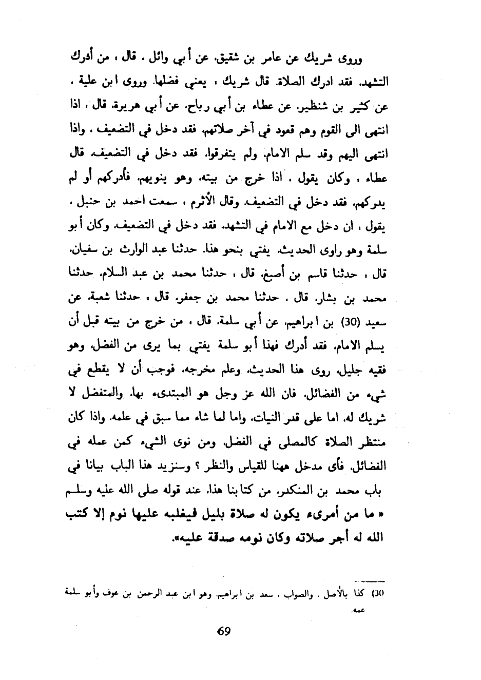 وَرَوَى شَرِيكٌ عَنْ عَامِرِ بْنِ شَقِيقٍ عَنْ أَبِي وَائِلٍ قَالَ مَنْ أَدْرَكَ التَّشَهُّدَ فَقَدْ أَدْرَكَ الصَّلَاةَ قَالَ شَرِيكٌ يَعْنِي فَضْلَهَا وَرَوَى ابْنُ عُلَيَّةَ عَنْ كَثِيرِ بْنِ شِنْظِيرٍ عَنْ عَطَاءِ بْنِ أَبِي رَبَاحٍ عَنْ أَبِي هريرة قَالَ إِذَا انْتَهَى إِلَى الْقَوْمِ وَهُمْ قُعُودٌ فِي آخِرِ صَلَاتِهِمْ فَقَدْ دَخَلَ فِي التَّضْعِيفِ وَإِذَا انْتَهَى إِلَيْهِمْ وَقَدْ سَلَّمَ الْإِمَامُ وَلَمْ يَتَفَرَّقُوا فَقَدْ دَخَلَ فِي التَّضْعِيفِ قَالَ عَطَاءٌ وَكَانَ يَقُولُ إِذَا خَرَجَ مِنْ بَيْتِهِ وَهُوَ يَنْوِيهِمْ فَأَدْرَكَهُمْ أَوْ لَمْ يُدْرِكْهُمْ فَقَدْ دَخَلَ فِي التَّضْعِيفِ وَقَالَ الْأَثْرَمُ سَمِعْتُ أَحْمَدَ بْنَ حَنْبَلٍ يَقُولُ إِنْ دَخَلَ مَعَ الْإِمَامِ فِي التَّشَهُّدِ فَقَدْ دَخَلَ فِي التَّضْعِيفِ وَكَانَ أَبُو سلمة وهو راوي الحديث يفتي بِنَحْوِ هَذَا حَدَّثَنَا عَبْدُ الْوَارِثِ بْنُ سُفْيَانَ قَالَ حَدَّثَنَا قَاسِمُ بْنُ أَصْبَغَ قَالَ حَدَّثَنَا مُحَمَّدُ بْنُ عَبْدِ السَّلَامِ حَدَّثَنَا مُحَمَّدُ بْنُ بَشَّارٍ قَالَ حَدَّثَنَا مُحَمَّدُ بْنُ جَعْفَرٍ قَالَ حَدَّثَنَا شُعْبَةُ عَنْ سَعِيدِ بْنِ إِبْرَاهِيمَ عَنْ أَبِي سَلَمَةَ قَالَ مَنْ خَرَجَ مِنْ بَيْتِهِ قَبْلَ أَنْ يُسَلِّمَ الْإِمَامُ فَقَدْ أَدْرَكَ فَهَذَا أَبُو سَلَمَةَ يُفْتِي بِمَا يَرَى مِنَ الْفَضْلِ وَهُوَ فَقِيهٌ جَلِيلٌ رَوَى هَذَا الْحَدِيثَ وَعَلِمَ مَخْرَجَهُ فَوَجَبَ أَنْ لَا يَقْطَعَ فِي شَيْءٍ مِنَ الْفَضَائِلِ فَإِنَّ اللَّهَ عَزَّ وَجَلَّ هُوَ المبتدىء بِهَا وَالْمُتَفَضِّلُ لَا شَرِيكَ لَهُ إِمَّا عَلَى قَدْرِ النِّيَّاتِ وَإِمَّا لِمَا شَاءَ مِمَّا سَبَقَ فِي عِلْمِهِ وَإِذَا كَانَ مُنْتَظَرُ الصَّلَاةِ كَالْمُصَلِّي في الفضل ومن نوى الشي كمن عمله في الفضائل فأي مدخل ههنا لِلْقِيَاسِ وَالنَّظَرِ وَسَنَزِيدُ هَذَا الْبَابَ بَيَانًا فِي بَابِ مُحَمَّدِ بْنِ الْمُنْكَدِرِ مِنْ كِتَابِنَا هَذَا عِنْدَ قَوْلِهِ صَلَّى اللَّهُ عَلَيْهِ وَسَلَّمَ مَا من امرىء يَكُونُ لَهُ صَلَاةٌ بِلَيْلٍ فَيَغْلِبُهُ عَلَيْهَا نَوْمٌ إِلَّا كَتَبَ اللَّهُ لَهُ أَجْرَ صَلَاتِهِ وَكَانَ نَوْمُهُ صَدَقَةً عَلَيْهِ