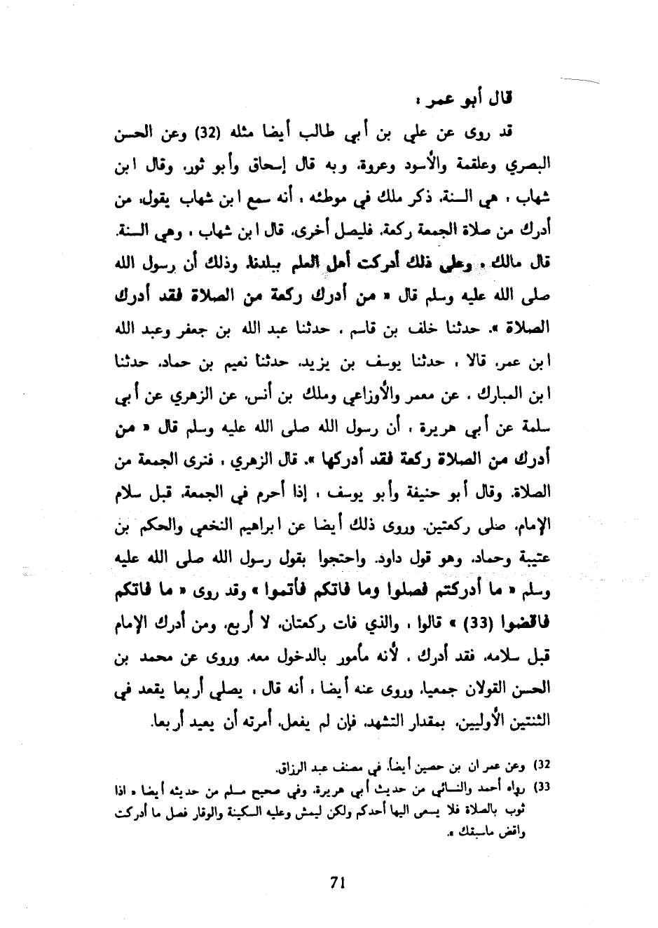 - قَالَ أَبُو عُمَرَ قَدْ رُوِيَ عَنْ عَلِيِّ بْنِ أَبِي طَالِبٍ أَيْضًا مِثْلَهُ وَعَنِ الْحَسَنِ الْبَصْرِيِّ وَعَلْقَمَةَ وَالْأَسْوَدِ وَعُرْوَةَ وَبِهِ قَالَ إِسْحَاقُ وَأَبُو ثَوْرٍ وَقَالَ ابْنُ شِهَابٍ هِيَ السُّنَّةُ ذكر ملك فِي مُوَطَّئِهِ أَنَّهُ سَمِعَ ابْنَ شِهَابٍ يَقُولُ مَنْ أَدْرَكَ مِنْ صَلَاةِ الْجُمُعَةِ رَكْعَةً فَلْيُصَلِّ أُخْرَى قَالَ ابْنُ شِهَابٍ وَهِيَ السُّنَّةُ قَالَ مَالِكٌ وَعَلَى ذَلِكَ أَدْرَكْتُ أَهْلَ الْعِلْمِ بِبَلَدِنَا وَذَلِكَ أَنَّ رَسُولَ اللَّهِ صَلَّى اللَّهُ عَلَيْهِ وَسَلَّمَ قَالَ مَنْ أَدْرَكَ رَكْعَةً مِنَ الصَّلَاةِ فَقَدْ أَدْرَكَ الصَّلَاةَ حَدَّثَنَا خَلَفُ بْنُ قَاسِمٍ حَدَّثَنَا عَبْدُ اللَّهِ بْنُ جَعْفَرٍ وَعَبْدُ اللَّهِ بْنُ عُمَرَ قَالَا حَدَّثَنَا يُوسُفُ بْنُ يَزِيدَ حَدَّثَنَا نُعَيْمُ بْنُ حَمَّادٍ حَدَّثَنَا ابْنُ الْمُبَارَكِ عن معمر والأوزاعي وملك بْنِ أَنَسٍ عَنِ الزُّهْرِيِّ عَنْ أَبِي سَلَمَةَ عَنْ أَبِي هُرَيْرَةَ أَنَّ رَسُولَ اللَّهِ صَلَّى اللَّهُ عَلَيْهِ وَسَلَّمَ قَالَ مَنْ أَدْرَكَ مِنَ الصَّلَاةِ رَكْعَةً فَقَدْ أَدْرَكَهَا قَالَ الزُّهْرِيُّ فَنَرَى الْجُمُعَةَ مِنَ الصَّلَاةِ وَقَالَ أَبُو حَنِيفَةَ وَأَبُو يُوسُفَ إِذَا أَحْرَمَ فِي الْجُمُعَةِ قَبْلَ سَلَامِ الْإِمَامِ صَلَّى رَكْعَتَيْنِ وَرُوِيَ ذَلِكَ أَيْضًا عَنِ ابْرَاهِيمَ النَّخَعِيِّ وَالْحَكَمِ بْنِ عُتَيْبَةَ وَحَمَّادٍ وَهُوَ قَوْلُ دَاوُدَ وَاحْتَجُّوا بِقَوْلِ رَسُولِ اللَّهِ صَلَّى اللَّهُ عَلَيْهِ وَسَلَّمَ مَا أَدْرَكْتُمْ فَصَلُّوا وَمَا فَاتَكُمْ فَأَتِمُّوا وَقَدْ رُوِي مَا فَاتَكُمْ فَاقْضُوا قَالُوا وَالَّذِي فَاتَ رَكْعَتَانِ لَا أَرْبَعُ وَمَنْ أَدْرَكَ الْإِمَامَ قَبْلَ سَلَامِهِ فَقَدْ أَدْرَكَ لِأَنَّهُ مَأْمُورٌ بِالدُّخُولِ مَعَهُ وَرُوِيَ عَنْ مُحَمَّدِ بْنِ الْحَسَنِ الْقَوْلَانِ جَمِيعًا وَرُوِيَ عَنْهُ أَيْضًا أَنَّهُ قَالَ يُصَلِّي أَرْبَعًا يَقْعُدُ فِي الثِّنْتَيْنِ الْأُولَيَيْنِ بِمِقْدَارِ التَّشَهُّدِ فَإِنْ لَمْ يَفْعَلْ أَمَرْتُهُ أَنْ يعيد أربعا