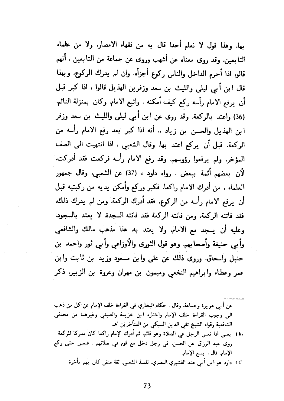 بِهَا وَهَذَا قَوْلٌ لَا نَعْلَمُ أَحَدًا قَالَ بِهِ مِنْ فُقَهَاءِ الْأَمْصَارِ وَلَا مِنْ عُلَمَاءِ التَّابِعِينَ وَقَدْ رُوِيَ مَعْنَاهُ عَنْ أَشْهَبَ وَرُوِيَ عَنْ جَمَاعَةٍ مِنَ التَّابِعِينَ أَنَّهُمْ قَالُوا إِذَا أَحْرَمَ الدَّاخِلُ وَالنَّاسُ رُكُوعٌ أَجْزَأَهُ وَإِنْ لَمْ يُدْرِكِ الرُّكُوعَ وَبِهَذَا قَالَ ابْنُ أَبِي لَيْلَى وَاللَّيْثُ بْنُ سَعْدٍ وَزُفَرُ بْنُ الْهُذَيْلِ قَالُوا إِذَا كَبَّرَ قَبْلَ أَنْ يَرْفَعَ الْإِمَامُ رَأْسَهُ رَكَعَ كَيْفَ أَمْكَنَهُ وَاتَّبَعَ الْإِمَامَ وَكَانَ بِمَنْزِلَةِ النَّائِمِ وَاعْتَدَّ بِالرَّكْعَةِ وَقَدْ رُوِيَ عَنِ ابْنِ أبي ليلى والليث بن سعد وزفر بن الْهُذَيْلِ وَالْحَسَنِ بْنِ زِيَادٍ أَنَّهُ إِذَا كَبَّرَ بَعْدَ رَفْعِ الْإِمَامِ رَأْسَهُ مِنَ الرَّكْعَةِ قَبْلَ أَنْ يَرْكَعَ اعْتَدَّ بِهَا وَقَالَ الشَّعْبِيُّ إِذَا انتهيت إلى الصف المؤخر ولم يرفعوا رؤوسهم وَقَدْ رَفَعَ الْإِمَامُ رَأْسَهُ فَرَكَعْتَ فَقَدْ أَدْرَكْتَ لِأَنَّ بَعْضَهُمْ أَئِمَّةً بِبَعْضٍ رَوَاهُ دَاوُدُ عَنِ الشَّعْبِيِّ وَقَالَ جُمْهُورُ الْعُلَمَاءِ مَنْ أَدْرَكَ الْإِمَامَ راكعا فكبر وَرَكَعَ وَأَمْكَنَ يَدَيْهِ مِنْ رُكْبَتَيْهِ قَبْلَ أَنْ يَرْفَعَ الْإِمَامُ رَأْسَهُ مِنَ الرُّكُوعِ فَقَدْ أَدْرَكَ الرَّكْعَةَ وَمَنْ لَمْ يُدْرِكْ ذَلِكَ فَقَدْ فَاتَتْهُ الرَّكْعَةُ وَمَنْ فَاتَتْهُ الرَّكْعَةُ فَقَدْ فَاتَتْهُ السَّجْدَةُ لَا يَعْتَدُّ بِالسُّجُودِ وَعَلَيْهِ أَنْ يَسْجُدَ مَعَ الْإِمَامِ وَلَا يَعْتَدُّ بِهِ هَذَا مَذْهَبُ مَالِكٍ وَالشَّافِعِيِّ وَأَبِي حَنِيفَةَ وَأَصْحَابِهِمْ وَهُوَ قَوْلُ الثَّوْرِيِّ وَالْأَوْزَاعِيِّ وَأَبِي ثَوْرٍ وَأَحْمَدَ بْنِ حَنْبَلٍ وَإِسْحَاقَ وَرُوِيَ ذَلِكَ عَنْ عَلِيٍّ وَابْنِ مَسْعُودٍ وَزَيْدِ بْنِ ثَابِتٍ وَابْنِ عُمَرَ وَعَطَاءٍ وَإِبْرَاهِيمَ النَّخَعِيِّ وَمَيْمُونِ بْنِ مِهْرَانَ وَعُرْوَةَ بْنِ الزُّبَيْرِ ذَكَرَ