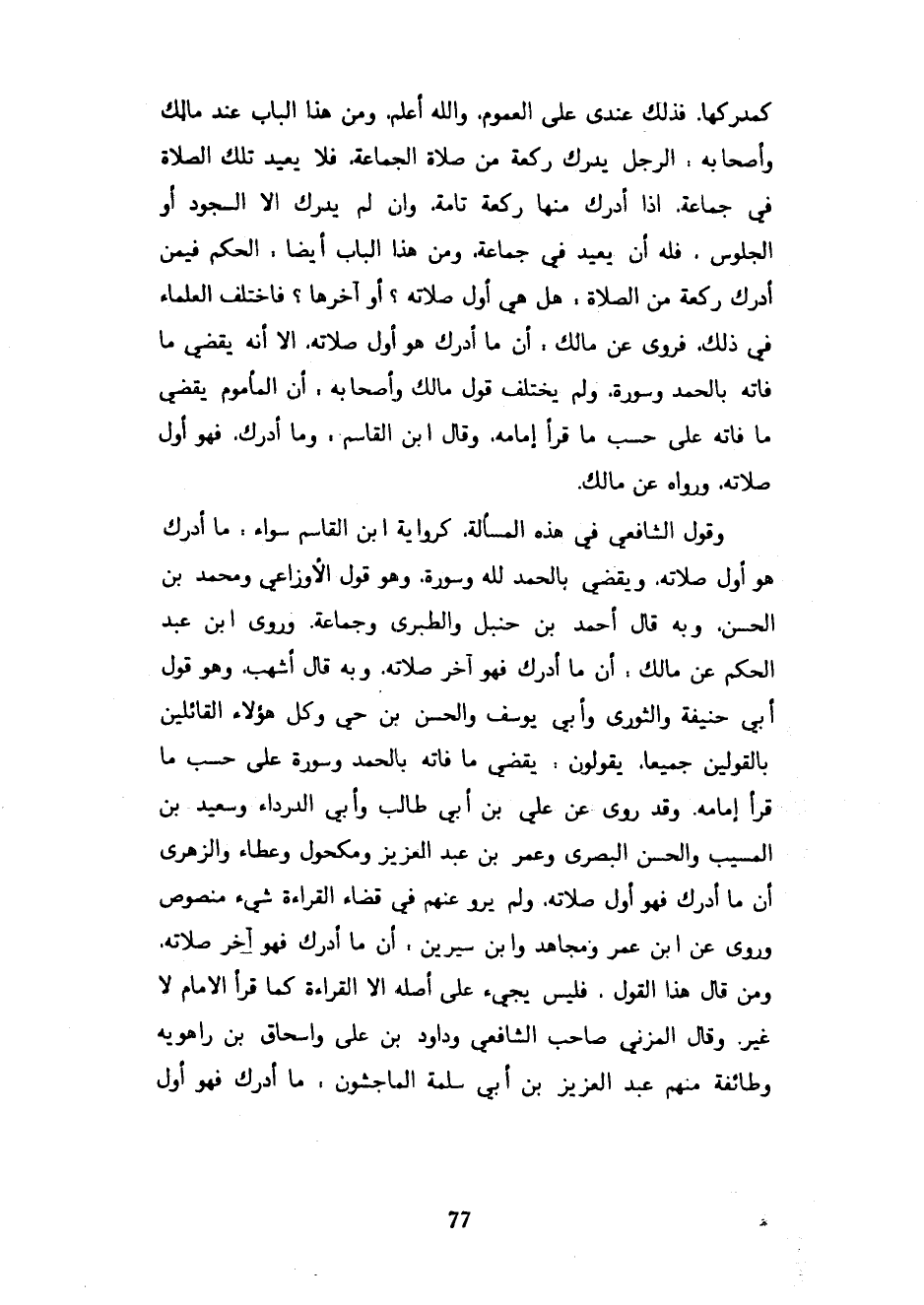 كَمُدْرِكِهَا فَذَلِكَ عِنْدِي عَلَى الْعُمُومِ وَاللَّهُ أَعْلَمُ وَمِنْ هَذَا الْبَابِ عِنْدَ مَالِكٍ وَأَصْحَابِهِ الرَّجُلُ يُدْرِكُ رَكْعَةً مِنْ صَلَاةِ الْجَمَاعَةِ فَلَا يُعِيدُ تِلْكَ الصَّلَاةَ فِي جَمَاعَةٍ إِذَا أَدْرَكَ مِنْهَا رَكْعَةً تَامَّةً وَإِنْ لَمْ يُدْرِكْ إِلَّا السُّجُودَ أَوِ الْجُلُوسَ فَلَهُ أَنْ يُعِيدَ فِي جَمَاعَةٍ وَمِنْ هَذَا الْبَابِ أَيْضًا الْحُكْمُ فِيمَنْ أَدْرَكَ رَكْعَةً مِنَ الصَّلَاةِ هَلْ هِيَ أَوَّلُ صَلَاتِهِ أَوْ آخِرُهَا فَاخْتَلَفَ الْعُلَمَاءُ فِي ذَلِكَ فَرُوِيَ عَنْ مَالِكٍ أَنَّ مَا أَدْرَكَ هُوَ أَوَّلُ صَلَاتِهِ إِلَّا أَنَّهُ يَقْضِي مَا فَاتَهُ بِالْحَمْدِ وَسُورَةٍ وَلَمْ يَخْتَلِفْ قَوْلُ مَالِكٍ وَأَصْحَابِهِ أَنَّ الْمَأْمُومَ يَقْضِي مَا فَاتَهُ عَلَى حَسَبِ مَا قَرَأَ إِمَامُهُ وَقَالَ ابْنُ الْقَاسِمِ وَمَا أَدْرَكَ فَهُوَ أَوَّلُ صَلَاتِهِ وَرَوَاهُ عَنْ مَالِكٍ وَقَوْلُ الشَّافِعِيِّ فِي هَذِهِ الْمَسْأَلَةِ كَرِوَايَةِ ابْنِ الْقَاسِمِ سَوَاءً مَا أَدْرَكَ هُوَ أَوَّلُ صَلَاتِهِ وَيَقْضِي بِالْحَمْدُ لِلَّهِ وَسُورَةٍ وَهُوَ قَوْلُ الْأَوْزَاعِيِّ وَمُحَمَّدِ بْنِ الْحَسَنِ وَبِهِ قَالَ أَحْمَدُ بْنُ حَنْبَلٍ وَالطَّبَرِيُّ وَجَمَاعَةٌ وَرَوَى ابْنُ عَبْدِ الْحَكَمِ عَنْ مَالِكٍ إِنْ مَا أَدْرَكَ فَهُوَ آخِرُ صَلَاتِهِ وَبِهِ قَالَ أَشْهَبُ وَهُوَ قَوْلُ أَبِي حَنِيفَةَ وَالثَّوْرِيِّ وَأَبِي يُوسُفَ وَالْحَسَنِ بْنِ حَيٍّ وَكُلُّ هَؤُلَاءِ الْقَائِلِينَ بِالْقَوْلَيْنِ جَمِيعًا يَقُولُونَ يَقْضِي مَا فَاتَهُ بِالْحَمْدِ وَسُورَةٍ عَلَى حَسَبِ مَا قَرَأَ إِمَامُهُ وَقَدْ رُوِيَ عَنْ عَلِيِّ بْنِ أَبِي طَالِبٍ وَأَبِي الدَّرْدَاءَ وَسَعِيدِ بْنِ الْمُسَيَّبِ وَالْحَسَنِ الْبَصْرِيِّ وَعُمَرَ بْنِ عَبْدِ الْعَزِيزِ وَمَكْحُولٍ وَعَطَاءٍ وَالزُّهْرِيِّ أَنَّ مَا أَدْرَكَ فَهُوَ أَوَّلُ صَلَاتِهِ وَلَمْ يُرْوَ عَنْهُمْ فِي قَضَاءِ الْقِرَاءَةِ شَيْءٌ مَنْصُوصٌ وَرُوِيَ عَنِ ابْنِ عُمَرَ وَمُجَاهِدٍ وَابْنِ سِيرِينَ أَنَّ مَا أَدْرَكَ فَهُوَ آخِرُ صَلَاتِهِ وَمَنْ قَالَ هَذَا الْقَوْلَ فَلَيْسَ يَجِيءُ عَلَى أَصْلِهِ إِلَّا الْقِرَاءَةُ كَمَا قَرَأَ الْإِمَامُ لَا غير وَقَالَ الْمُزَنِيُّ صَاحِبُ الشَّافِعِيِّ وَدَاوُدُ بْنُ عَلِيٍّ وَإِسْحَاقُ بْنُ رَاهَوَيْهِ وَطَائِفَةٌ مِنْهُمْ عَبْدُ الْعَزِيزِ بْنُ أَبِي سَلَمَةَ الْمَاجِشُونُ مَا أَدْرَكَ فَهُوَ أول