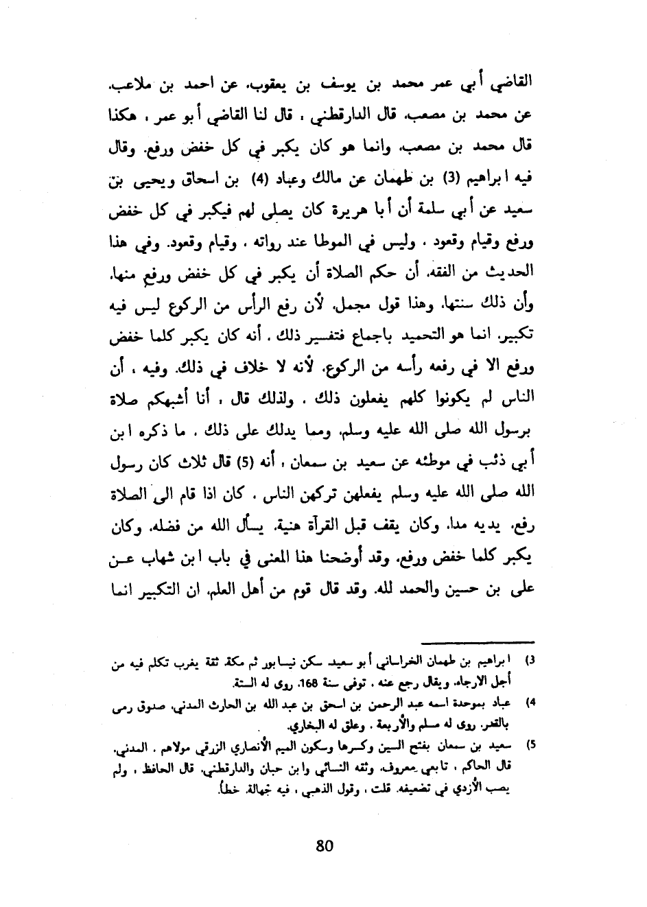 الْقَاضِي أَبِي عُمَرَ مُحَمَّدِ بْنِ يُوسُفَ بْنِ يَعْقُوبَ عَنْ أَحْمَدَ بْنِ مُلَاعِبَ عَنْ مُحَمَّدِ بْنِ مُصْعَبٍ قَالَ الدَّارَقُطْنِيُّ قَالَ لَنَا الْقَاضِي أَبُو عُمَرَ هَكَذَا قَالَ مُحَمَّدُ بْنُ مُصْعَبٍ وَإِنَّمَا هُوَ كَانَ يُكَبِّرُ فِي كُلِّ خَفْضٍ وَرَفْعٍ وَقَالَ فِيهِ إِبْرَاهِيمُ بْنُ طَهْمَانَ عَنْ مَالِكٍ وَعَبَّادِ بْنِ إِسْحَاقَ وَيَحْيَى بْنِ سَعِيدٍ عَنْ أَبِي سَلَمَةَ أَنَّ أَبَا هُرَيْرَةَ كَانَ يُصَلِّي لَهُمْ فَيُكَبِّرُ فِي كُلِّ خَفْضٍ وَرَفْعٍ وَقِيَامٍ وَقُعُودٍ وَلَيْسَ فِي الْمُوَطَّأِ عِنْدَ رُوَاتِهِ وَقِيَامٍ وَقُعُودٍ وَفِي هَذَا الْحَدِيثِ مِنَ الْفِقْهِ أَنَّ حُكْمَ الصَّلَاةِ أَنْ يُكَبِّرَ فِي كُلِّ خَفْضٍ وَرَفْعٍ مِنْهَا وَأَنَّ ذَلِكَ سُنَّتُهَا وَهَذَا قَوْلٌ مُجْمَلٌ لِأَنَّ رَفْعَ الرَّأْسِ مِنَ الرُّكُوعِ لَيْسَ فِيهِ تَكْبِيرٌ إِنَّمَا هُوَ التَّحْمِيدُ بِإِجْمَاعٍ فَتَفْسِيرُ ذَلِكَ أَنَّهُ كَانَ يُكَبِّرُ كُلَّمَا خَفَضَ وَرَفَعَ إِلَّا فِي رَفْعِهِ رَأْسَهُ مِنَ الرُّكُوعِ لِأَنَّهُ لَا خِلَافَ فِي ذَلِكَ وَفِيهِ أَنَّ النَّاسَ لَمْ يَكُونُوا كُلُّهُمْ يَفْعَلُونَ ذَلِكَ وَلِذَلِكَ قَالَ أَنَا أَشْبَهُكُمْ صَلَاةً بِرَسُولِ اللَّهِ صَلَّى اللَّهُ عَلَيْهِ وَسَلَّمَ وَمِمَّا يَدُلُّكَ عَلَى ذَلِكَ مَا ذَكَرَهُ ابْنُ أَبِي ذِئْبٍ فِي مُوَطَّئِهِ عَنْ سَعِيدِ بْنِ سَمْعَانَ أَنَّهُ قَالَ ثَلَاثٌ كَانَ رَسُولُ اللَّهِ صَلَّى اللَّهُ عَلَيْهِ وَسَلَّمَ يَفْعَلُهُنَّ تَرَكَهُنَّ النَّاسُ كَانَ إِذَا قَامَ إِلَى الصَّلَاةِ رَفَعَ يَدَيْهِ مَدًّا وَكَانَ يَقِفُ قَبْلَ القرآة هُنَيَّةً يَسْأَلُ اللَّهَ مِنْ فَضْلِهِ وَكَانَ يُكَبِّرُ كُلَّمَا خَفَضَ وَرَفَعَ وَقَدْ أَوْضَحْنَا هَذَا الْمَعْنَى فِي بَابِ ابْنِ شِهَابٍ عَنْ عَلِيِّ بْنِ حُسَيْنٍ وَالْحَمْدُ لِلَّهِ وَقَدْ قَالَ قَوْمٌ مِنْ أَهْلِ الْعِلْمِ إِنَّ التَّكْبِيرَ إِنَّمَا