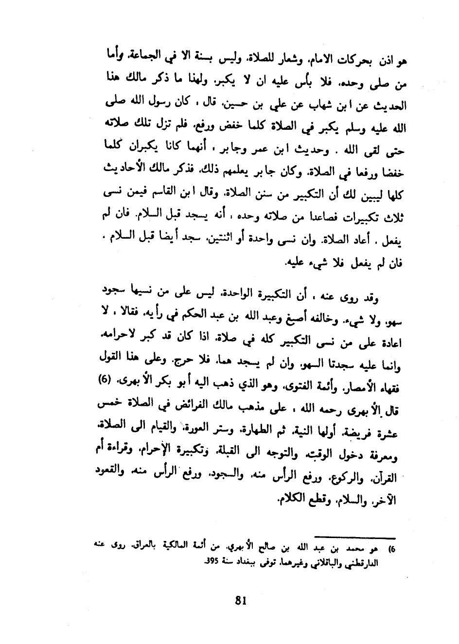 هُوَ إِذْنٌ بِحَرَكَاتِ الْإِمَامِ وَشِعَارٌ لِلصَّلَاةِ وَلَيْسَ بِسُنَّةٍ إِلَّا فِي الْجَمَاعَةِ وَأَمَّا مَنْ صَلَّى وَحْدَهُ فَلَا بَأْسَ عَلَيْهِ أَنْ لَا يُكَبِّرَ وَلِهَذَا مَا ذَكَرَ مَالِكٌ هَذَا الْحَدِيثَ عَنِ ابْنِ شِهَابٍ عَنْ عَلِيِّ بْنِ حُسَيْنٍ قَالَ كَانَ رَسُولُ اللَّهِ صَلَّى اللَّهُ عَلَيْهِ وَسَلَّمَ يُكَبِّرُ فِي الصَّلَاةِ كُلَّمَا خَفَضَ وَرَفَعَ فَلَمْ تَزَلْ تِلْكَ صَلَاتَهُ حَتَّى لَقِيَ اللَّهَ وَحَدِيثَ ابْنِ عُمَرَ وَجَابِرٍ أَنَّهُمَا كَانَا يُكَبِّرَانِ كُلَّمَا خَفَضَا وَرَفَعَا فِي الصَّلَاةِ وَكَانَ جَابِرٌ يُعَلِّمُهُمْ ذَلِكَ فَذَكَرَ مَالِكٌ الْأَحَادِيثَ كُلَّهَا لِيُبَيِّنَ لَكَ أَنَّ التَّكْبِيرَ مِنْ سُنَنِ الصَّلَاةِ وَقَالَ ابْنُ القاسم فيمن نسي ثلاث تكبيرات فصاعدا مِنْ صَلَاتِهِ وَحْدَهُ أَنَّهُ يَسْجُدُ قَبْلَ السَّلَامِ فَإِنْ لَمْ يَفْعَلْ أَعَادَ الصَّلَاةَ وَإِنْ نَسِيَ وَاحِدَةً أَوِ اثْنَتَيْنِ سَجَدَ أَيْضًا قَبْلَ السَّلَامِ فَإِنْ لَمْ يَفْعَلْ فَلَا شَيْءَ عَلَيْهِ وَقَدْ رُوِيَ عَنْهُ أَنَّ التَّكْبِيرَةَ الْوَاحِدَةَ لَيْسَ عَلَى من نسيها سجود سهو وَلَا شَيْءٌ وَخَالَفَهُ أَصْبَغُ وَعَبْدُ اللَّهِ بْنُ عَبْدِ الْحَكَمِ فِي رَأْيِهِ فَقَالَا لَا إِعَادَةَ عَلَى مَنْ نَسِيَ التَّكْبِيرَ كُلَّهُ فِي صَلَاةٍ إِذَا كَانَ قَدْ كَبَّرَ لِإِحْرَامِهِ وَإِنَّمَا عَلَيْهِ سَجْدَتَا السَّهْوِ وَإِنْ لَمْ يَسْجُدْهُمَا فَلَا حَرَجَ وَعَلَى هَذَا الْقَوْلِ فُقَهَاءُ الْأَمْصَارِ وَأَئِمَّةُ الْفَتْوَى وَهُوَ الَّذِي ذَهَبَ إِلَيْهِ أَبُو بَكْرٍ الْأَبْهَرِيُّ قَالَ الْأَبْهَرِيُّ رَحِمَهُ اللَّهُ عَلَى مَذْهَبِ مَالِكٍ الْفَرَائِضُ فِي الصَّلَاةِ خَمْسَ عَشْرَةَ فَرِيضَةً أَوَّلُهَا النِّيَّةُ ثُمَّ الطَّهَارَةُ وَسِتْرُ الْعَوْرَةِ وَالْقِيَامُ إِلَى الصَّلَاةِ وَمَعْرِفَةُ دُخُولِ الْوَقْتِ وَالتَّوَجُّهُ إِلَى الْقِبْلَةِ وَتَكْبِيرَةُ الْإِحْرَامِ وَقِرَاءَةُ أُمِّ الْقُرْآنِ وَالرُّكُوعُ وَرَفْعُ الرَّأْسِ مِنْهُ وَالسُّجُودُ وَرَفْعُ الرَّأْسِ مِنْهُ وَالْقُعُودُ الْآخِرُ وَالسَّلَامُ وَقَطْعُ الْكَلَامِ