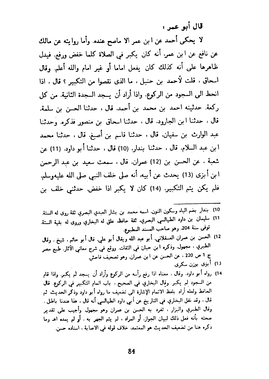 - قَالَ أَبُو عُمَرَ لَا يَحْكِي أَحْمَدُ عَنِ ابْنِ عُمَرَ إِلَّا مَا صَحَّ عِنْدَهُ وَأَمَّا رِوَايَتُهُ عَنْ مَالِكٍ عَنْ نَافِعٍ عَنِ ابْنِ عُمَرَ أَنَّهُ كَانَ يُكَبِّرُ فِي الصَّلَاةِ كُلَّمَا خَفَضَ وَرَفَعَ فَيَدُلُّ ظَاهِرُهَا عَلَى أَنَّهُ كَذَلِكَ كَانَ يَفْعَلُ إِمَامًا أَوْ غَيْرَ إِمَامٍ وَاللَّهُ أَعْلَمُ وَقَالَ إِسْحَاقُ قُلْتُ لِأَحْمَدَ بْنِ حَنْبَلٍ مَا الَّذِي نَقَصُوا مِنَ التَّكْبِيرِ قَالَ إِذَا انْحَطَّ إِلَى السُّجُودِ مِنَ الرُّكُوعِ وَإِذَا أَرَادَ أَنْ يَسْجُدَ السَّجْدَةَ الثَّانِيَةَ مِنْ كُلِّ رَكْعَةٍ حَدَّثَنِيهِ أَحْمَدُ بْنُ مُحَمَّدِ بْنِ أَحْمَدَ قَالَ حَدَّثَنَا الْحَسَنُ بْنُ سَلَمَةَ قَالَ حَدَّثَنَا ابْنُ الْجَارُودِ قَالَ حَدَّثَنَا إِسْحَاقُ بْنُ مَنْصُورٍ فَذَكَرَهُ وَحَدَّثَنَا عَبْدُ الْوَارِثِ بْنُ سُفْيَانَ قَالَ حَدَّثَنَا قَاسِمُ بْنُ أَصْبَغَ قَالَ حَدَّثَنَا مُحَمَّدُ بْنُ عَبْدِ السَّلَامِ قَالَ حَدَّثَنَا بُنْدَارٌ قَالَ حَدَّثَنَا أَبُو دَاوُدَ عَنْ شُعْبَةَ عَنِ الْحَسَنِ بْنِ عِمْرَانَ قَالَ سَمِعْتُ سَعِيدَ بْنَ عَبْدِ الرَّحْمَنِ بْنَ أَبَزَى يُحَدِّثُ عَنْ أَبِيهِ أَنَّهُ صَلَّى خَلْفَ النَّبِيِّ صَلَّى اللَّهُ عَلَيْهِ وَسَلَّمَ فَلَمْ يَكُنْ يُتِمُّ التَّكْبِيرَ كَانَ لَا يُكَبِّرُ إِذَا خَفَضَ حَدَّثَنِي خَلَفُ بْنُ