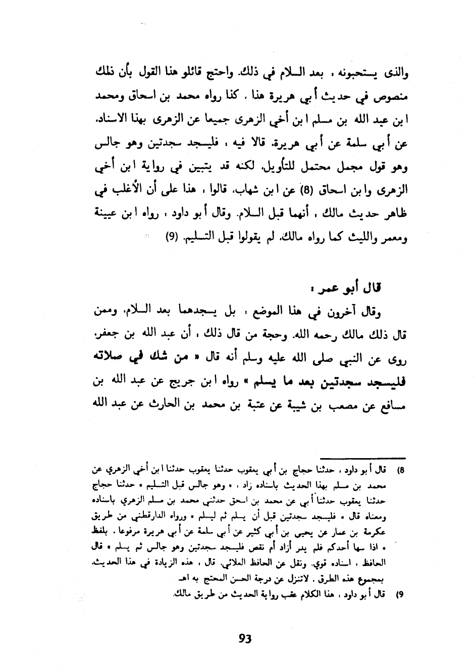 وَالَّذِي يَسْتَحِبُّونَهُ بَعْدَ السَّلَامِ فِي ذَلِكَ وَاحْتَجَّ قائلوا هَذَا الْقَوْلِ بِأَنَّ ذَلِكَ مَنْصُوصٌ فِي حَدِيثِ أَبِي هُرَيْرَةَ هَذَا كَذَا رَوَاهُ مُحَمَّدُ بْنُ إِسْحَاقَ وَمُحَمَّدُ بْنُ عَبْدِ اللَّهِ بْنِ مُسْلِمٍ ابْنُ أَخِي الزُّهْرِيِّ جَمِيعًا عَنِ الزُّهْرِيِّ بِهَذَا الْإِسْنَادِ عَنْ أَبِي سَلَمَةَ عَنْ أَبِي هُرَيْرَةَ قَالَا فِيهِ فَلْيَسْجُدْ سَجْدَتَيْنِ وَهُوَ جَالِسٌ وَهُوَ قَوْلٌ مُجْمَلٌ مُحْتَمِلٌ لِلتَّأْوِيلِ لَكِنَّهُ قَدْ يَتَبَيَّنُ فِي رِوَايَةِ ابْنِ أَخِي الزُّهْرِيِّ وَابْنِ إِسْحَاقَ عَنِ ابْنِ شِهَابٍ قَالُوا هَذَا عَلَى أَنَّ الْأَغْلَبَ فِي ظَاهِرِ حَدِيثِ مَالِكٍ أَنَّهُمَا قَبْلَ السَّلَامِ وَقَالَ أَبُو دَاوُدَ رَوَاهُ ابْنُ عُيَيْنَةَ ومعمر والليث كَمَا رَوَاهُ مَالِكٌ لَمْ يَقُولُوا قَبْلَ التَّسْلِيمِ - قَالَ أَبُو عُمَرَ وَقَالَ آخَرُونَ فِي هَذَا الْمَوْضِعِ بَلْ يَسْجُدْهُمَا بَعْدَ السَّلَامِ وَمِمَّنْ قَالَ ذَلِكَ مَالِكٌ رَحِمَهُ اللَّهُ وَحُجَّةُ مَنْ قَالَ ذَلِكَ أَنَّ عَبْدَ اللَّهِ بْنَ جَعْفَرٍ رَوَى عَنِ النَّبِيِّ صَلَّى اللَّهُ عَلَيْهِ وَسَلَّمَ أَنَّهُ قَالَ مَنْ شَكَّ فِي صَلَاتِهِ فَلْيَسْجُدْ سَجْدَتَيْنِ بَعْدَمَا يُسَلِّمُ رَوَاهُ ابْنُ جُرَيْجٍ عَنْ عَبْدِ اللَّهِ بْنِ مُسَافِعٍ عَنْ مُصْعَبِ بْنِ شَيْبَةَ عَنْ عُتْبَةَ بْنِ مُحَمَّدِ بْنِ الْحَارِثِ عَنْ عبد الله