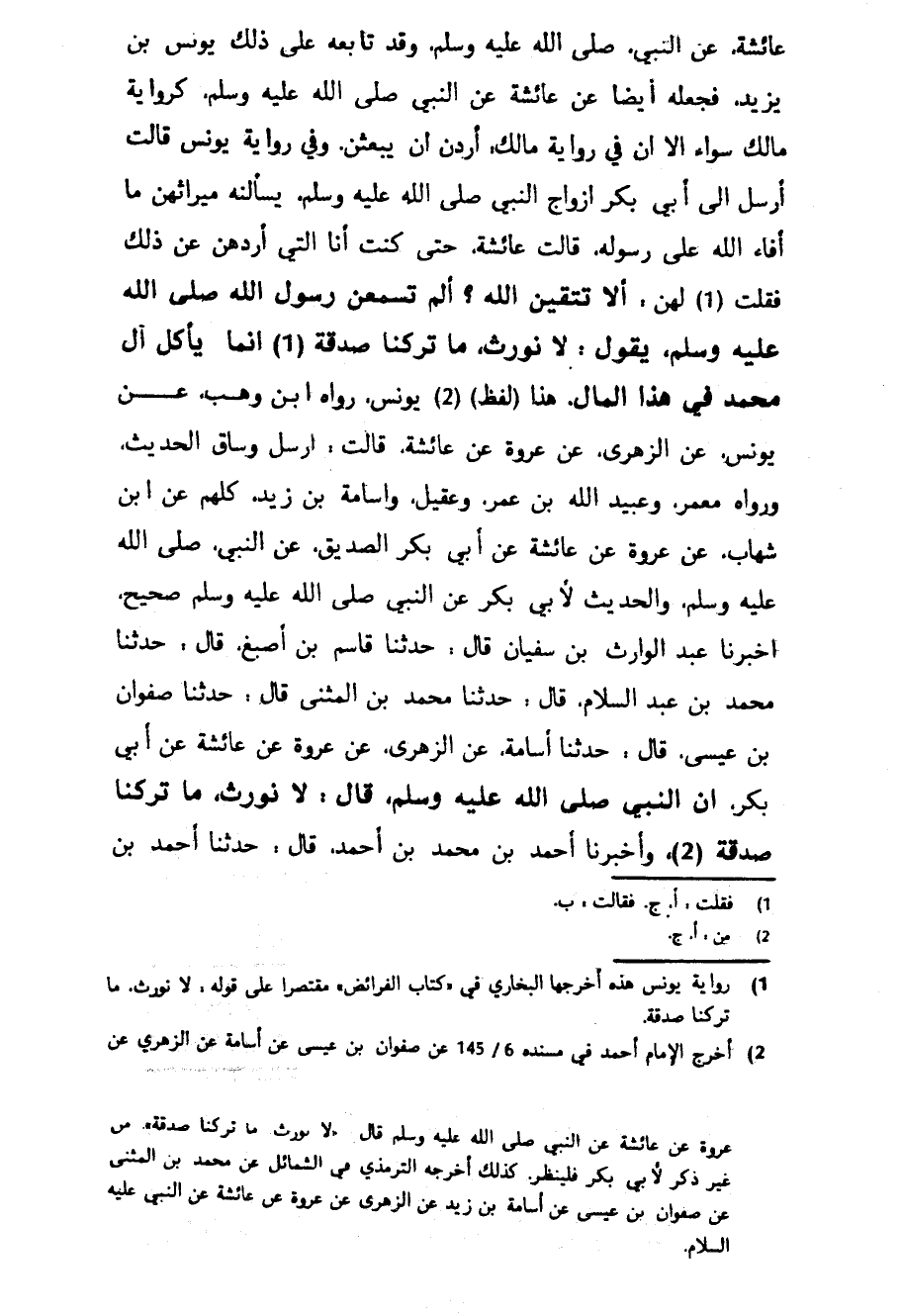 عَائِشَةَ عَنِ النَّبِيِّ صَلَّى اللَّهُ عَلَيْهِ وَسَلَّمَ وَقَدْ تَابَعَهُ عَلَى ذَلِكَ يُونُسُ بْنُ يَزِيدَ فَجَعَلَهُ أَيْضًا عَنْ عَائِشَةَ عَنِ النَّبِيِّ صَلَّى اللَّهُ عَلَيْهِ وَسَلَّمَ كَرِوَايَةِ مَالِكٍ سَوَاءً إِلَّا أَنَّ فِي رِوَايَةِ مَالِكٍ أَرَدْنَ أَنْ يَبْعَثْنَ وَفِي رِوَايَةِ يُونُسَ قَالَتْ أَرْسَلَ إِلَى أَبِي بَكْرٍ أَزْوَاجُ النَّبِيِّ صَلَّى اللَّهُ عَلَيْهِ وَسَلَّمَ يَسْأَلْنَهُ مِيرَاثَهُنَّ مَا أَفَاءَ اللَّهُ عَلَى رَسُولِهِ قَالَتْ عَائِشَةُ حَتَّى كُنْتُ أَنَا الَّتِي أَرُدُّهُنَّ عَنْ ذَلِكَ فَقَلْتُ لَهُنَّ أَلَا تَتَّقِينَ اللَّهَ أَلَمْ تَسْمَعْنَ رَسُولَ اللَّهِ صَلَّى اللَّهُ عَلَيْهِ وَسَلَّمَ يَقُولُ لَا نُورَثُ مَا تَرَكْنَا صَدَقَةٌ إِنَّمَا يَأْكُلُ آلُ مُحَمَّدٍ فِي هَذَا الْمَالِ هَذَا (لَفْظُ) يُونُسَ رَوَاهُ ابْنُ وَهْبٍ عَنْ يُونُسُ عَنِ الزُّهْرِيِّ عَنْ عُرْوَةَ عَنْ عَائِشَةَ قَالَتْ أرسل وساق الحديث ورواه مع مَعْمَرٌ وَعَبِيدُ اللَّهِ بْنُ عُمَرَ وَعَقِيلٌ وَأُسَامَةُ بْنُ زَيْدٍ كُلُّهُمْ عَنِ ابْنِ شِهَابٍ عَنْ عُرْوَةَ عَنْ عَائِشَةَ عَنْ أَبِي بَكْرٍ الصِّدِّيقِ عَنِ النَّبِيِّ صَلَّى اللَّهُ عَلَيْهِ وَسَلَّمَ وَالْحَدِيثُ لِأَبِي بَكْرٍ عَنِ النَّبِيِّ صَلَّى اللَّهُ عَلَيْهِ وَسَلَّمَ صَحِيحٌ أَخْبَرَنَا عَبْدُ الْوَارِثِ بْنُ سُفْيَانَ قَالَ حَدَّثَنَا قَاسِمُ بْنُ أَصْبَغَ قَالَ حَدَّثَنَا مُحَمَّدُ بْنُ عَبْدِ السَّلَامِ قَالَ حَدَّثَنَا مُحَمَّدُ بْنُ الْمُثَنَّى قَالَ حَدَّثَنَا صَفْوَانُ بْنُ عِيسَى قَالَ حَدَّثَنَا أُسَامَةُ عَنِ الزُّهْرِيِّ عَنْ عُرْوَةَ عَنْ عَائِشَةَ عَنْ أَبِي بَكْرٍ أَنَّ النَّبِيَّ صَلَّى اللَّهُ عَلَيْهِ وَسَلَّمَ قَالَ لَا نُورَثُ مَا تَرَكْنَا صَدَقَةٌ وَأَخْبَرَنَا أَحْمَدُ بْنُ مُحَمَّدِ بْنِ أَحْمَدَ قَالَ حَدَّثَنَا أَحْمَدُ بْنُ