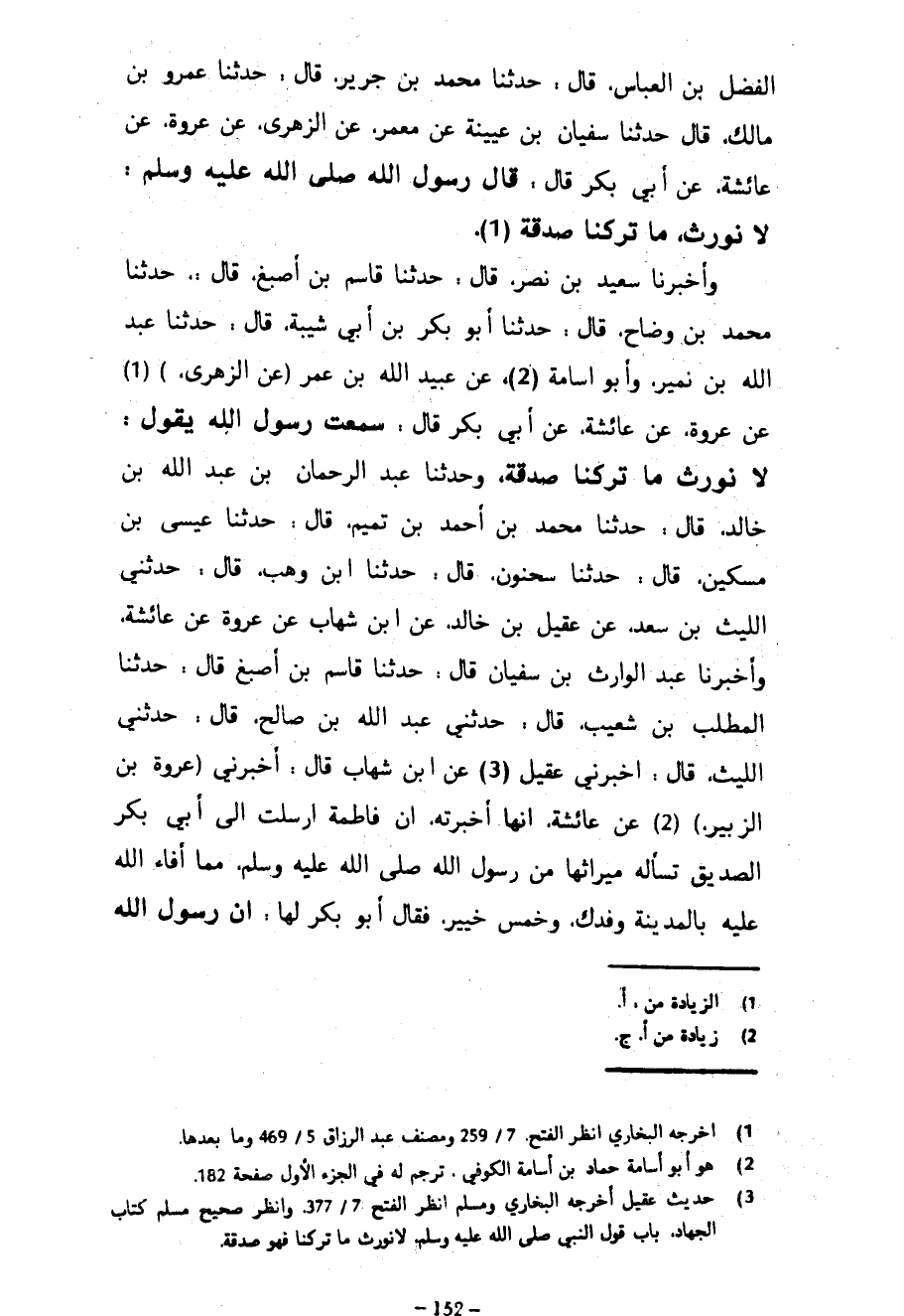 الْفَضْلِ بْنِ الْعَبَّاسِ قَالَ حَدَّثَنَا مُحَمَّدُ بْنُ جَرِيرٍ قَالَ حَدَّثَنَا عَمْرُو بْنُ مَالِكٍ قَالَ حَدَّثَنَا سُفْيَانُ بْنُ عُيَيْنَةَ عَنْ مَعْمَرٍ عَنِ الزُّهْرِيِّ عَنْ عُرْوَةَ عَنْ عَائِشَةَ عَنْ أَبِي بَكْرٍ قَالَ قَالَ رَسُولُ اللَّهِ صَلَّى اللَّهُ عَلَيْهِ وَسَلَّمَ لَا نُورَثُ مَا تَرَكْنَا صَدَقَةٌ وَأَخْبَرَنَا سَعِيدُ بْنُ نَصْرٍ قَالَ حَدَّثَنَا قَاسِمُ بْنُ أَصْبَغَ قَالَ حَدَّثَنَا مُحَمَّدُ بْنُ وَضَّاحٍ قَالَ حَدَّثَنَا أَبُو بَكْرِ بْنُ أَبِي شَيْبَةَ قَالَ حَدَّثَنَا عَبْدُ اللَّهِ بْنُ نُمَيْرٍ وَأَبُو أُسَامَةَ عَنْ عُبَيْدِ اللَّهِ بْنِ عُمَرَ (عَنِ الزُّهْرِيِّ) عَنْ عُرْوَةَ عَنْ عَائِشَةَ عَنْ أَبِي بَكْرٍ قَالَ سَمِعْتُ رَسُولَ اللَّهِ يَقُولُ لَا نُورَثُ مَا تَرَكَنَا صَدَقَةٌ وَحَدَّثَنَا عَبْدُ الرَّحْمَنِ بْنُ عَبْدِ اللَّهِ بْنِ خَالِدٍ قَالَ حَدَّثَنَا مُحَمَّدُ بْنُ أَحْمَدَ بْنِ تَمِيمٍ قَالَ حَدَّثَنَا عِيسَى بْنُ مِسْكِينٍ قَالَ حَدَّثَنَا سَحْنُونٌ قَالَ حَدَّثَنَا ابْنُ وَهْبٍ قَالَ حَدَّثَنِي اللَّيْثُ بْنُ سَعْدٍ عَنْ عُقَيْلِ بْنِ خَالِدٍ عَنِ ابْنِ شِهَابٍ عَنْ عُرْوَةَ عَنْ عَائِشَةَ وَأَخْبَرَنَا عَبْدُ الْوَارِثِ بْنُ سُفْيَانَ قَالَ حَدَّثَنَا قَاسِمُ بْنُ أَصْبَغَ قَالَ حَدَّثَنَا الْمُطَّلِبُ بْنُ شُعَيْبٍ قَالَ حَدَّثَنِي عَبْدُ اللَّهِ بْنُ صَالِحٍ قَالَ حَدَّثَنِي اللَّيْثُ قَالَ أَخْبَرَنِي عَقِيلٌ عَنِ ابْنِ شِهَابٍ قَالَ أَخْبَرَنِي (عُرْوَةُ بْنُ الزُّبَيْرِ) عَنْ عَائِشَةَ أَنَّهَا أَخْبَرَتْهُ أَنَّ فَاطِمَةَ أَرْسَلَتْ إِلَى أَبِي بَكْرٍ الصِّدِّيقِ تَسْأَلُهُ مِيرَاثَهَا مِنْ رَسُولِ اللَّهِ صَلَّى اللَّهُ عَلَيْهِ وَسَلَّمَ مِمَّا أَفَاءَ اللَّهُ عَلَيْهِ بِالْمَدِينَةِ وَفَدَكٍ وَخُمْسِ خَيْبَرَ فَقَالَ أَبُو بَكْرٍ لَهَا أَنَّ رَسُولَ اللَّهِ