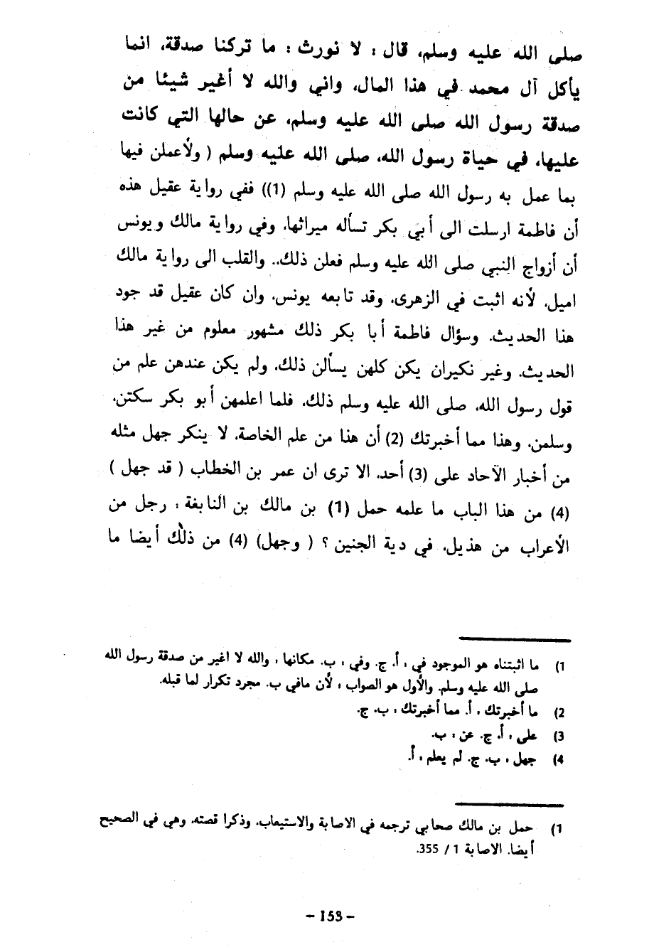 صَلَّى اللَّهُ عَلَيْهِ وَسَلَّمَ قَالَ لَا نُورَثُ ما تركنا صدقة إنما يأكل آل محمد فِي هَذَا الْمَالِ وَإِنِّي وَاللَّهِ لَا أُغَيِّرُ شَيْئًا مِنْ صَدَقَةِ رَسُولِ اللَّهِ صَلَّى اللَّهُ عَلَيْهِ وَسَلَّمَ عَنْ حَالِهَا الَّتِي كَانَتْ عَلَيْهَا فِي حَيَاةَ رَسُولِ اللَّهِ صَلَّى اللَّهُ عَلَيْهِ وَسَلَّمَ (وَلَأَعْمَلَنَّ فِيهَا بِمَا عَمِلَ بِهِ رَسُولُ اللَّهِ صَلَّى اللَّهُ عَلَيْهِ وَسَلَّمَ) فَفِي رِوَايَةِ عَقِيلٍ هَذِهِ أَنَّ فَاطِمَةَ أَرْسَلَتْ إِلَى أَبِي بَكْرٍ تَسْأَلُهُ مِيرَاثَهَا وَفِي رِوَايَةِ مَالِكٍ وَيُونُسَ إن أزواج النبي صلى الله عليه وسلم فَعَلْنَ ذَلِكَ وَالْقَلْبُ إِلَى رِوَايَةِ مَالِكٍ أَمِيلُ لِأَنَّهُ أَثْبَتُ فِي الزُّهْرِيِّ وَقَدْ تَابَعَهُ يُونُسُ وَإِنْ كَانَ عَقِيلٌ قَدْ جَوَّدَ هَذَا الْحَدِيثَ وَسُؤَالُ فَاطِمَةَ أَبَا بَكْرٍ ذَلِكَ مَشْهُورٌ مَعْلُومٌ مِنْ غَيْرِ هَذَا الْحَدِيثِ وَغَيْرُ نَكِيرٍ أَنْ يَكُنَّ كُلُّهُنَّ يَسْأَلْنَ ذَلِكَ وَلَمْ يَكُنْ عِنْدَهُنَّ عِلْمٌ مِنْ قَوْلِ رَسُولِ اللَّهِ صَلَّى اللَّهُ عَلَيْهِ وَسَلَّمَ ذَلِكَ فَلَمَّا أَعْلَمَهُنَّ أَبُو بَكْرٍ سَكَتْنَ وَسَلَّمْنَ وَهَذَا مِمَّا أَخْبَرْتُكَ أَنَّ هَذَا مِنْ عِلْمِ الْخَاصَّةِ لَا يُنْكَرُ جَهْلُ مِثْلِهِ مِنْ أَخْبَارِ الْآحَادِ عَلَى أَحَدٍ أَلَا تَرَيْنَ أَنَّ عُمَرَ بْنَ الْخَطَّابِ (قَدْ جَهِلَ) مِنْ هذا الباب ما علمه حمل ابن مَالِكِ بْنِ النَّابِغَةِ رَجُلٌ مِنَ الْأَعْرَابِ مِنْ هذيل في دية الجنين (وَجَهِلَ) مِنْ ذَلِكَ أَيْضًا مَا
