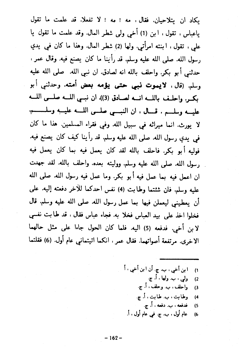 يَكَادُ أَنْ يَتَلَاحَيَانِ فَقَالَ مَهْ مَهْ لَا تَفْعَلَا قَدْ عَلِمْتُ مَا تَقُولُ يَا عَبَّاسُ تَقُولُ ابْنُ أَخِي وَلِي شَطْرُ الْمَالِ وَقَدْ عَلِمْتَ مَا تَقُولُ يَا عَلِيُّ تَقُولُ ابْنَتُهُ امْرَأَتِي وَلَهَا شَطْرُ الْمَالِ وَهَذَا مَا كَانَ فِي يَدَيْ رَسُولِ اللَّهِ صَلَّى اللَّهُ عَلَيْهِ وَسَلَّمَ قَدْ رَأَيْنَا مَا كَانَ يَصْنَعُ فِيهِ وَقَالَ عُمَرُ حَدَّثَنِي أَبُو بَكْرٍ وَأَحْلِفُ بِاللَّهِ إِنَّهُ لَصَادِقٌ أَنَّ نَبِيَّ اللَّهِ صَلَّى اللَّهُ عَلَيْهِ وَسَلَّمَ (قَالَ لَا يَمُوتُ نَبِيٌّ حَتَّى يَؤُمَّهُ بَعْضُ أُمَّتِهِ وَحَدَّثَنِي أَبُو بَكْرٍ وَأَحْلِفُ بِاللَّهِ إِنَّهُ لَصَادِقٌ (3)) أَنَّ نَبِيَّ اللَّهِ صَلَّى اللَّهُ عَلَيْهِ وَسَلَّمَ قَالَ إِنَّ النَّبِيَّ صَلَّى اللَّهُ عَلَيْهِ وَسَلَّمَ لَا يُورَثُ إِنَّمَا مِيرَاثُهُ فِي سَبِيلِ اللَّهِ وَفِي فُقَرَاءِ الْمُسْلِمِينَ هَذَا مَا كَانَ فِي يَدَيْ رَسُولِ اللَّهِ صَلَّى اللَّهُ عَلَيْهِ وَسَلَّمَ قَدْ رَأَيْنَا كَيْفَ كَانَ يَصْنَعُ فِيهِ فَوَلِيَهُ أَبُو بَكْرٍ فَأَحْلِفُ بِاللَّهِ لَقَدْ كَانَ يَعْمَلُ فِيهِ بِمَا كَانَ يَعْمَلُ فِيهِ رَسُولُ اللَّهِ صَلَّى اللَّهُ عَلَيْهِ وَسَلَّمَ وَوَلِيتُهُ بَعْدَهُ وَأَحْلِفُ بِاللَّهِ لَقَدْ جَهَدْتُ أَنْ أَعْمَلَ فِيهِ بِمَا عَمِلَ فِيهِ أَبُو بَكْرٍ وَمَا عَمِلَ فِيهِ رَسُولُ اللَّهِ صَلَّى اللَّهُ عَلَيْهِ وَسَلَّمَ فَإِنْ شِئْتُمَا وَطَابَتْ نَفْسُ أَحَدِكُمَا لِلْآخَرِ دَفَعْتُهُ إِلَيْهِ عَلَى أَنْ يُعْطِيَنِي لِيَعْمَلَنَّ فِيهَا بِمَا عَمِلَ رَسُولُ اللَّهِ صَلَّى اللَّهُ عليه وسلم قال فخلوا أخذ عَلِيٌّ بِيَدِ الْعَبَّاسِ فَخَلَا بِهِ فَجَاءَ عَبَّاسٌ فَقَالَ قَدْ طَابَتْ نَفْسِي لِابْنِ أَخِي فَدَفَعَهُ إِلَيْهِ فَلَمَّا كَانَ الْحَوْلُ جَاءَا عَلَى مِثْلِ حَالِهِمَا الْأُخْرَى مُرْتَفِعَةٌ أَصْوَاتُهُمَا فَقَالَ عُمَرُ إِنَّكُمَا أَتَيْتُمَانِي عَامَ أَوَّلَ فَقُلْتُمَا