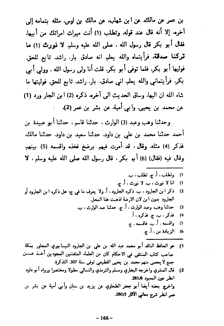 ابن عُمَرَ عَنْ مَالِكٌ عَنِ ابْنِ شِهَابٍ عَنْ مَالِكِ بْنِ أَوْسٍ مِثْلَهُ بِتَمَامِهِ إِلَى آخِرِهِ إِلَّا أَنَّهُ قَالَ عِنْدَ قَوْلِهِ وَتَطْلُبُ أَنْتَ مِيرَاثَ امْرَأَتِكَ مِنْ أَبِيهَا فَقَالَ أَبُو بَكْرٍ قَالَ رَسُولُ اللَّهِ صَلَّى اللَّهُ عَلَيْهِ وَسَلَّمَ لَا نُورَثُ مَا تَرَكْنَا صَدَقَةٌ فَرَأَيْتُمَاهُ وَاللَّهُ يَعْلَمُ أَنَّهُ صَادِقٌ بَارٌّ رَاشِدٌ تَابِعٌ لِلْحَقِّ فَوَلِيَهَا أَبُو بَكْرٍ فَلَمَّا تُوُفِّيَ أَبُو بَكْرٍ قُلْتُ أَنَا وَلِيُّ رَسُولِ اللَّهِ وَوَلِيُّ أَبِي بَكْرٍ فَرَأَيْتُمَانِي وَاللَّهُ يَعْلَمُ أَنِّي صَادِقٌ بَارٌّ رَاشِدٌ تَابِعٌ لِلْحَقِّ فَوَلِيتُهَا مَا شَاءَ اللَّهُ أَنْ أَلِيَهَا وَسَاقَ الْحَدِيثَ إِلَى آخِرِهِ ذَكَرُهُ ابْنُ الْجَارُورِدِ! عَنْ مُحَمَّدِ بْنِ يَحْيَى وَأَبِي أُمَيَّةَ عَنْ بِشْرِ بْنِ عُمَرَ وَحَدَّثَنَا وَهْبٌ وَعَبْدُ الْوَارِثِ حَدَّثَنَا قَاسِمٌ حَدَّثَنَا أَبُو عُبَيْدَةَ بْنُ أَحْمَدَ حَدَّثَنَا مُحَمَّدُ بْنُ عَلِيِّ بْنِ دَاوُدَ حَدَّثَنَا سَعِيدُ بْنُ دَاوُدَ حَدَّثَنَا مَالِكٌ فَذَكَرَ مِثْلَهُ وَقَالَ قَدْ أَمَرْتُ فِيهِمْ بِرَضْخِ فَخْذِهِ وَاقْسِمْهُ بَيْنَهُمْ وَقَالَ فِيهِ (فَقَالَ) أَبُو بَكْرٍ قَالَ رَسُولُ اللَّهِ صَلَّى اللَّهُ عَلَيْهِ وَسَلَّمَ لا