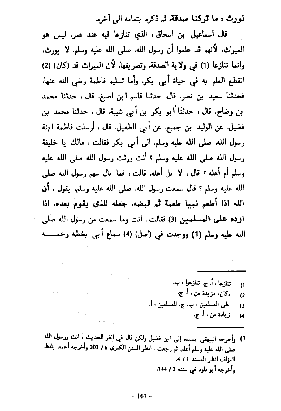 نُورَثُ مَا تَرَكْنَا صَدَقَةٌ ثُمَّ ذَكَرَهُ بِتَمَامِهِ إِلَى آخِرِهِ قَالَ إِسْمَاعِيلُ بْنُ إِسْحَاقَ الَّذِي تَنَازَعَا فِيهِ عِنْدَ عُمَرَ لَيْسَ هُوَ الْمِيرَاثُ لِأَنَّهُمْ قَدْ عَلِمُوا أَنَّ رَسُولَ اللَّهِ صَلَّى اللَّهُ عَلَيْهِ وَسَلَّمَ لَا يُورَثُ وَإِنَّمَا تَنَازَعَا فِي وِلَايَةِ الصَّدَقَةِ وَتَصْرِيفِهَا لِأَنَّ الْمِيرَاثَ قَدْ (كَانَ) انْقَطَعَ الْعِلْمُ بِهِ فِي حَيَاةِ أَبِي بَكْرٍ وَأَمَّا تَسْلِيمُ فَاطِمَةَ رَضِيَ اللَّهُ عَنْهَا فَحَدَّثَنَا سَعِيدُ بْنُ نَصْرٍ قَالَ حَدَّثَنَا قَاسِمُ بْنُ أَصْبَغَ قَالَ حَدَّثَنَا مُحَمَّدُ بْنُ وَضَّاحٍ قَالَ حَدَّثَنَا أَبُو بَكْرِ بْنُ أَبِي شَيْبَةَ قَالَ حَدَّثَنَا مُحَمَّدُ بْنُ فُضَيْلٍ عَنِ الْوَلِيدِ بْنِ جُمَيْعٍ عَنْ أَبِي الطُّفَيْلِ قَالَ أَرْسَلَتْ فَاطِمَةُ ابْنَةُ رَسُولُ اللَّهِ صَلَّى اللَّهُ عَلَيْهِ وَسَلَّمَ إِلَى أبي بكر فقالت مالك يَا خَلِيفَةَ رَسُولُ اللَّهِ صَلَّى اللَّهُ عَلَيْهِ وَسَلَّمَ أَنْتِ وَرِثْتَ رَسُولَ اللَّهِ صَلَّى اللَّهُ عَلَيْهِ وَسَلَّمَ أَمْ أَهْلُهُ قَالَ لَا بَلْ أَهْلُهُ قَالَتْ فَمَا بَالُ سَهْمِ رَسُولِ اللَّهِ صَلَّى اللَّهُ عَلَيْهِ وَسَلَّمَ قَالَ سَمِعْتُ رَسُولَ اللَّهِ صَلَّى اللَّهُ عَلَيْهِ وَسَلَّمَ يَقُولُ إُنَّ اللَّهَ إِذَا أَطْعَمَ نَبِيًّا طُعْمَةً ثُمَّ قَبَضَهُ جَعَلَهُ لِلَّذِي يَقُومُ بَعْدَهُ أَنَا أَرُدُّهُ عَلَى الْمُسْلِمِينَ فَقَالَتْ أَنْتَ وَمَا سَمِعْتُ مِنْ رَسُولِ اللَّهِ صَلَّى اللَّهُ عَلَيْهِ وَسَلَّمَ وَوَجَدْتُ فِي (أَصْلِ) سَمَاعِ أَبِي بِخَطِّهِ رَحِمَهُ