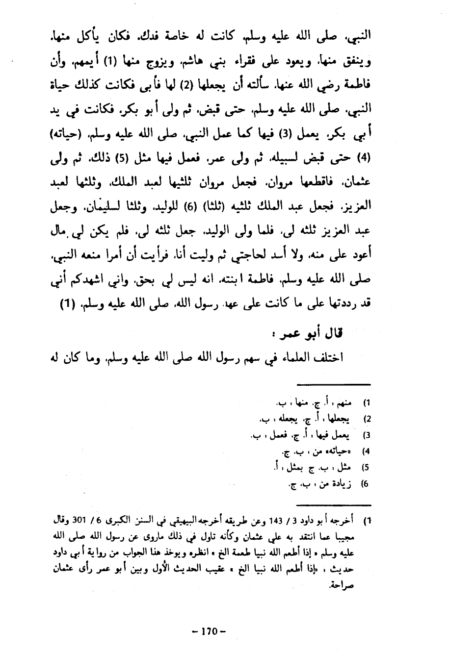 النَّبِيَّ صَلَّى اللَّهُ عَلَيْهِ وَسَلَّمَ كَانَتْ لَهُ خَاصَّةَ فَدَكٍ فَكَانَ يَأْكُلُ مِنْهَا وَيُنْفِقُ مِنْهَا وَيَعُودُ عَلَى فُقَرَاءِ بَنِي هَاشِمٍ وَيُزَوِّجُ مِنْهَا أَيِّمَهُمْ وَإِنَّ فَاطِمَةَ رَضِيَ اللَّهُ عَنْهَا سَأَلَتْهُ أَنْ يَجْعَلَهَا لَهَا فَأَبَى فَكَانَتْ كَذَلِكَ حَيَاةَ النَّبِيِّ صَلَّى اللَّهُ عَلَيْهِ وَسَلَّمَ حَتَّى قُبِضَ ثُمَّ وَلِيَ أَبُو بَكْرٍ فَكَانَتْ فِي يَدِ أَبِي بَكْرٍ يَعْمَلُ فِيهَا كَمَا عَمِلَ النَّبِيُّ صَلَّى اللَّهُ عَلَيْهِ وَسَلَّمَ (حَيَاتَهُ) حَتَّى قُبِضَ لِسَبِيلِهِ ثُمَّ وَلِيَ عُمَرُ فَعَمِلَ فِيهَا مِثْلَ ذَلِكَ ثُمَّ وَلِيَ عُثْمَانُ فَأَقْطَعَهَا مَرْوَانَ فَجَعَلَ مَرْوَانُ ثُلُثَيْهَا لِعَبْدِ الْمَلِكِ وَثُلُثَهَا لِعَبْدِ الْعَزِيزِ فَجَعَلَ عَبْدُ الْمَلِكِ ثُلُثَيْهِ (ثُلُثًا) لِلْوَلِيدِ وَثُلُثًا لِسُلَيْمَانَ وَجَعَلَ عَبْدُ الْعَزِيزِ ثُلُثَهُ لِي فَلَمَّا وَلِيَ الْوَلِيدُ جَعَلَ ثُلُثَهُ لِي فَلَمْ يَكُنْ لِي مَالٌ أَعْوَدَ عَلَيَّ مِنْهُ وَلَا أَسَدَّ لِحَاجَاتِي ثُمَّ وَلِيتُ أَنَا فَرَأَيْتُ أَنَّ أَمْرًا مَنَعَهُ النَّبِيُّ صَلَّى اللَّهُ عَلَيْهِ وَسَلَّمَ فَاطِمَةَ ابْنَتَهُ أَنَّهُ لَيْسَ لِي بِحَقٍّ وَإِنِّي أُشْهِدُكُمْ أَنِّي قَدْ رَدَدْتُهَا عَلَى مَا كَانَتْ عَلَى عَهْدِ رَسُولِ اللَّهِ صَلَّى اللَّهُ عَلَيْهِ وَسَلَّمَ - قَالَ أَبُو عُمَرَ اخْتَلَفَ الْعُلَمَاءُ فِي سَهْمِ رَسُولِ اللَّهِ صَلَّى اللَّهُ عَلَيْهِ وَسَلَّمَ وَمَا كان له