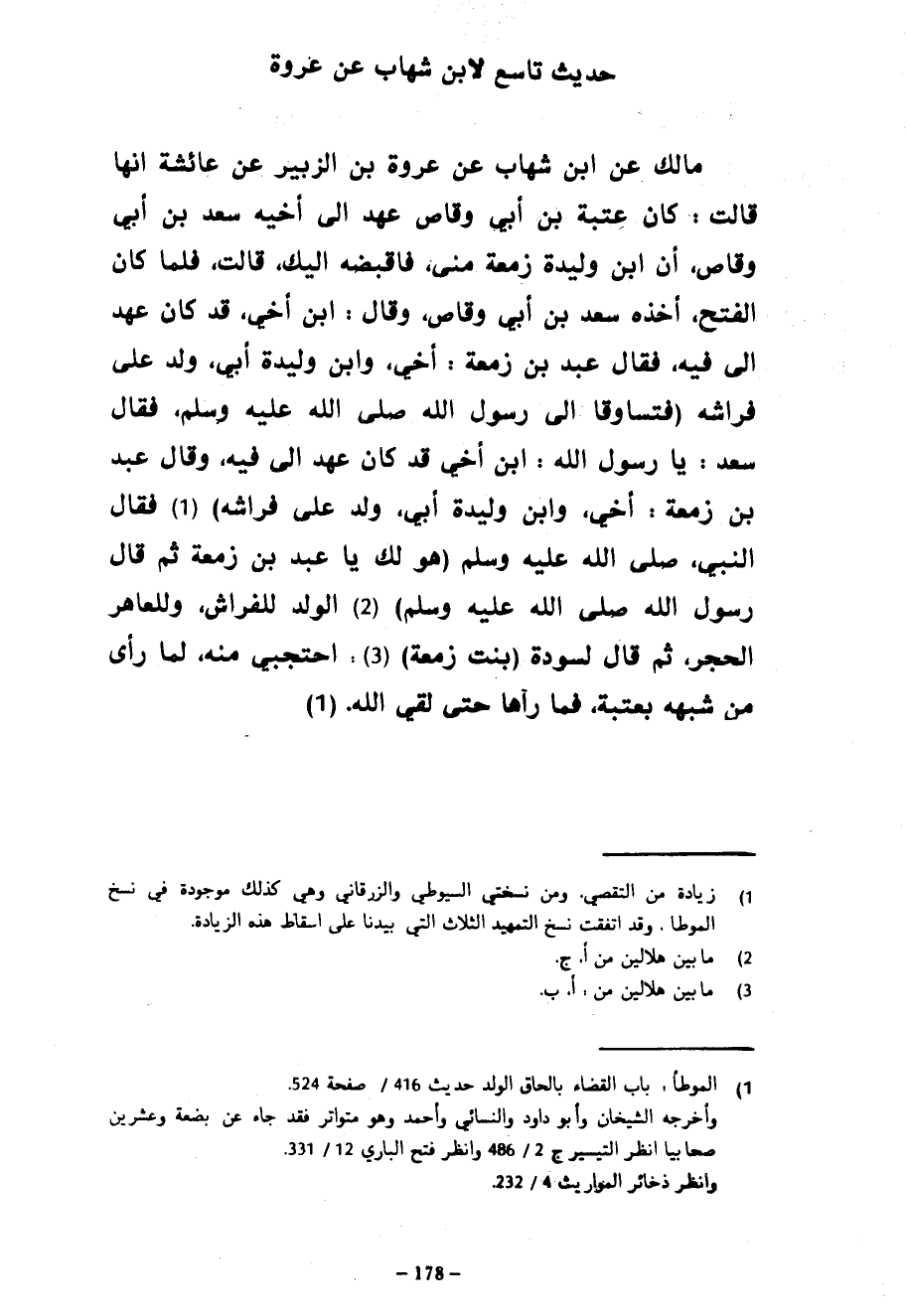 حَدِيثٌ تَاسِعٌ لِابْنِ شِهَابٍ عَنْ عُرْوَةَ مَالِكٌ عَنِ ابْنِ شِهَابٍ عَنْ عُرْوَةَ بْنِ الزُّبَيْرِ عَنْ عَائِشَةَ أَنَّهَا قَالَتْ كَانَ عُتْبَةُ بْنُ أَبِي وَقَّاصٍ عَهِدَ إِلَى أَخِيهِ سَعْدِ بْنِ أَبِي وَقَّاصٍ أَنَّ ابْنَ وَلِيدَةِ زَمْعَةَ مِنِّي فَاقْبِضْهُ إِلَيْكَ قَالَتْ فَلَمَّا كَانَ الْفَتْحُ أَخَذَهُ سَعْدُ بْنُ أَبِي وَقَّاصٍ وَقَالَ ابْنُ أَخِي قَدْ كَانَ عَهِدَ إِلَيَّ فِيهِ فَقَالَ عَبْدُ بن زمعة أخي وابن وليدة أبي ولد عَلَى فِرَاشِهِ (فَتُسَاوَقَا إِلَى رَسُولِ اللَّهِ صَلَّى اللَّهُ عَلَيْهِ وَسَلَّمَ فَقَالَ سَعْدٌ يَا رَسُولَ اللَّهِ ابْنُ أَخِي قَدْ كَانَ عَهِدَ إِلَيَّ فِيهِ وَقَالَ عَبْدُ بْنُ زَمْعَةَ أَخِي وَابْنُ وَلِيدَةِ أَبِي وُلِدَ عَلَى فِرَاشِهِ) فَقَالَ النَّبِيُّ صَلَّى اللَّهُ عَلَيْهِ وَسَلَّمَ هُوَ لَكَ يَا عَبْدَ بْنَ زَمْعَةَ ثُمَّ قَالَ رَسُولُ اللَّهِ صَلَّى اللَّهُ عَلَيْهِ وَسَلَّمَ الْوَلَدُ لِلْفِرَاشِ وَلِلْعَاهِرِ الْحَجَرُ ثُمَّ قَالَ لِسَوْدَةَ (بِنْتِ زَمْعَةَ) احْتَجِبِي مِنْهُ لَمَّا رَأَى مِنْ شَبَهِهِ بِعُتْبَةَ فَمَا رَآهَا حَتَّى لَقِيَ اللَّهَ