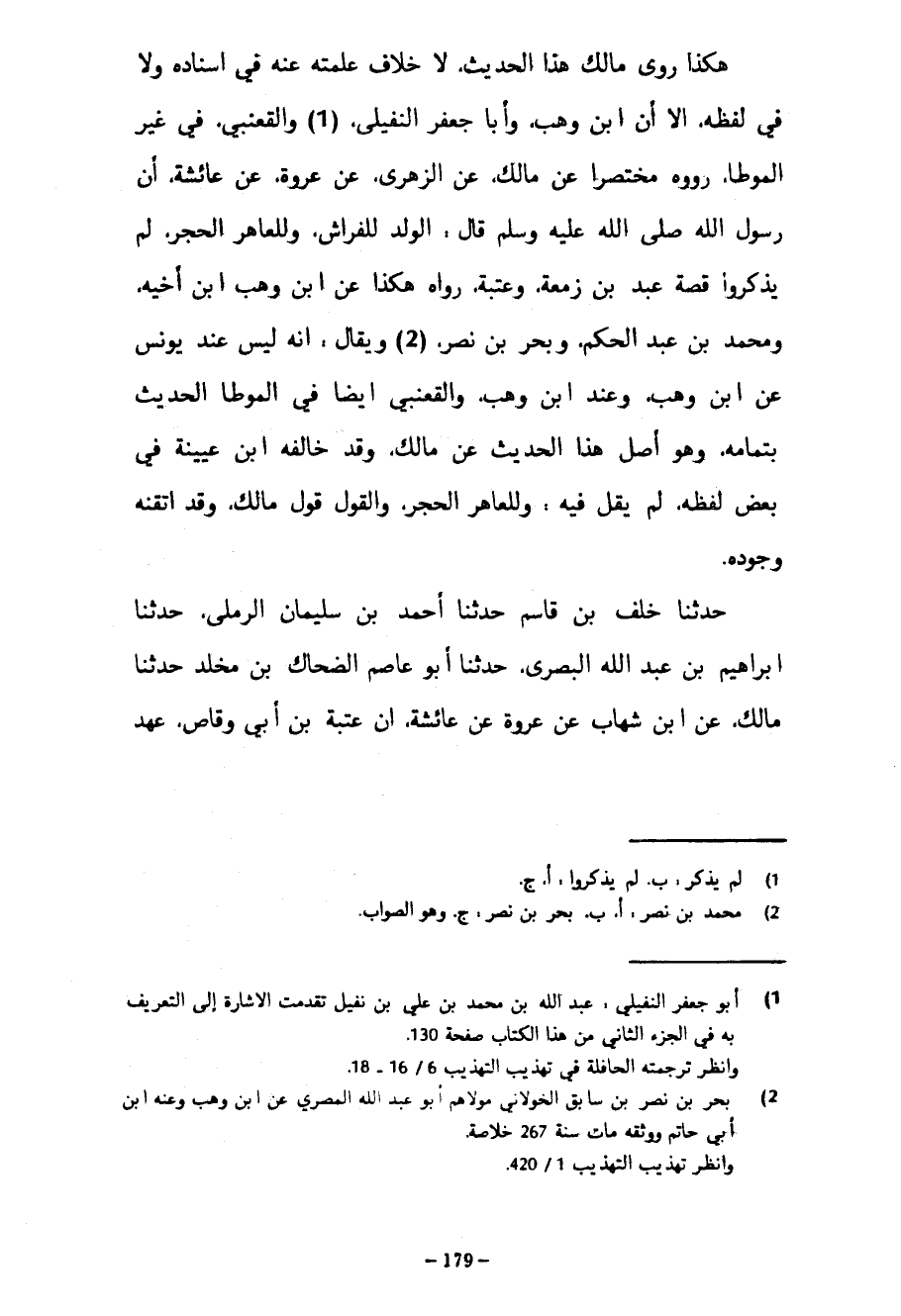هَكَذَا رَوَى مَالِكٌ هَذَا الْحَدِيثَ لَا خِلَافَ عَلِمْتُهُ عَنْهُ فِي إِسْنَادِهِ وَلَا فِي لَفْظِهِ إِلَّا أَنَّ ابْنَ وَهْبٍ وَأَبَا جَعْفَرٍ النُّفَيْلِيَّ وَالْقَعْنَبِيَّ فِي غَيْرِ الْمُوَطَّأِ رَوَوْهُ مُخْتَصَرًا عَنْ مَالِكٍ عَنِ الزُّهْرِيِّ عَنْ عُرْوَةَ عَنْ عَائِشَةَ أَنَّ رَسُولَ اللَّهِ صَلَّى اللَّهُ عَلَيْهِ وسلم قَالَ الْوَلَدُ لِلْفِرَاشِ وَلِلْعَاهِرِ الْحَجَرُ لَمْ يَذْكُرُوا قِصَّةَ عَبْدِ بْنِ زَمْعَةَ وَعُتْبَةَ رَوَاهُ هَكَذَا عَنِ ابْنِ وَهْبٍ ابْنُ أَخِيهِ وَمُحَمَّدُ بْنُ عَبْدِ الْحَكَمِ وَبَحْرُ بْنُ نَصْرٍ وَيُقَالُ إِنَّهُ لَيْسَ عِنْدَ يُونُسَ عَنِ ابْنِ وَهْبٍ وَعِنْدَ ابْنِ وَهْبٍ وَالْقَعْنَبِيِّ أَيْضًا فِي الْمُوَطَّأِ الْحَدِيثُ بِتَمَامِهِ وَهُوَ أَصْلُ هَذَا الْحَدِيثِ عَنْ مَالِكٍ وَقَدْ خَالَفَهُ ابْنُ عُيَيْنَةَ فِي بَعْضِ لَفْظِهِ لَمْ يَقُلْ فِيهِ وَلِلْعَاهِرِ الْحَجَرُ وَالْقَوْلُ قَوْلُ مَالِكٍ وَقَدْ أَتْقَنَهُ وَجَوَّدَهُ حَدَّثَنَا خَلَفُ بْنُ قَاسِمٍ حَدَّثَنَا أَحْمَدُ بْنُ سُلَيْمَانَ الرَّمْلِيُّ حَدَّثَنَا إِبْرَاهِيمُ بْنُ عَبْدِ اللَّهِ الْبَصْرِيُّ حَدَّثَنَا أَبُو عَاصِمٍ الضَّحَّاكُ بْنُ مَخْلَدٍ حَدَّثَنَا مَالِكٌ عَنِ ابْنِ شِهَابٍ عَنْ عُرْوَةَ عَنْ عَائِشَةَ أَنَّ عتبة بن أبي وقاص عهد