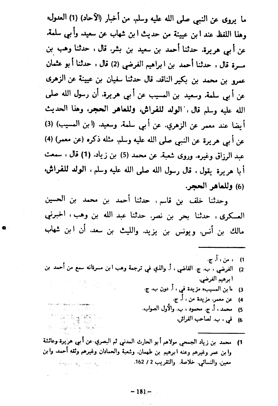 مَا يُرْوَى عَنِ النَّبِيِّ صَلَّى اللَّهُ عَلَيْهِ وَسَلَّمَ مِنْ أَخْبَارِ (الْآحَادِ) الْعُدُولِ وَهَذَا اللَّفْظُ عِنْدَ ابْنِ عُيَيْنَةَ مِنْ حَدِيثِ ابْنِ شِهَابٍ عَنْ سَعِيدٍ وَأَبِي سَلَمَةَ عَنْ أَبِي هُرَيْرَةَ حَدَّثَنَا أَحْمَدُ بْنُ سَعِيدِ بْنِ بِشْرٍ قَالَ حَدَّثَنَا وَهْبُ بْنُ مَسَرَّةَ قَالَ حَدَّثَنَا أَحْمَدُ بْنُ إِبْرَاهِيمَ الْفَرْضِيُّ قَالَ حَدَّثَنَا أَبُو عُثْمَانَ عَمْرُو بْنُ مُحَمَّدِ بْنِ بُكَيْرٍ النَّاقِدُ قَالَ حَدَّثَنَا سُفْيَانُ بْنُ عُيَيْنَةَ عَنِ الزُّهْرِيِّ عَنْ أَبِي سَلَمَةَ وَسَعِيدِ بْنِ الْمُسَيَّبِ عَنْ أَبِي هُرَيْرَةَ أَنَّ رَسُولَ اللَّهِ صَلَّى اللَّهُ عَلَيْهِ وَسَلَّمَ قَالَ الْوَلَدُ لِلْفِرَاشِ وَلِلْعَاهِرِ الْحَجَرُ وَهَذَا الْحَدِيثُ أَيْضًا عِنْدَ مَعْمَرٍ عَنِ الزُّهْرِيِّ عَنْ أَبِي سَلَمَةَ وَسَعِيدٍ (ابْنِ الْمُسَيَّبِ) عَنْ أَبِي هُرَيْرَةَ عَنِ النَّبِيِّ صَلَّى اللَّهُ عَلَيْهِ وَسَلَّمَ مِثْلَهُ ذَكَرَهُ (عَنْ مَعْمَرٍ) عَبْدُ الرَّزَّاقِ وَغَيْرُهُ وَرَوَى شُعْبَةُ عَنْ مُحَمَّدِ بْنِ زِيَادٍ قَالَ سَمِعْتُ أَبَا هُرَيْرَةَ يَقُولُ قَالَ رَسُولُ اللَّهِ صَلَّى اللَّهُ عَلَيْهِ وَسَلَّمَ الْوَلَدُ لِلْفِرَاشِ وَلِلْعَاهِرِ الْحَجَرُ وَحَدَّثَنَا خَلَفُ بْنُ قَاسِمٍ حَدَّثَنَا أَحْمَدُ بْنُ مُحَمَّدِ بْنِ الْحُسَيْنِ الْعَسْكَرِيُّ حَدَّثَنَا بَحْرُ بْنُ نَصْرٍ حَدَّثَنَا عَبْدُ اللَّهِ بْنُ وَهْبٍ أَخْبَرَنِي مَالِكُ بْنُ أَنَسٍ ويونس بن يزيد والليث بْنِ سَعْدٍ أَنَّ ابْنَ شِهَابٍ