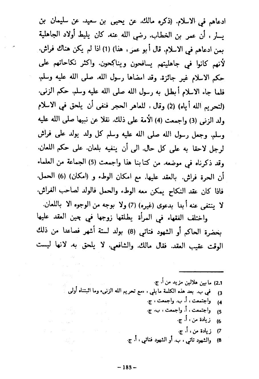 ادَّعَاهُمْ فِي الْإِسْلَامِ (ذَكَرَهُ مَالِكٌ عَنْ يَحْيَى بْنِ سَعِيدٍ عَنْ سُلَيْمَانَ بْنِ يَسَارٍ أَنَّ عُمَرَ بْنَ الْخَطَّابِ رَضِيَ اللَّهُ عَنْهُ كَانَ يُلِيطُ أَوْلَادَ الْجَاهِلِيَّةِ بِمَنِ ادَّعَاهُمْ فِي الْإِسْلَامِ - قَالَ أَبُو عُمَرَ هَذَا) إِذَا لَمْ يَكُنْ هناك فراش لأنهم كانوا في جاهلتهم يُسَافِحُونَ وَيُنَاكِحُونَ وَأَكْثَرُ نِكَاحَاتِهِمْ عَلَى حُكْمِ الْإِسْلَامِ غَيْرُ جَائِزَةٍ وَقَدْ أَمْضَاهَا رَسُولُ اللَّهِ صَلَّى اللَّهُ عَلَيْهِ وَسَلَّمَ فَلَمَّا جَاءَ الْإِسْلَامُ أَبْطَلَ بِهِ رَسُولُ اللَّهِ صَلَّى اللَّهُ عَلَيْهِ وَسَلَّمَ حكم الزنى (لِتَحْرِيمِ اللَّهِ إِيَّاهُ) وَقَالَ لِلْعَاهِرِ الْحَجَرُ فَنَفَى أن يلحق في الإسلام ولد الزنى وَأَجْمَعَتِ الْأُمَّةُ عَلَى ذَلِكَ نَقْلًا عَنْ نَبِيِّهَا صَلَّى اللَّهُ عَلَيْهِ وَسَلَّمَ وَجَعَلَ رَسُولُ اللَّهِ صَلَّى اللَّهُ عَلَيْهِ وَسَلَّمَ كُلُّ وَلَدٍ يُولَدُ عَلَى فِرَاشٍ لِرَجُلٍ لَاحِقًا بِهِ عَلَى كُلِّ حَالٍ إِلَى أَنْ يَنْفِيَهُ بِلِعَانٍ عَلَى حُكْمِ اللِّعَانِ وَقَدْ ذَكَرْنَاهُ فِي مَوْضِعِهِ مِنْ كِتَابِنَا هَذَا وَأَجْمَعَتِ الْجَمَاعَةُ مِنَ الْعُلَمَاءِ أَنَّ الْحُرَّةَ فِرَاشٌ بِالْعَقْدِ عَلَيْهَا مَعَ إِمْكَانِ الْوَطْءِ (وَإِمْكَانِ) الْحَمْلِ فَإِذَا كَانَ عَقْدُ النِّكَاحِ يُمْكِنُ مَعَهُ الْوَطْءُ وَالْحَمْلُ فَالْوَلَدُ لِصَاحِبِ الْفِرَاشِ لَا يَنْتَفِي عَنْهُ أَبَدًا بِدَعْوَى (غَيْرِهِ) وَلَا بِوَجْهٍ مِنَ الْوُجُوهِ إِلَّا بِاللِّعَانِ وَاخْتَلَفَ الْفُقَهَاءُ فِي الْمَرْأَةِ يُطَلِّقُهَا زَوْجُهَا فِي حِينِ الْعَقْدِ عَلَيْهَا بِحَضْرَةِ الْحَاكِمِ أَوِ الشُّهُودِ فَتَأْتِي بِوَلَدٍ لِسِتَّةِ أَشْهُرٍ فصاعد مِنْ ذَلِكَ الْوَقْتِ عَقِيبَ الْعَقْدِ فَقَالَ مَالِكٌ وَالشَّافِعِيُّ لَا يَلْحَقُ بِهِ لِأَنَّهَا لَيْسَتْ
