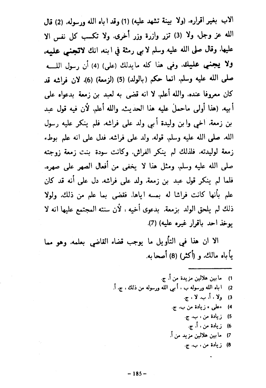 الْأَبِ بِغَيْرِ إِقْرَارِهِ (وَلَا بَيِّنَةٍ تَشْهَدُ عَلَيْهِ) وَقَدْ أَبَاهُ اللَّهُ وَرَسُولُهُ قَالَ اللَّهُ عَزَّ وَجَلَّ وَلَا تَزِرُ وَازِرَةٌ وِزْرَ أُخْرَى وَلَا تَكْسِبُ كُلُّ نَفْسٍ إِلَّا عَلَيْهَا وَقَالَ صَلَّى اللَّهُ عَلَيْهِ وَسَلَّمَ لِأَبِي رِمْثَةَ فِي ابْنِهِ إِنَّكَ لَا تَجْنِي عَلَيْهِ وَلَا يَجْنِي عَلَيْكَ وَفِي هَذَا كُلِّهِ مَا يَدُلُّكَ (عَلَى) أَنَّ رَسُولَ اللَّهِ صَلَّى اللَّهُ عَلَيْهِ وسلم إنما حَكَمَ (بِالْوَلَدِ) (لِزَمْعَةَ) لِأَنَّ فِرَاشَهُ قَدْ كَانَ مَعْرُوفًا عِنْدَهُ وَاللَّهُ أَعْلَمُ لَا أَنَّهُ قَضَى بِهِ لِعَبْدِ بْنِ زَمْعَةَ بِدَعْوَاهُ عَلَى أَبِيهِ (هَذَا أَوْلَى مَا حُمِلَ عَلَيْهِ هَذَا الْحَدِيثُ وَاللَّهُ أَعْلَمُ لِأَنَّ فِيهِ قَوْلَ عَبْدِ بْنِ زمعة أخي وابن وليدة أبي ولد على فِرَاشِهِ فَلَمْ يُنْكِرْ عَلَيْهِ رَسُولُ اللَّهِ صَلَّى اللَّهُ عَلَيْهِ وَسَلَّمَ قَوْلَهُ وُلِدَ عَلَى فِرَاشِهِ فَدَلَّ عَلَى أَنَّهُ عَلِمَ بِوَطْءِ زَمْعَةَ لِوَلِيدَتِهِ فَلِذَلِكَ لَمْ يُنْكِرِ الْفِرَاشَ وَكَانَتْ سَوْدَةُ بِنْتُ زَمْعَةَ زَوْجَتَهُ صَلَّى اللَّهُ عَلَيْهِ وَسَلَّمَ وَمِثْلُ هَذَا لَا يَخْفَى مِنْ أَفْعَالِ الصِّهْرِ عَلَى صِهْرِهِ فَلَمَّا لَمَّ يُنْكِرْ قَوْلَ عَبْدِ بْنِ زَمْعَةَ وُلِدَ عَلَى فِرَاشِهِ دَلَّ عَلَى أَنَّهُ قَدْ كَانَ عَلِمَ بِأَنَّهَا كَانَتْ فِرَاشًا لَهُ بِمَسِّهِ إِيَّاهَا فَقَضَى بِمَا عَلِمَ مِنْ ذَلِكَ وَلَوْلَا ذَلِكَ لَمْ يُلْحِقِ الْوَلَدَ بِزَمْعَةَ بِدَعْوَى أَخِيهِ لِأَنَّ سُنَّتَهُ الْمُجْتَمَعَ عَلَيْهَا أَنَّهُ لَا يُؤْخَذُ أَحَدٌ بِإِقْرَارِ غَيْرِهِ عَلَيْهِ) إِلَّا أَنَّ هَذَا فِي التَّأْوِيلِ مَا يُوجِبُ قَضَاءَ الْقَاضِي بِعِلْمِهِ وَهُوَ مِمَّا يَأْبَاهُ مَالِكٌ (وَأَكْثَرُ) أَصْحَابِهِ