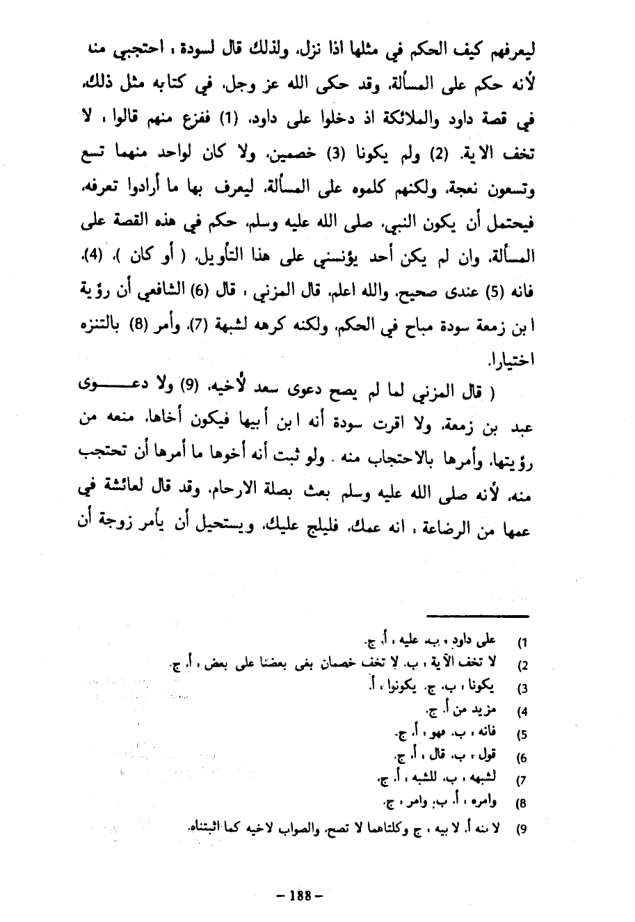 لِيُعَرِّفَهُمْ كَيْفَ الْحُكْمُ فِي مِثْلِهَا إِذَا نَزَلَ وَلِذَلِكَ قَالَ لِسَوْدَةَ احْتَجِبِي مِنْهُ لِأَنَّهُ حُكْمٌ عَلَى الْمَسْأَلَةِ وَقَدْ حَكَى اللَّهُ عَزَّ وَجَلَّ فِي كِتَابِهِ مِثْلَ ذَلِكَ فِي قِصَّةِ دَاوُدَ وَالْمَلَائِكَةِ إِذْ دَخَلُوا عَلَى دَاوُدَ فَفَزِعَ مِنْهُمْ قَالُوا لَا تَخَفْ الْآيَةَ وَلَمْ يَكُونَا خَصْمَيْنِ وَلَا كَانَ لِوَاحِدٍ مِنْهُمَا تِسْعٌ وَتِسْعُونَ نَعْجَةً وَلَكِنَّهُمْ كَلَّمُوهُ عَلَى الْمَسْأَلَةِ لِيَعْرِفَ بِهَا مَا أردوا تعرفه فَيُحْتَمَلُ أَنْ يَكُونَ النَّبِيُّ صَلَّى اللَّهُ عَلَيْهِ وَسَلَّمَ حَكَمَ فِي هَذِهِ الْقِصَّةِ عَلَى الْمَسْأَلَةِ وَإِنْ لَمْ يَكُنْ أَحَدٌ يُؤْنِسُنِي عَلَى هَذَا التَّأْوِيلِ (أَوْ كَانَ) فَإِنَّهُ عِنْدِي صَحِيحٌ وَاللَّهُ أَعْلَمُ قَالَ الْمُزَنِيُّ قَالَ الشَّافِعِيُّ إِنَّ رُؤْيَةَ ابْنِ زَمْعَةَ سَوْدَةَ مُبَاحٌ فِي الْحُكْمِ وَلَكِنَّهُ كَرِهَهُ لِشُبْهَةٍ وَأَمَرَ بِالتَّنَزُّهِ اخْتِيَارًا (قَالَ الْمُزَنِيُّ لما لم يصح دَعْوَى سَعْدٍ لِأَخِيهِ (9) وَلَا دَعْوَى عَبْدِ بْنِ زَمْعَةَ وَلَا أَقَرَّتْ سَوْدَةُ أَنَّهُ ابْنُ أَبِيهَا فَيَكُونُ أَخَاهَا مَنَعَهُ مِنْ رُؤْيَتِهَا وَأَمَرَهَا بِالِاحْتِجَابِ مِنْهُ وَلَوْ ثَبَتَ أَنَّهُ أَخُوهَا مَا أَمَرَهَا أَنْ تَحْتَجِبَ مِنْهُ لِأَنَّهُ صَلَّى اللَّهُ عَلَيْهِ وَسَلَّمَ بُعِثَ بِصِلَةِ الْأَرْحَامِ وَقَدْ قَالَ لِعَائِشَةَ فِي عَمِّهَا مِنَ الرَّضَاعَةِ إِنَّهُ عَمُّكِ فَلْيَلِجْ عَلَيْكِ وَيَسْتَحِيلُ أَنْ يَأْمُرَ زَوْجَهُ أَنْ