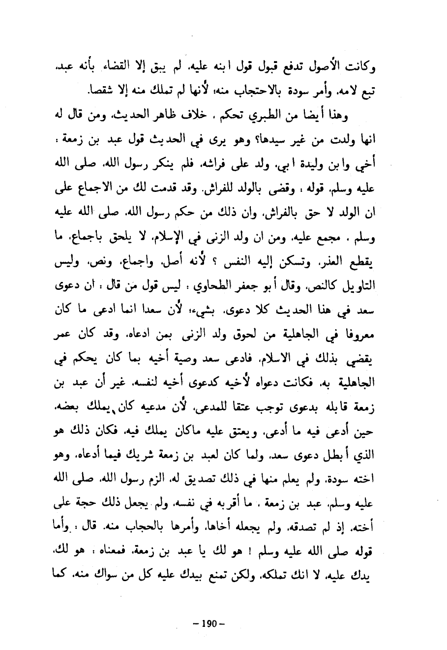 وَكَانَتِ الْأُصُولُ تَدْفَعُ قَبُولَ قَوْلِ ابْنِهِ عَلَيْهِ لَمْ يَبْقَ إِلَّا الْقَضَاءُ بِأَنَّهُ عَبْدٌ تَبَعٌ لِأُمِّهِ وَأَمَرَ سَوْدَةَ بِالِاحْتِجَابِ مِنْهُ لِأَنَّهَا لَمْ تَمْلِكْ مِنْهُ إِلَّا شِقْصًا وَهَذَا أَيْضًا مِنَ الطَّبَرَيِّ تَحَكُّمٌ خِلَافَ ظَاهِرِ الْحَدِيثِ وَمَنْ قَالَ لَهُ إِنَّهَا وَلَدَتْ مِنْ غَيْرِ سَيِّدِهَا وَهُوَ يَرَى فِي الْحَدِيثِ قَوْلَ عَبْدِ بْنِ زَمْعَةَ أخي وابن وليدة أبي ولد على فراشه فَلَمْ يُنْكِرْ رَسُولُ اللَّهِ صَلَّى اللَّهُ عَلَيْهِ وَسَلَّمَ قَوْلَهُ وَقَضَى بِالْوَلَدِ لِلْفِرَاشِ وَقَدْ قَدَّمْتُ لَكَ مِنَ الْإِجْمَاعِ عَلَى أَنَّ الْوَلَدَ لَاحِقٌ بِالْفِرَاشِ وَأَنَّ ذَلِكَ مِنْ حُكْمِ رَسُولِ اللَّهِ صَلَّى اللَّهُ عَلَيْهِ وَسَلَّمَ مَجْمَعٌ عَلَيْهِ وَمِنْ أن ولد الزنى في الإسل لَا يَلْحَقُ بِإِجْمَاعِ مَا يَقْطَعُ الْعُذْرَ وَتَسْكُنُ إِلَيْهِ النَّفْسُ لِأَنَّهُ أَصْلٌ وَإِجْمَاعٌ وَنَصٌّ وَلَيْسَ التَّأْوِيلُ كَالنَّصِّ - وَقَالَ أَبُو جَعْفَرٍ الطَّحَاوِيُّ لَيْسَ قَوْلُ مَنْ قَالَ إِنَّ دَعْوَى سَعْدٍ فِي هَذَا الْحَدِيثِ كَالدَّعْوَى بِشَيْءٍ لِأَنَّ سَعْدًا إِنَّمَا ادَّعَى مَا كَانَ مَعْرُوفًا فِي الْجَاهِلِيَّةِ مِنْ لحوق ولد الزنى بِمَنِ ادَّعَاهُ وَقَدْ كَانَ عُمَرُ يَقْضِي بِذَلِكَ فِي الْإِسْلَامِ فَادَّعَى سَعْدٌ وَصِيَّةَ أَخِيهِ بِمَا كَانَ يَحْكُمُ فِي الْجَاهِلِيَّةِ بِهِ فَكَانَتْ دَعْوَاهُ لِأَخِيهِ كَدَعْوَى أَخِيهِ لِنَفْسِهِ غَيْرَ أَنَّ عَبْدَ بْنَ زَمْعَةَ قَابَلَهُ بِدَعْوَى تُوجِبُ عِتْقًا لِلْمُدَّعِي لِأَنَّ مُدَّعِيَهُ كَانَ يَمْلِكُ بَعْضَهُ حِينَ ادَّعَى فِيهِ مَا ادَّعَى وَيَعْتِقُ عَلَيْهِ مَا كَانَ يَمْلِكُ فِيهِ فَكَانَ ذَلِكَ هُوَ الَّذِي أَبْطَلَ دَعْوَى سَعْدٍ وَلَمَّا كَانَ لِعَبْدِ بْنِ زَمْعَةَ شَرِيكٌ فِيمَا ادَّعَاهُ وَهُوَ أُخْتُهُ سَوْدَةُ وَلَمْ يُعْلَمْ مِنْهَا فِي ذَلِكَ تَصْدِيقٌ لَهُ أَلْزَمَ رَسُولُ اللَّهِ صَلَّى اللَّهُ عَلَيْهِ وَسَلَّمَ عَبْدَ بْنَ زَمْعَةَ مَا أَقَرَّ بِهِ فِي نَفْسِهِ وَلَمْ يَجْعَلْ ذَلِكَ حُجَّةً عَلَى أُخْتِهِ إِذْ لَمْ تُصَدِّقْهُ وَلَمْ يَجْعَلْهُ أَخَاهَا وَأَمَرَهَا بِالْحِجَابِ مِنْهُ قَالَ وَأَمَّا قَوْلُهُ صَلَّى اللَّهُ عَلَيْهِ وَسَلَّمَ هُوَ لَكَ يَا عَبْدَ بْنَ زَمْعَةَ فَمَعْنَاهُ هُوَ لَكَ يَدُكَ عَلَيْهِ لَا أَنَّكَ تَمْلِكُهُ وَلَكِنْ تَمْنَعُ بِيَدِكَ عَلَيْهِ كُلَّ مَنْ سِوَاكَ مِنْهُ كَمَا