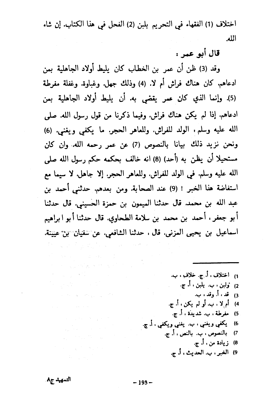 اخْتِلَافَ الْفُقَهَاءِ فِي التَّحْرِيمِ بِلَبَنِ الْفَحْلِ فِي هَذَا الْكِتَابِ إِنْ شَاءَ اللَّهُ - قَالَ أَبُو عُمَرَ وَقَدْ ظَنَّ أَنَّ عُمَرَ بْنَ الْخَطَّابِ كَانَ يُلِيطُ أَوْلَادَ الْجَاهِلِيَّةِ بِمَنِ ادَّعَاهُمْ كَانَ هُنَاكَ فِرَاشٌ أَمْ لَا وَذَلِكَ جَهْلٌ وَغَبَاوَةٌ وَغَفْلَةٌ مُفْرِطَةٌ وَإِنَّمَا الَّذِي كَانَ عُمَرُ يَقْضِي بِهِ أَنْ يُلِيطَ أَوْلَادَ الْجَاهِلِيَّةِ بِمَنِ ادَّعَاهُمْ إِذَا لَمْ يَكُنْ هُنَاكَ فِرَاشٌ وَفِيمَا ذَكَرْنَا مِنْ قَوْلِ رَسُولِ اللَّهِ صَلَّى اللَّهُ عَلَيْهِ وَسَلَّمَ الْوَلَدُ لِلْفِرَاشِ وَلِلْعَاهِرِ الْحَجَرُ مَا يَكْفِي وَيُغْنِي وَنَحْنُ نَزِيدُ ذَلِكَ بَيَانًا بِالنُّصُوصِ عَنْ عُمَرَ رَحِمَهُ اللَّهُ وَإِنْ كَانَ مُسْتَحِيلًا أَنْ يَظُنَّ بِهِ (أَحَدٌ) أَنَّهُ خَالَفَ بِحُكْمِهِ حُكْمَ رَسُولُ اللَّهِ صَلَّى اللَّهُ عَلَيْهِ وَسَلَّمَ في الْوَلَدُ لِلْفِرَاشِ وَلِلْعَاهِرِ الْحَجَرُ إِلَّا جَاهِلٌ لَا سِيَّمَا مَعَ اسْتِفَاضَةِ هَذَا الْخَبَرِ عِنْدَ الصَّحَابَةِ وَمَنْ بَعْدَهُمْ حَدَّثَنِي أَحْمَدُ بْنُ عَبْدِ اللَّهِ بْنِ مُحَمَّدِ قَالَ حَدَّثَنَا الْمَيْمُونُ بْنُ حَمْزَةَ الْحُسَيْنِيُّ قَالَ حَدَّثَنَا أَبُو جَعْفَرٍ أَحْمَدُ بْنُ مُحَمَّدِ بْنِ سَلَامَةَ الطَّحَاوِيُّ قَالَ حَدَّثَنَا أَبُو إِبْرَاهِيمَ إِسْمَاعِيلُ بْنُ يَحْيَى الْمُزَنِيُّ قَالَ حَدَّثَنَا الشَّافِعِيُّ عَنْ سُفْيَانَ بْنِ عُيَيْنَةَ