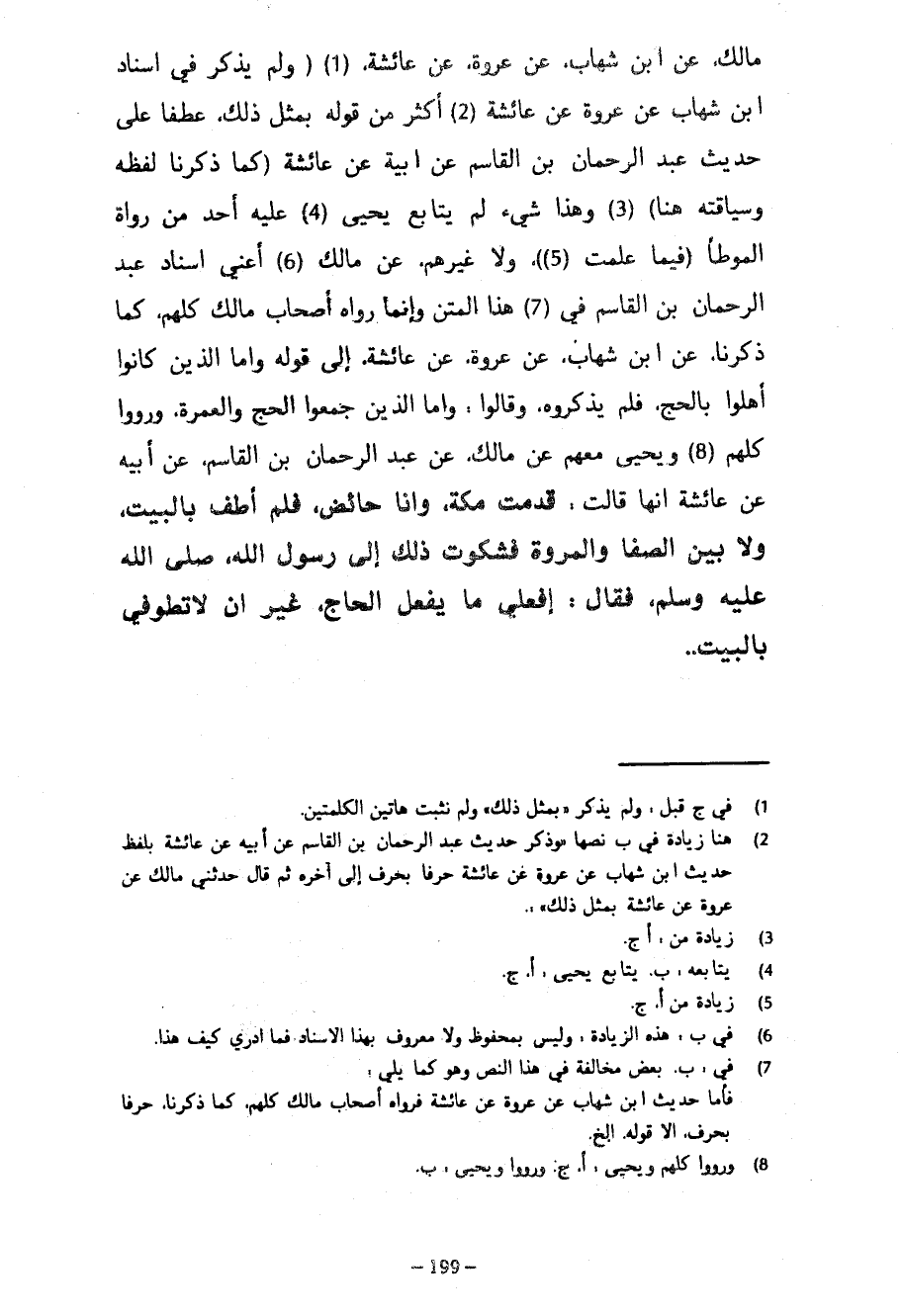 مَالِكٌ عَنِ ابْنِ شِهَابٍ عَنْ عُرْوَةَ عَنْ عَائِشَةَ (وَلَمْ يَذْكُرْ فِي إِسْنَادِ ابْنِ شِهَابٍ عَنْ عُرْوَةَ عَنْ عَائِشَةَ أَكْثَرَ مِنْ قَوْلِهِ بِمِثْلِ ذَلِكَ عَطْفًا عَلَى حَدِيثِ عَبْدِ الرَّحْمَنِ بْنِ الْقَاسِمِ عَنْ أَبِيهِ عَنْ عَائِشَةَ (كَمَا ذَكَرْنَا لَفْظَهُ وَسِيَاقَتَهُ هُنَا) وَهَذَا شَيْءٌ لَمْ يُتَابِعْ يَحْيَى عَلَيْهِ أَحَدٌ مِنْ رُوَاةِ الْمُوَطَّأِ (فِيمَا عَلِمْتُ (5)) وَلَا غَيْرِهِمْ عَنْ مَالِكٍ أَعْنِي إِسْنَادَ عَبْدِ الرَّحْمَنِ بْنِ الْقَاسِمِ فِي هَذَا الْمَتْنِ وَإِنَّمَا رَوَاهُ أَصْحَابُ مَالِكٍ كُلُّهُمْ كَمَا ذَكَرْنَا عَنِ ابْنِ شِهَابٍ عَنْ عُرْوَةَ عَنْ عَائِشَةَ إِلَى قَوْلِهِ وَأَمَّا الَّذِينَ كَانُوا أَهَّلُوا بِالْحَجِّ فَلَمْ يَذْكُرُوهُ وَقَالُوا وَأَمَّا الَّذِينَ جَمَعُوا الْحَجَّ وَالْعُمْرَةَ وَرَوَوْا كُلُّهُمْ وَيَحْيَى مَعَهُمْ عَنْ مَالِكٌ عَنْ عَبْدِ الرَّحْمَنِ بْنِ الْقَاسِمِ عَنْ أَبِيهِ عَنْ عَائِشَةَ أَنَّهَا قَالَتْ قَدِمْتُ مَكَّةَ وَأَنَا حَائِضٌ فَلَمْ أَطُفْ بِالْبَيْتِ وَلَا بَيْنَ الصَّفَا وَالْمَرْوَةِ فَشَكَوْتُ ذَلِكَ إِلَى رَسُولِ اللَّهِ صَلَّى اللَّهُ عَلَيْهِ وَسَلَّمَ فَقَالَ افْعَلِي مَا يَفْعَلُ الْحَاجُّ غَيْرَ أَنْ لَا تَطُوفِي بِالْبَيْتِ