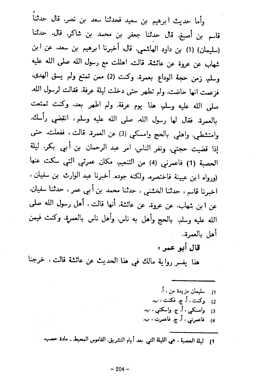 وَأَمَّا حَدِيثُ إِبْرَاهِيمَ بْنِ سَعِيدٍ فَحَدَّثَنَا سَعْدُ بْنُ نَصْرٍ قَالَ حَدَّثَنَا قَاسِمُ بْنُ أَصْبَغَ قَالَ حَدَّثَنَا جَعْفَرُ بْنُ مُحَمَّدِ بْنِ شَاكِرٍ قَالَ حَدَّثَنَا (سُلَيْمَانُ) بْنُ دَاوُدَ الْهَاشِمِيُّ قَالَ أَخْبَرَنَا إِبْرَاهِيمُ بْنُ سَعْدٍ عَنِ ابْنِ شِهَابٍ عَنْ عُرْوَةَ عَنْ عَائِشَةَ قَالَتْ أَهْلَلْتُ مَعَ رَسُولِ اللَّهِ صَلَّى اللَّهُ عَلَيْهِ وَسَلَّمَ زمن حَجَّةِ الْوَدَاعِ بِعُمْرَةٍ وَكُنْتُ مِمَّنْ تَمَتَّعَ وَلَمْ يَسُقِ الْهَدْيَ فَزَعَمَتْ أَنَّهَا حَاضَتْ وَلَمْ تَطْهُرْ حَتَّى دَخَلَتْ لَيْلَةُ عَرَفَةَ فَقَالَتْ لِرَسُولِ اللَّهِ صَلَّى اللَّهُ عَلَيْهِ وَسَلَّمَ هَذَا يَوْمُ عَرَفَةَ وَلَمْ أَطْهُرْ بَعْدُ وَكُنْتُ تَمَتَّعْتُ بِالْعُمْرَةِ فَقَالَ لَهَا رَسُولُ اللَّهِ صَلَّى اللَّهُ عَلَيْهِ وَسَلَّمَ انْقُضِي رَأْسَكِ وَامْتَشِطِي وَأَهِلِّي بِالْحَجِّ وَأَمْسِكِي عَنِ الْعُمْرَةِ قَالَتْ فَفَعَلْتُ حَتَّى إِذَا قَضَيْتُ حَجَّتِي وَنَفَرَ النَّاسُ أَمَرَ عَبْدَ الرَّحْمَنِ بْنَ أَبِي بَكْرٍ لَيْلَةَ الْحَصْبَةِ فَأَعْمَرَنِي مِنَ التَّنْعِيمِ مَكَانَ عُمْرَتِي الَّتِي سَكَتُّ عَنْهَا (وَرَوَاهُ ابْنُ عُيَيْنَةَ فَاخْتَصَرَهُ وَلَكِنَّهُ جَوَّدَهُ أَخْبَرَنَا عَبْدُ الْوَارِثِ بْنُ سُفْيَانَ أَخْبَرَنَا قَاسِمٌ حَدَّثَنَا الْخُشَنِيُّ حَدَّثَنَا مُحَمَّدُ بْنُ أَبِي عُمَرَ حَدَّثَنَا سُفْيَانُ عَنِ ابْنِ شِهَابٍ عَنْ عُرْوَةَ عَنْ عَائِشَةَ أَنَّهَا قَالَتْ أَهَلَّ رَسُولُ اللَّهِ صَلَّى اللَّهُ عَلَيْهِ وَسَلَّمَ بِالْحَجِّ وَأَهَلَّ بِهِ نَاسٌ وَأَهَلَّ نَاسٌ بِالْعُمْرَةِ وَكُنْتُ فِيمَنْ أَهَلَّ بِالْعُمْرَةِ - قَالَ أَبُو عُمَرَ هَذَا يُفَسِّرُ رِوَايَةَ مَالِكٍ فِي هَذَا الْحَدِيثِ عَنْ عَائِشَةَ قَالَتْ خَرَجْنَا