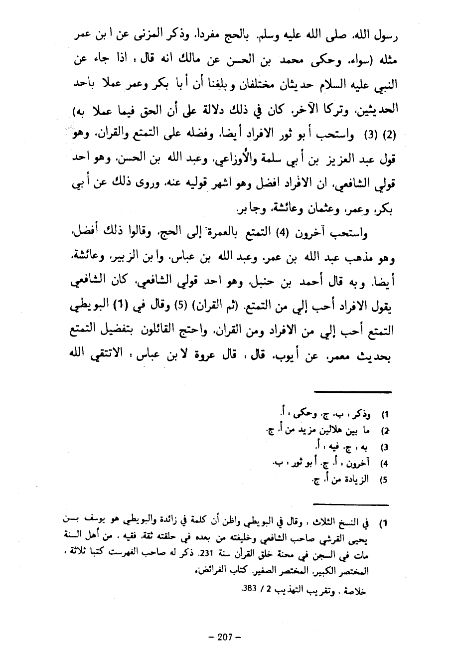 رسول الله صلى الله عليه وسلم بالحج مُفْرِدًا وَذَكَرَ الْمُزَنِيُّ عَنِ ابْنِ عُمَرَ مِثْلَهُ (سَوَاءً وَحَكَى مُحَمَّدُ بْنُ الْحَسَنِ عَنْ مَالِكٍ أَنَّهُ قَالَ إِذَا جَاءَ عَنِ النَّبِيِّ عَلَيْهِ السَّلَامُ حَدِيثَانِ مُخْتَلِفَانِ وَبَلَغَنَا أَنَّ أَبَا بَكْرٍ وَعُمَرَ عَمِلَا بِأَحَدِ الْحَدِيثَيْنِ وَتَرَكَا الْآخَرَ كَانَ فِي ذَلِكَ دَلَالَةٌ عَلَى أَنَّ الْحَقَّ فِيمَا عَمِلَا بِهِ) وَاسْتَحَبَّ أَبُو ثَوْرٍ الْإِفْرَادَ أَيْضًا وَفَضَّلَهُ عَلَى التَّمَتُّعِ وَالْقِرَانِ وَهُوَ قَوْلُ عَبْدِ الْعَزِيزِ بْنِ أَبِي سَلَمَةَ وَالْأَوْزَاعِيِّ وَعَبْدِ اللَّهِ بْنِ الْحَسَنِ وَهُوَ أَحَدُ قَوْلَيِ الشَّافِعِيِّ أَنَّ الْإِفْرَادَ أَفْضَلُ وَهُوَ أَشْهَرُ قَوْلَيْهِ عَنْهُ وَرَوَى ذَلِكَ عَنْ أَبِي بَكْرٍ وَعُمَرَ وَعُثْمَانَ وَعَائِشَةَ وَجَابِرٍ وَاسْتَحَبَّ آخَرُونَ التَّمَتُّعَ بِالْعُمْرَةِ إِلَى الْحَجِّ وَقَالُوا ذَلِكَ أَفْضَلُ وَهُوَ مَذْهَبُ عَبْدُ اللَّهِ بْنُ عُمَرَ وَعَبْدُ اللَّهِ بْنُ عَبَّاسٍ وَابْنِ الزُّبَيْرِ وَعَائِشَةَ أَيْضًا وَبِهِ قَالَ أَحْمَدُ بْنُ حَنْبَلٍ وَهُوَ أَحَدُ قَوْلَيِ الشَّافِعِيِّ كَانَ الشَّافِعِيُّ يَقُولُ الْإِفْرَادُ أَحَبُّ إِلَيَّ مِنَ التَّمَتُّعِ (ثُمَّ الْقِرَانُ) وَقَالَ فِي الْبُوَيْطِيِّ التَّمَتُّعُ أَحَبُّ إِلَيَّ مِنَ الْإِفْرَادِ وَمِنَ الْقِرَانِ وَاحْتَجَّ الْقَائِلُونَ بِتَفْضِيلِ التَّمَتُّعِ بِحَدِيثِ مَعْمَرٍ عَنْ أَيُّوبَ قَالَ قَالَ عُرْوَةُ لِابْنِ عَبَّاسٍ أَلَا تَتَّقِي اللَّهَ