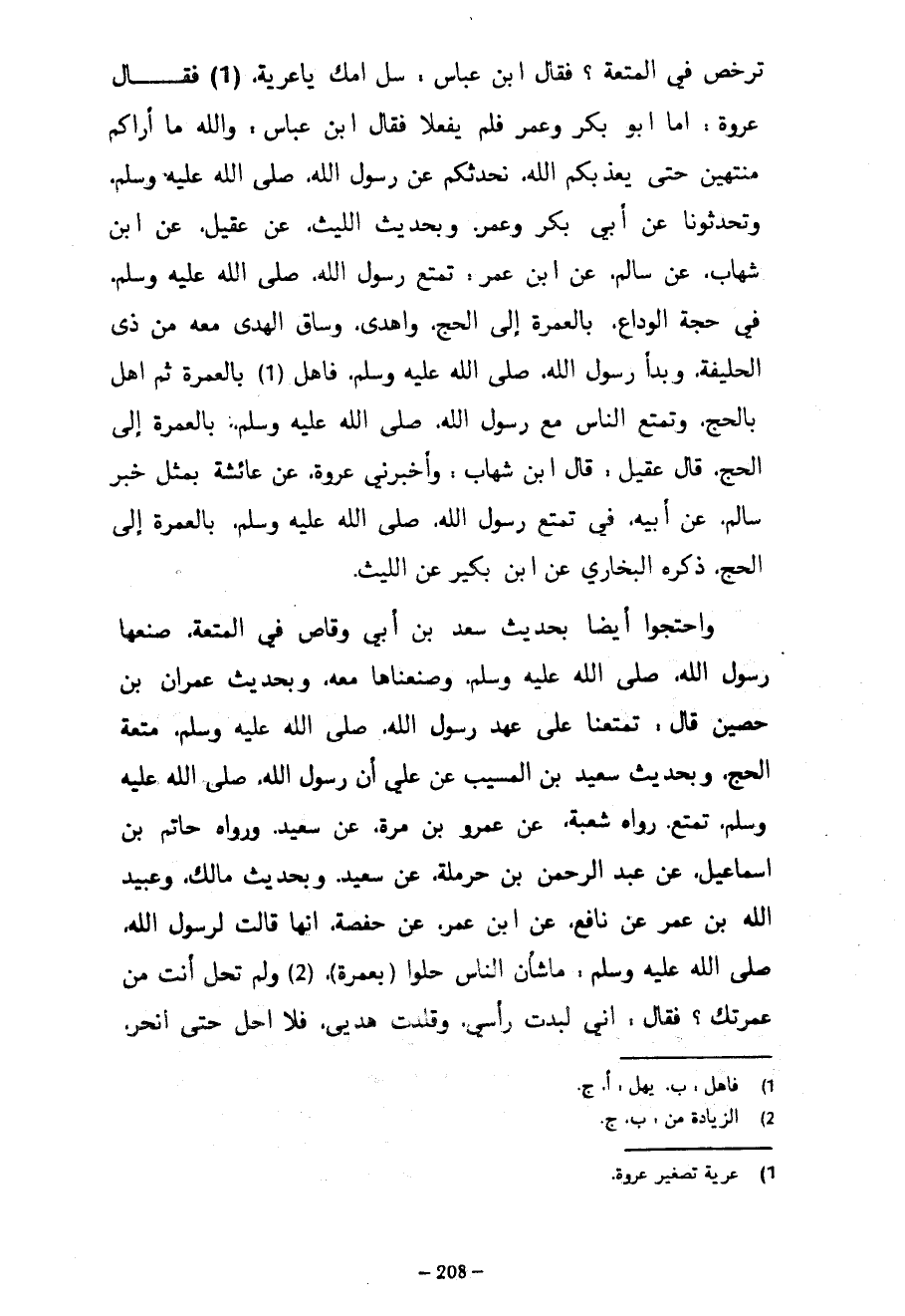 تُرَخِّصُ فِي الْمُتْعَةِ فَقَالَ ابْنُ عَبَّاسٍ سَلْ أُمَّكَ يَا عُرَيَّةُ فَقَالَ عُرْوَةُ أَمَّا أَبُو بَكْرٍ وَعُمَرُ فَلَمْ يَفْعَلَا فَقَالَ ابْنُ عَبَّاسٍ وَاللَّهِ مَا أَرَاكُمْ مُنْتَهِينَ حَتَّى يُعَذِّبَكُمُ اللَّهُ نُحَدِّثُكُمْ عَنْ رَسُولِ اللَّهِ صَلَّى اللَّهُ عَلَيْهِ وَسَلَّمَ وَتُحَدِّثُونَا عَنْ أَبِي بَكْرٍ وَعُمَرَ وَبِحَدِيثِ اللَّيْثِ عَنْ عُقَيْلٍ عَنِ ابْنِ شِهَابٍ عَنْ سَالِمٍ عَنِ ابْنِ عُمَرَ تَمَتَّعَ رَسُولُ اللَّهِ صَلَّى اللَّهُ عَلَيْهِ وَسَلَّمَ فِي حَجَّةِ الْوَدَاعِ بِالْعُمْرَةِ إِلَى الْحَجِّ وَأَهْدَى وَسَاقَ الْهَدْيَ مَعَهُ مِنْ ذِي الْحُلَيْفَةِ وَبَدَأَ رَسُولُ اللَّهِ صَلَّى اللَّهُ عَلَيْهِ وَسَلَّمَ فَأَهَلَّ بِالْعُمْرَةِ ثُمَّ أَهَلَّ بِالْحَجِّ وَتَمَتَّعَ النَّاسُ مَعَ رَسُولِ اللَّهِ صَلَّى اللَّهُ عَلَيْهِ وَسَلَّمَ بِالْعُمْرَةِ إِلَى الْحَجِّ قَالَ عُقَيْلٌ قَالَ ابْنُ شِهَابٍ وَأَخْبَرَنِي عُرْوَةُ عَنْ عَائِشَةَ بِمِثْلِ خَبَرِ سَالِمٍ عَنْ أَبِيهِ فِي تَمَتُّعِ رَسُولِ اللَّهِ صَلَّى اللَّهُ عَلَيْهِ وَسَلَّمَ بِالْعُمْرَةِ إِلَى الْحَجِّ ذَكَرَهُ الْبُخَارِيُّ عَنِ ابْنِ بُكَيْرٍ عَنِ اللَّيْثِ وَاحْتَجُّوا أَيْضًا بِحَدِيثِ سَعْدِ بْنِ أَبِي وَقَّاصٍ فِي الْمُتْعَةِ صَنَعَهَا رَسُولُ اللَّهِ صَلَّى اللَّهُ عَلَيْهِ وَسَلَّمَ وَصَنَعْنَاهَا مَعَهُ وَبِحَدِيثِ عِمْرَانَ بْنِ حُصَيْنٍ قَالَ تَمَتَّعْنَا عَلَى عَهْدِ رَسُولِ اللَّهِ صَلَّى اللَّهُ عَلَيْهِ وَسَلَّمَ مُتْعَةَ الْحَجِّ وَبِحَدِيثِ سَعِيدِ بْنِ الْمُسَيَّبِ عَنْ عَلَى أَنَّ رَسُولَ اللَّهِ صَلَّى اللَّهُ عَلَيْهِ وَسَلَّمَ تَمَتَّعَ رَوَاهُ شُعْبَةُ عَنْ عَمْرِو بْنِ مُرَّةَ عَنْ سَعِيدٍ وَرَوَاهُ حَاتِمِ بْنِ إِسْمَاعِيلَ عَنْ عَبْدِ الرَّحْمَنِ بْنِ حَرْمَلَةَ عَنْ سَعِيدٍ وَبِحَدِيثِ مَالِكٍ وَعُبَيْدِ اللَّهِ بْنِ عُمَرَ عَنْ نَافِعٍ عَنِ ابْنِ عُمَرَ عَنْ حَفْصَةَ أَنَّهَا قَالَتْ لِرَسُولِ اللَّهِ صَلَّى اللَّهُ عَلَيْهِ وَسَلَّمَ مَا شَأْنُ النَّاسِ حَلُّوا (بِعُمْرَةٍ) وَلَمْ تَحِلَّ أَنْتَ مِنْ عُمْرَتِكَ فَقَالَ إِنِّي لَبَّدْتُ رَأْسِي وَقَلَّدْتُ هَدْيِي فَلَا أَحِلُّ حَتَّى أَنْحَرَ