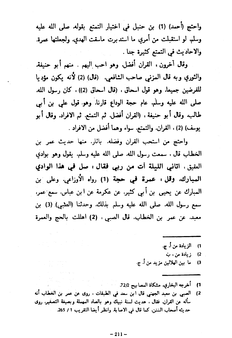 وَاحْتَجَّ (أَحْمَدُ) بْنُ حَنْبَلٍ فِي اخْتِيَارِ التَّمَتُّعِ بِقَوْلِهِ صَلَّى اللَّهُ عَلَيْهِ وَسَلَّمَ لَوِ اسْتَقْبَلْتُ مِنْ أَمْرِي مَا اسْتَدْبَرْتُ مَا سُقْتُ الْهَدْيَ وَلَجَعَلْتُهَا عُمْرَةً وَالْأَحَادِيثُ فِي التَّمَتُّعِ كَثِيرَةٌ جِدًّا وَقَالَ آخَرُونَ الْقِرَانُ أَفْضَلُ وَهُوَ أَحَبُّ إِلَيْهِمْ مِنْهُمْ أَبُو حَنِيفَةَ وَالثَّوْرِيُّ وَبِهِ قَالَ الْمُزَنِيُّ صَاحِبُ الشَّافِعِيِّ (قَالَ) لِأَنَّهُ يَكُونُ مُؤَدِّيًا لِلْفَرْضَيْنِ جَمِيعًا وَهُوَ قَوْلُ إِسْحَاقَ (قَالَ إِسْحَاقُ) كَانَ رَسُولُ اللَّهِ صَلَّى اللَّهُ عَلَيْهِ وَسَلَّمَ عام حَجَّةِ الْوَدَاعِ قَارِنًا وَهُوَ قَوْلُ عَلِيِّ بْنِ أَبِي طَالِبٍ وَقَالَ أَبُو حَنِيفَةَ (الْقِرَانُ أَفْضَلُ ثُمَّ التَّمَتُّعُ ثُمَّ الْإِفْرَادُ وَقَالَ أَبُو يُوسُفَ) الْقِرَانُ وَالتَّمَتُّعُ سَوَاءٌ وَهُمَا أَفْضَلُ مِنَ الْإِفْرَادِ وَاحْتَجَّ مَنِ اسْتَحَبَّ الْقِرَانَ وَفَضَّلَهُ بِآثَارٍ مِنْهَا حَدِيثُ عُمَرَ بْنِ الْخَطَّابِ قَالَ سَمِعْتُ رَسُولَ اللَّهِ صَلَّى اللَّهُ عَلَيْهِ وَسَلَّمَ يَقُولُ وَهُوَ بِوَادِي الْعَقِيقِ أَتَانِي اللَّيْلَةَ آتٍ مِنْ رَبِّي فَقَالَ صَلِّ فِي هَذَا الْوَادِي الْمُبَارَكِ وَقُلْ عُمْرَةً فِي حَجَّةٍ رَوَاهُ الْأَوْزَاعِيُّ وَعَلِيُّ بْنُ الْمُبَارَكِ عَنْ يَحْيَى بْنِ أَبِي كَثِيرٍ عَنْ عِكْرِمَةَ عَنِ ابْنِ عَبَّاسٍ سَمِعَ عُمَرَ سَمِعَ رَسُولَ اللَّهِ صَلَّى اللَّهُ عَلَيْهِ وَسَلَّمَ بذلك وَحَدَّثَنَا (الصُّبَيُّ) بْنُ مَعْبَدٍ عَنْ عُمَرَ بْنِ الْخَطَّابِ قَالَ الصُّبَيُّ أَهْلَلْتُ بِالْحَجِّ وَالْعُمْرَةِ