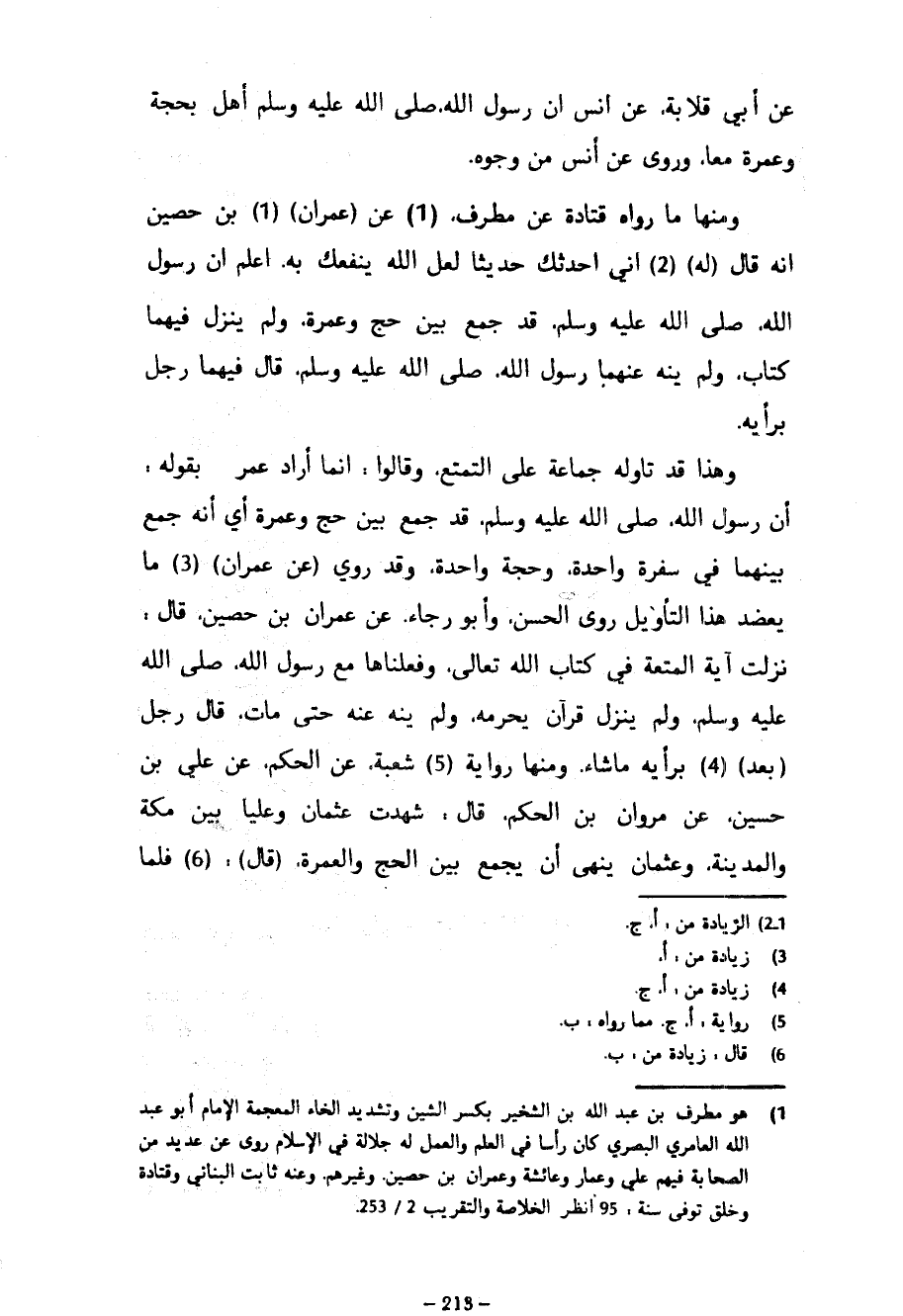 عَنْ أَبِي قِلَابَةَ عَنْ أَنَسٍ أَنَّ رَسُولَ اللَّهِ صَلَّى اللَّهُ عَلَيْهِ وَسَلَّمَ أَهَلَّ بِحَجَّةٍ وَعُمْرَةٍ مَعًا وَرُوِيَ عَنْ أَنَسٍ مِنْ وُجُوهٍ وَمِنْهَا مَا رَوَاهُ قَتَادَةُ عَنْ مُطَرِّفٍ عَنْ (عِمْرَانَ) بْنِ حُصَيْنٍ أَنَّهُ قَالَ (لَهُ) إِنِّي أُحَدِّثُكَ حَدِيثًا لَعَلَّ اللَّهَ يَنْفَعُكَ بِهِ أَعْلَمْ أَنَّ رَسُولَ اللَّهِ صَلَّى اللَّهُ عَلَيْهِ وسلم قَدْ جَمَعَ بَيْنَ حَجٍّ وَعُمْرَةٍ وَلَمْ يَنْزِلْ فِيهِمَا كِتَابٌ وَلَمْ يَنْهَ عَنْهُمَا رَسُولُ اللَّهِ صَلَّى اللَّهُ عَلَيْهِ وَسَلَّمَ قَالَ فِيهِمَا رَجُلٌ بِرَأْيِهِ وَهَذَا قَدْ تَأَوَّلَهُ جَمَاعَةٌ عَلَى التَّمَتُّعِ وَقَالُوا إِنَّمَا أَرَادَ عُمَرُ بِقَوْلِهِ أَنَّ رَسُولَ اللَّهِ صَلَّى اللَّهُ عَلَيْهِ وَسَلَّمَ قَدْ جَمَعَ بَيْنَ حَجٍّ وَعُمْرَةٍ أَيْ أَنَّهُ جَمَعَ بَيْنَهُمَا فِي سَفْرَةٍ وَاحِدَةٍ وَحَجَّةٍ وَاحِدَةٍ وَقَدْ رُوِيَ (عَنْ عِمْرَانَ) مَا يُعَضِّدُ هَذَا التَّأْوِيلَ رَوَى الْحَسَنُ وَأَبُو رَجَاءٍ عَنْ عِمْرَانَ بْنِ حُصَيْنٍ قَالَ نَزَلَتْ آيَةُ الْمُتْعَةِ فِي كِتَابِ اللَّهِ تَعَالَى وَفَعَلْنَاهَا مَعَ رَسُولِ اللَّهِ صَلَّى اللَّهُ عَلَيْهِ وَسَلَّمَ وَلَمْ يَنْزِلْ قُرْآنٌ يُحَرِّمُهُ وَلَمْ يَنْهَ عَنْهُ حَتَّى مَاتَ قَالَ رَجُلٌ (بَعْدُ) بِرَأْيِهِ مَا شَاءَ وَمِنْهَا رِوَايَةُ شُعْبَةَ عَنِ الْحَكَمِ عَنْ عَلِيِّ بْنِ حُسَيْنٍ عَنْ مَرْوَانَ بْنِ الْحَكَمِ قَالَ شَهِدْتُ عُثْمَانَ وَعَلِيًّا بَيْنَ مَكَّةَ وَالْمَدِينَةِ وَعُثْمَانُ يَنْهَى أَنْ يُجْمَعَ بَيْنَ الْحَجِّ وَالْعُمْرَةِ (قَالَ) فَلَمَّا