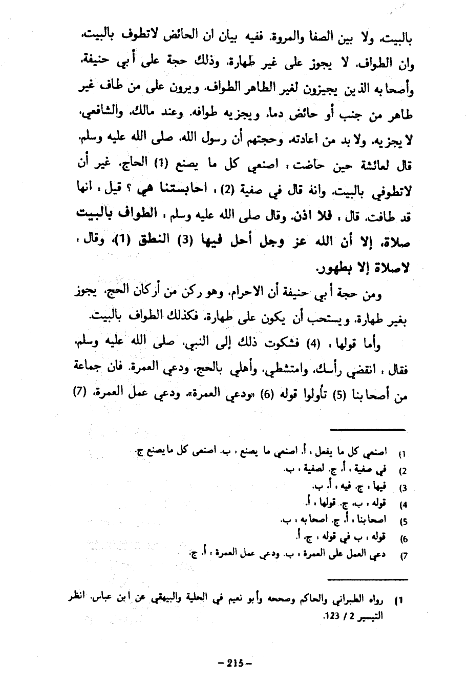 بِالْبَيْتِ وَلَا بَيْنَ الصَّفَا وَالْمَرْوَةِ فَفِيهِ بَيَانٌ أَنَّ الْحَائِضَ لَا تَطُوفُ بِالْبَيْتِ وَأَنَّ الطَّوَافَ لَا يَجُوزُ عَلَى غَيْرِ طَهَارَةٍ وَذَلِكَ حُجَّةٌ على أبي حنيفة وأصحابه الذين يجيزون لغير الطاهر الطَّوَافَ وَيَرَوْنَ عَلَى مَنْ طَافَ غَيْرَ طَاهِرٍ مِنْ جُنُبٍ أَوْ حَائِضٍ دَمًا وَيَجْزِيهِ طَوَافُهُ وَعِنْدَ مَالِكٍ وَالشَّافِعِيِّ لَا يُجْزِيهِ وَلَا بُدَّ مِنْ إِعَادَتِهِ وَحُجَّتُهُمْ أَنَّ رَسُولَ اللَّهِ صَلَّى اللَّهُ عَلَيْهِ وَسَلَّمَ قَالَ لِعَائِشَةَ حِينَ حَاضَتْ اصْنَعِي كُلَّ مَا يَصْنَعُ الْحَاجُّ غَيْرَ أَنْ لَا تَطُوفِي بِالْبَيْتِ وَأَنَّهُ قَالَ فِي صَفِيَّةَ أَحَابِسَتَنَا هِيَ قِيلَ إِنَّهَا قَدْ طَافَتْ قَالَ فَلَا إِذَنْ وَقَالَ صَلَّى اللَّهُ عَلَيْهِ وَسَلَّمَ الطَّوَافُ بِالْبَيْتِ صَلَاةٌ إِلَّا أَنَّ اللَّهَ عَزَّ وَجَلَّ أَحَلَّ فِيهَا النُّطْقَ وَقَالَ لَا صَلَاةَ إِلَّا بِطَهُورٍ وَمِنْ حُجَّةِ أَبِي حَنِيفَةَ أَنَّ الْإِحْرَامَ وَهُوَ رُكْنٌ مِنْ أَرْكَانِ الْحَجِّ يَجُوزُ بِغَيْرِ طَهَارَةٍ وَيُسْتَحَبُّ أَنْ يَكُونَ عَلَى طَهَارَةٍ فَكَذَلِكَ الطَّوَافُ بِالْبَيْتِ وَأَمَّا قَوْلُهَا فَشَكَوْتُ ذَلِكَ إِلَى النَّبِيِّ صَلَّى اللَّهُ عَلَيْهِ وَسَلَّمَ فَقَالَ انْقُضِي رَأْسَكِ وَامْتَشِطِي وَأَهِلِّي بِالْحَجِّ وَدَعِي الْعُمْرَةَ فَإِنَّ جَمَاعَةً مِنْ أَصْحَابِنَا تَأَوَّلُوا قَوْلَهُ وَدَعِي الْعُمْرَةَ وَدَعِي عَمَلَ الْعُمْرَةِ