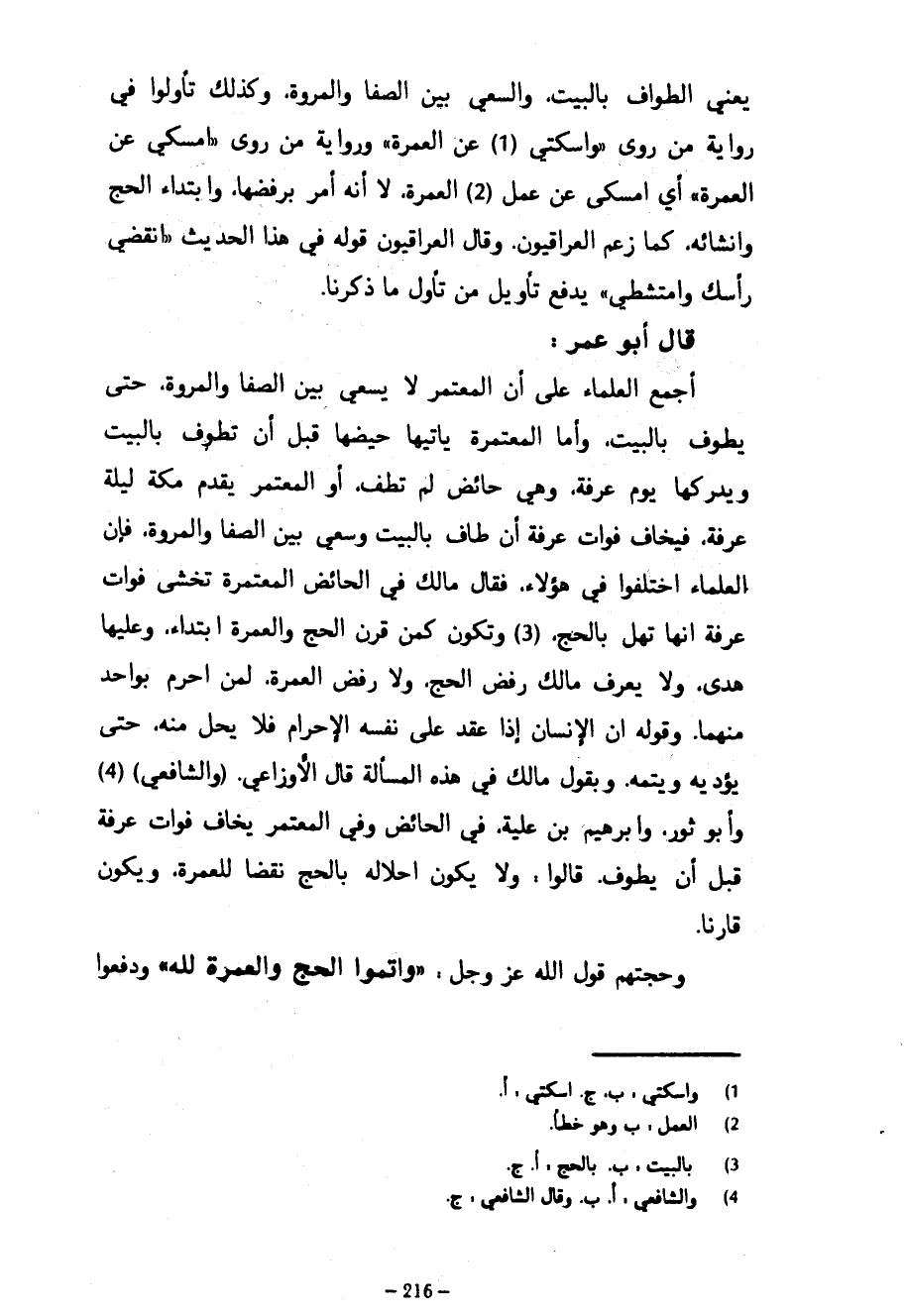 يَعْنِي الطَّوَافَ بِالْبَيْتِ وَالسَّعْيَ بَيْنَ الصَّفَا وَالْمَرْوَةِ وَكَذَلِكَ تَأَوَّلُوا فِي رِوَايَةِ مَنْ رَوَى وَاسْكُتِي عَنِ الْعُمْرَةِ وَرِوَايَةِ مَنْ رَوَى امْسِكِي عَنِ الْعُمْرَةِ أَيِ امْسِكِي عَنْ عَمَلِ الْعُمْرَةِ لَا أَنَّهُ أَمْرٌ بِرَفْضِهَا وَابْتِدَاءِ الْحَجِّ وَإِنْشَائِهِ كَمَا زَعَمَ الْعِرَاقِيُّونَ وَقَالَ الْعِرَاقِيُّونَ قَوْلُهُ فِي هَذَا الْحَدِيثِ انْقُضِي رَأْسَكِ وَامْتَشِطِي يَدْفَعُ تَأْوِيلَ مَنْ تَأَوَّلَ مَا ذَكَرْنَا - قَالَ أَبُو عُمَرَ أَجْمَعَ الْعُلَمَاءُ عَلَى أَنَّ المعتمر لَا يَسْعَى بَيْنَ الصَّفَا وَالْمَرْوَةِ حَتَّى يَطُوفَ بِالْبَيْتِ وَأَمَّا الْمُعْتَمِرَةُ يَأْتِيهَا حَيْضُهَا قَبْلَ أَنْ تَطُوفَ بِالْبَيْتِ وَيُدْرِكَهَا يَوْمَ عَرَفَةَ وَهِيَ حَائِضٌ لم تطف أو المعتمر يَقْدَمُ مَكَّةَ لَيْلَةَ عَرَفَةَ فَيَخَافُ فَوَاتَ عَرَفَةَ إِنْ طَافَ بِالْبَيْتِ وَسَعَى بَيْنَ الصَّفَا وَالْمَرْوَةِ فَإِنَّ الْعُلَمَاءَ اخْتَلَفُوا فِي هَؤُلَاءِ فَقَالَ مَالِكٌ فِي الْحَائِضِ الْمُعْتَمِرَةِ تَخْشَى فَوَاتَ عَرَفَةَ أَنَّهَا تُهِلُّ بِالْحَجِّ وَتَكُونُ كَمَنْ قَرَنَ الْحَجَّ وَالْعُمْرَةَ ابْتِدَاءً وَعَلَيْهَا هَدْيٌ وَلَا يَعْرِفُ مَالِكٌ رَفْضَ الْحَجِّ وَلَا رَفْضَ الْعُمْرَةِ لِمَنْ أَحْرَمَ بِوَاحِدٍ مِنْهُمَا وَقَوْلُهُ إِنَّ الْإِنْسَانَ إِذَا عَقَدَ عَلَى نَفْسِهِ الْإِحْرَامَ فَلَا يَحِلُّ مِنْهُ حَتَّى يُؤَدِّيَهُ وَيُتِمَّهُ وَبِقَوْلِ مَالِكٍ فِي هَذِهِ الْمَسْأَلَةِ قَالَ الْأَوْزَاعِيُّ) (وَالشَّافِعِيُّ) وَأَبُو ثَوْرٍ وَإِبْرَاهِيمُ بْنُ عُلَيَّةَ فِي الْحَائِضِ وَفِي الْمُعْتَمِرِ يَخَافُ فَوَاتَ عَرَفَةَ قَبْلَ أَنْ يَطُوفَ قَالُوا وَلَا يَكُونُ إِحْلَالُهُ بِالْحَجِّ نَقْضًا لِلْعُمْرَةِ وَيَكُونُ قَارِنًا وَحُجَّتُهُمْ قَوْلُ اللَّهُ عَزَّ وَجَلَّ وَأَتِمُّوا الْحَجَّ وَالْعُمْرَةَ لِلَّهِ ودفعوا