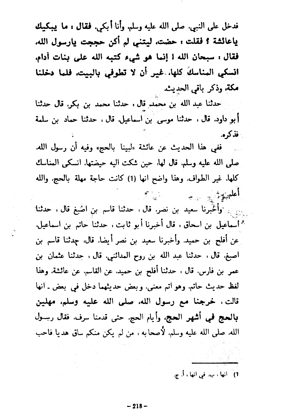 فَدَخَلَ عَلَيَّ النَّبِيُّ صَلَّى اللَّهُ عَلَيْهِ وَسَلَّمَ وَأَنَا أَبْكِي فَقَالَ مَا يُبْكِيكِ يَا عَائِشَةُ فَقُلْتُ حِضْتُ لَيْتَنِي لَمْ أَكُنْ حَجَجْتُ يَا رَسُولَ اللَّهِ فَقَالَ سُبْحَانَ اللَّهِ إِنَّمَا هُوَ شَيْءٌ كَتَبَهُ اللَّهُ عَلَى بَنَاتِ آدَمَ انْسُكِي الْمَنَاسِكَ كُلَّهَا غَيْرَ أَنْ لَا تَطُوفِي بِالْبَيْتِ فَلَمَّا دَخَلْنَا مَكَّةَ وَذَكَرَ بَاقِيَ الْحَدِيثِ حَدَّثَنَا عَبْدُ اللَّهِ بْنُ مُحَمَّدٍ قَالَ حَدَّثَنَا مُحَمَّدُ بْنُ بَكْرٍ قَالَ حَدَّثَنَا أَبُو دَاوُدَ قَالَ حَدَّثَنَا مُوسَى بْنُ إِسْمَاعِيلَ قَالَ حَدَّثَنَا حَمَّادُ بْنُ سَلَمَةَ فَذَكَرَهُ فَفِي هَذَا الْحَدِيثِ عَنْ عَائِشَةَ لَبَّيْنَا بِالْحَجِّ وَفِيهِ أَنَّ رَسُولَ اللَّهِ صَلَّى اللَّهُ عَلَيْهِ وَسَلَّمَ قَالَ لَهَا حِينَ شَكَتْ إِلَيْهِ حَيْضَتَهَا انْسُكِي الْمَنَاسِكَ كُلَّهَا غَيْرَ الطَّوَافِ وَهَذَا وَاضِحٌ أَنَّهَا كَانَتْ حَاجَةً مُهِلَّةً بِالْحَجِّ وَاللَّهُ أَعْلَمُ وَأَخْبَرَنَا سَعِيدُ بْنُ نَصْرٍ قَالَ حَدَّثَنَا قَاسِمُ بْنُ أَصْبَغَ قَالَ حَدَّثَنَا إِسْمَاعِيلُ بْنُ إِسْحَاقَ قَالَ أَخْبَرَنَا أَبُو ثَابِتٍ حَدَّثَنَا حَاتِمُ بْنُ إِسْمَاعِيلَ عَنْ أَفْلَحَ بْنِ حُمَيْدٍ وَأَخْبَرَنَا سَعِيدُ بْنُ نَصْرٍ أَيْضًا قَالَ حَدَّثَنَا قَاسِمُ بْنُ أَصْبَغَ قَالَ حَدَّثَنَا عَبْدُ اللَّهِ بْنُ رَوْحٍ الْمَدَائِنِيُّ قَالَ حَدَّثَنَا عُثْمَانُ بْنُ عُمَرَ بْنِ فَارِسٍ قَالَ حَدَّثَنَا أَفْلَحُ بْنُ حُمَيْدٍ عَنِ الْقَاسِمِ عَنْ عَائِشَةَ وَهَذَا لَفْظُ حَدِيثِ حَاتِمٍ وَهُوَ أَتَمُّ مَعْنًى وَبَعْضُ حَدِيثِهِمَا دَخَلَ فِي بَعْضٍ أَنَّهَا قَالَتْ خَرَجْنَا مَعَ رَسُولِ اللَّهِ صَلَّى اللَّهُ عَلَيْهِ وَسَلَّمَ مُهِلِّينَ بِالْحَجِّ فِي أَشْهُرِ الْحَجِّ وَأَيَّامِ الْحَجِّ حَتَّى قَدِمْنَا سَرِفَ فَقَالَ رَسُولُ اللَّهِ صَلَّى اللَّهُ عَلَيْهِ وَسَلَّمَ لِأَصْحَابِهِ مَنْ لَمْ يَكُنْ مِنْكُمْ سَاقَ هَدْيًا فَأَحَبَّ
