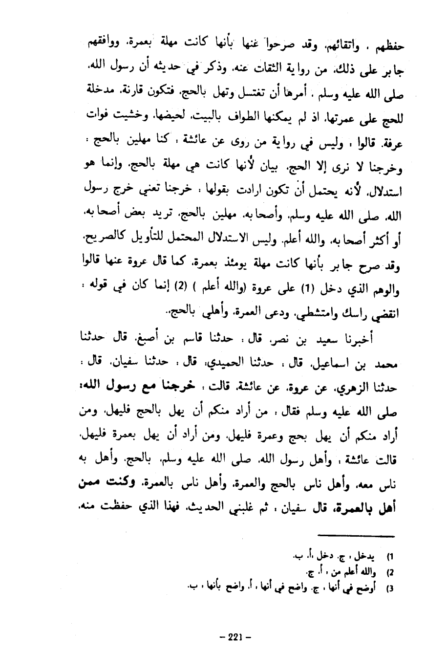 حفظهم وإتقانهم وَقَدْ صَرَّحُوا عَنْهَا بِأَنَّهَا كَانَتْ مُهِلَّةً بِعُمْرَةٍ وَوَافَقَهُمْ جَابِرٌ عَلَى ذَلِكَ مِنْ رِوَايَةِ الثِّقَاتِ عَنْهُ وَذَكَرَ فِي حَدِيثِهِ أَنَّ رَسُولَ اللَّهِ صَلَّى اللَّهُ عَلَيْهِ وَسَلَّمَ أَمَرَهَا أَنْ تَغْتَسِلَ وَتُهِلَّ بِالْحَجِّ فَتَكُونَ قَارِنَةً مُدْخِلَةً لِلْحَجِّ عَلَى عُمْرَتِهَا إِذْ لَمْ يُمْكِنْهَا الطَّوَافُ بِالْبَيْتِ لِحَيْضِهَا وَخَشِيَتْ فَوَاتَ عَرَفَةَ قَالُوا وَلَيْسَ فِي رِوَايَةِ مَنْ رَوَى عَنْ عَائِشَةَ كُنَّا مُهِلِّينَ بِالْحَجِّ وَخَرَجْنَا لَا نَرَى إِلَّا الْحَجَّ بَيَانٌ لِأَنَّهَا كَانَتْ هِيَ مُهِلَّةً بِالْحَجِّ وَإِنَّمَا هُوَ اسْتِدْلَالٌ لِأَنَّهُ يُحْتَمَلُ أَنْ تَكُونَ أَرَادَتْ بِقَوْلِهَا خَرَجْنَا تَعْنِي خَرَجَ رَسُولُ اللَّهِ صَلَّى اللَّهُ عَلَيْهِ وَسَلَّمَ وَأَصْحَابُهُ مُهِلِّينَ بِالْحَجِّ تُرِيدُ بَعْضَ أَصْحَابِهِ أَوْ أَكْثَرَ أَصْحَابِهِ وَاللَّهُ أَعْلَمُ وَلَيْسَ الِاسْتِدْلَالُ الْمُحْتَمِلُ لِلتَّأْوِيلِ كَالصَّرِيحِ وَقَدْ صَرَّحَ جَابِرٌ بِأَنَّهَا كَانَتْ مُهِلَّةً يَوْمَئِذَ بِعُمْرَةٍ كَمَا قَالَ عُرْوَةُ عَنْهَا قَالُوا وَالْوَهْمُ الَّذِي دَخَلَ عَلَى عُرْوَةَ (وَاللَّهُ أَعْلَمُ) إِنَّمَا كَانَ فِي قَوْلِهِ انْقُضِي رَأْسَكِ وَامْتَشِطِي وَدَعِي الْعُمْرَةَ وَأَهِلِّي بِالْحَجِّ أَخْبَرَنَا سَعِيدُ بْنُ نَصْرٍ قَالَ حَدَّثَنَا قَاسِمُ بْنُ أَصْبَغَ قَالَ حَدَّثَنَا مُحَمَّدُ بْنُ إِسْمَاعِيلَ قَالَ حَدَّثَنَا الْحُمَيْدِيُّ قَالَ حَدَّثَنَا سُفْيَانُ قَالَ حَدَّثَنَا الزُّهْرِيُّ عَنْ عُرْوَةَ عَنْ عَائِشَةَ قَالَتْ خَرَجْنَا مَعَ رَسُولِ اللَّهِ صَلَّى اللَّهُ عَلَيْهِ وَسَلَّمَ فَقَالَ مَنْ أَرَادَ مِنْكُمْ أَنْ يُهِلَّ بِالْحَجِّ فَلْيُهِلَّ وَمَنْ أَرَادَ مِنْكُمْ أَنْ يُهِلَّ بِحَجٍّ وَعُمْرَةٍ فَلْيُهِلَّ وَمَنْ أَرَادَ أَنْ يُهِلَّ بِعُمْرَةٍ فَلْيُهِلَّ قَالَتْ عَائِشَةُ وَأَهَلَّ رَسُولُ اللَّهِ صَلَّى اللَّهُ عَلَيْهِ وَسَلَّمَ بِالْحَجِّ وَأَهَلَّ بِهِ نَاسٌ مَعَهُ وَأَهَلَّ نَاسٌ بِالْحَجِّ وَالْعُمْرَةِ وَأَهَلَّ نَاسٌ بِالْعُمْرَةِ وَكُنْتُ مِمَّنْ أَهَلَّ بِالْعُمْرَةِ قَالَ سُفْيَانُ ثُمَّ غَلَبَنِي الْحَدِيثُ فَهَذَا الَّذِي حَفِظْتُ مِنْهُ