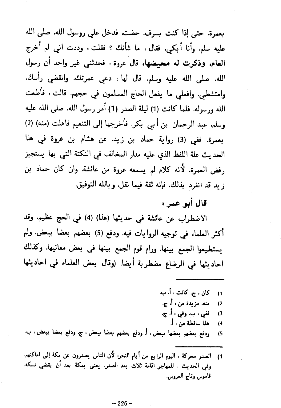 بِعُمْرَةٍ حَتَّى إِذَا كُنْتُ بِسَرِفَ حِضْتُ فَدَخَلَ عَلَيَّ رَسُولُ اللَّهِ صَلَّى اللَّهُ عَلَيْهِ وسلم وَأَنَا أَبْكِي فَقَالَ مَا شَأْنُكِ فَقُلْتُ وَدِدْتُ أَنِّي لَمْ أَخْرُجِ الْعَامَ وَذَكَرَتْ لَهُ مَحِيضَهَا قَالَ عُرْوَةُ فَحَدَّثَنِي غَيْرُ وَاحِدٍ أَنَّ رَسُولَ اللَّهِ صَلَّى اللَّهُ عَلَيْهِ وَسَلَّمَ قَالَ لَهَا دَعِي عُمْرَتَكِ وَانْقُضِي رَأْسَكِ وَامْتَشِطِي وَافْعَلِي مَا يَفْعَلُ الْحَاجُّ الْمُسْلِمُونَ فِي حَجِّهِمْ قَالَتْ فَأَطَعْتُ اللَّهَ وَرَسُولَهُ فَلَمَّا كَانَتْ لَيْلَةُ الصَّدْرِ أَمَرَ رَسُولُ اللَّهِ صَلَّى اللَّهُ عَلَيْهِ وَسَلَّمَ عَبْدَ الرَّحْمَنِ بْنَ أَبِي بَكْرٍ فَأَخْرَجَهَا إِلَى التَّنْعِيمِ فَأَهَلَّتْ (مِنْهُ) بِعُمْرَةٍ فَفِي رِوَايَةِ حَمَّادُ بْنُ زَيْدٍ عَنْ هِشَامِ بْنِ عُرْوَةَ فِي هَذَا الْحَدِيثِ عِلَّةُ اللَّفْظِ الَّذِي عَلَيْهِ مَدَارُ الْمُخَالِفِ فِي النُّكْتَةِ الَّتِي بِهَا يَسْتَجِيزُ رَفْضَ الْعُمْرَةِ لِأَنَّهُ كَلَامٌ لَمْ يَسْمَعْهُ عُرْوَةُ مِنْ عَائِشَةَ وَإِنْ كَانَ حَمَّادُ بْنُ زَيْدٍ قَدِ انْفَرَدَ بِذَلِكَ فَإِنَّهُ ثِقَةٌ فِيمَا نَقَلَ وَبِاللَّهِ التَّوْفِيقُ - قَالَ أَبُو عُمَرَ الِاضْطِرَابُ عَنْ عَائِشَةَ فِي حَدِيثِهَا (هَذَا) فِي الْحَجِّ عَظِيمٌ وَقَدْ أَكْثَرَ الْعُلَمَاءَ فِي تَوْجِيهِ الرِّوَايَاتِ فِيهِ وَدَفَعَ بَعْضُهُمْ بَعْضًا بِبَعْضٍ وَلَمْ يَسْتَطِيعُوا الْجَمْعَ بَيْنَهَا وَرَامَ قَوْمٌ الْجَمْعَ بَيْنَهَا فِي بَعْضِ مَعَانِيهَا وَكَذَلِكَ أَحَادِيثُهَا فِي الرَّضَاعِ مُضْطَرِبَةٌ أَيْضًا (وَقَالَ بَعْضُ الْعُلَمَاءِ فِي أَحَادِيثِهَا
