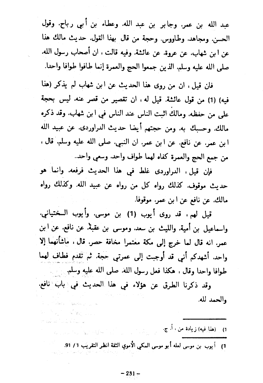 عَبْدِ اللَّهِ بْنِ عُمَرَ وَجَابِرِ بْنِ عَبْدِ اللَّهِ وَعَطَاءِ بْنِ أَبِي رَبَاحٍ وَقَوْلِ الْحَسَنِ ومجاهد وطاووس وَحُجَّةُ مَنْ قَالَ بِهَذَا الْقَوْلِ حَدِيثُ مَالِكٍ هَذَا عَنِ ابْنِ شِهَابٍ عَنْ عُرْوَةَ عَنْ عَائِشَةَ وَفِيهِ قَالَتْ أَنَّ أَصْحَابَ رَسُولِ اللَّهِ صَلَّى اللَّهُ عَلَيْهِ وسلم الذين جمعواالحج وَالْعُمْرَةَ إِنَّمَا طَافُوا طَوَافًا وَاحِدًا فَإِنْ قِيلَ إِنَّ مَنْ رَوَى هَذَا الْحَدِيثَ عَنِ ابْنِ شِهَابٍ لَمْ يَذْكُرْ (هَذَا فِيهِ) مِنْ قَوْلِ عَائِشَةَ قِيلَ لَهُ إِنَّ تَقْصِيرَ مَنْ قَصُرَ عَنْهُ لَيْسَ بِحُجَّةٍ عَلَى مَنْ حَفِظَهُ وَمَالِكٌ أَثْبَتُ النَّاسِ عِنْدَ النَّاسِ فِي ابْنِ شِهَابٍ وَقَدْ ذَكَرَهُ مَالِكٌ وَحَسْبُكَ بِهِ وَمِنْ حُجَّتِهِمْ أَيْضًا حَدِيثُ الدَّرَاوَرْدِيِّ عَنْ عُبَيْدِ اللَّهِ بْنِ عُمَرَ عَنْ نَافِعٍ عَنِ ابْنِ عُمَرَ أَنَّ النَّبِيَّ صَلَّى اللَّهُ عليه وسلم قال من جَمَعَ الْحَجَّ وَالْعُمْرَةَ كَفَاهُ لَهُمَا طَوَافٌ وَاحِدٌ وَسَعْيٌ وَاحِدٌ فَإِنْ قِيلَ الدَّرَاوَرْدِيُّ غَلِطَ فِي هَذَا الْحَدِيثِ فَرَفَعَهُ وَإِنَّمَا هُوَ حَدِيثٌ مَوْقُوفٌ كَذَلِكَ رَوَاهُ كُلُّ مَنْ رَوَاهُ عَنْ عُبَيْدِ اللَّهِ وَكَذَلِكَ رَوَاهُ مَالِكٌ عَنْ نَافِعٍ عَنِ ابْنِ عُمَرَ مَوْقُوفًا قِيلَ لَهُمْ قَدْ رَوَى أَيُّوبُ بْنُ مُوسَى وَأَيُّوبُ السَّخْتِيَانِيُّ وَإِسْمَاعِيلُ بْنُ أُمَيَّةَ وَاللَّيْثُ بْنُ سَعْدٍ وَمُوسَى بْنُ عُقْبَةَ عَنْ نَافِعٍ عَنِ ابْنِ عُمَرَ أَنَّهُ قَالَ لَمَّا خَرَجَ إِلَى مَكَّةَ مُعْتَمِرًا مَخَافَةَ حَصْرٍ قَالَ مَا شَأْنُهُمَا إِلَّا وَاحِدٌ أُشْهِدُكُمْ أَنِّي قَدْ أَوْجَبْتُ إِلَى عُمْرَتِي حَجَّةً ثُمَّ تَقَدَّمَ فَطَافَ لَهُمَا طَوَافًا وَاحِدًا وَقَالَ هَكَذَا فَعَلَ رَسُولُ اللَّهِ صَلَّى اللَّهُ عَلَيْهِ وَسَلَّمَ وَقَدْ ذَكَرْنَا الطُّرُقَ عَنْ هَؤُلَاءِ فِي هَذَا الْحَدِيثِ فِي بَابِ نَافِعٍ وَالْحَمْدُ لِلَّهِ