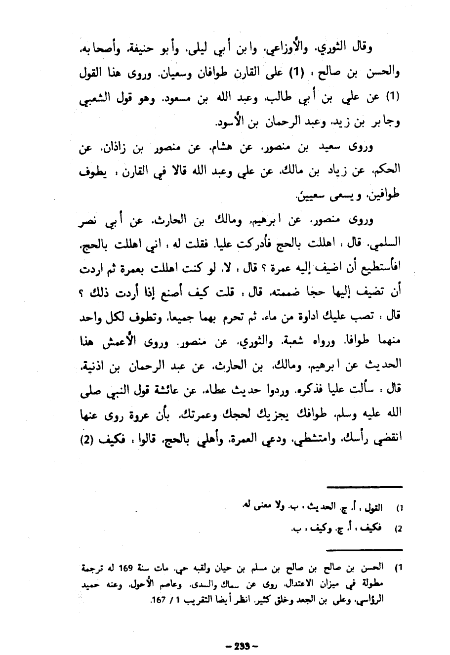 وَقَالَ الثَّوْرِيُّ وَالْأَوْزَاعِيُّ وَابْنُ أَبِي لَيْلَى وَأَبُو حَنِيفَةَ وَأَصْحَابُهُ وَالْحَسَنُ بْنُ صَالِحٍ عَلَى الْقَارِنِ طَوَافَانِ وَسَعْيَانِ وَرُوِيَ هَذَا الْقَوْلُ عَنْ عَلِيِّ بْنِ أَبِي طَالِبٍ وَعَبْدِ اللَّهِ بْنُ مسعود وَهُوَ قَوْلُ الشَّعْبِيِّ وَجَابِرِ بْنِ زَيْدٍ وَعَبْدِ الرَّحْمَنِ بْنِ الْأَسْوَدِ وَرَوَى سَعِيدُ بْنُ مَنْصُورٍ عَنْ هِشَامٍ عَنْ مَنْصُورِ بْنِ زَاذَانَ عَنِ الْحَكَمِ عَنْ زِيَادِ بْنِ مَالِكٍ عَنْ عَلِيٍّ وَعَبْدِ اللَّهِ قَالَا فِي الْقَارِنِ يَطُوفُ طَوَافَيْنِ ويسعى سعيين وروى منصور عن إبرهيم وَمَالِكِ بْنِ الْحَارِثِ عَنْ أَبِي نَصْرٍ السُّلَمِيِّ قَالَ أَهْلَلْتُ بِالْحَجِّ فَأَدْرَكْتُ عَلِيًّا فَقُلْتُ لَهُ إِنِّي أَهْلَلْتُ بِالْحَجِّ أَفَأَسْتَطِيعُ أَنْ أُضِيفَ إِلَيْهِ عُمْرَةً قَالَ لَا لَوْ كُنْتَ أَهْلَلْتَ بِعُمْرَةٍ ثُمَّ أَرَدْتَ أَنْ تُضِيفَ إِلَيْهَا حَجًّا ضَمَمْتَهُ قَالَ قُلْتُ كَيْفَ أَصْنَعُ إِذَا أَرَدْتُ ذَلِكَ قَالَ تَصُبُّ عَلَيْكَ إِدَاوَةً مِنْ مَاءٍ ثُمَّ تُحْرِمُ بِهِمَا جَمِيعًا وَتَطُوفُ لِكُلِّ وَاحِدٍ مِنْهُمَا طَوَافًا وَرَوَاهُ شُعْبَةُ وَالثَّوْرِيُّ عَنْ مَنْصُورٍ وَرَوَى الْأَعْمَشُ هَذَا الْحَدِيثَ عَنْ إِبْرَاهِيمَ وَمَالِكِ بْنِ الحارث عن عبد الرحمن بن أذنية قَالَ سَأَلْتُ عَلِيًّا فَذَكَرَهُ وَرَدُّوا حَدِيثَ عَطَاءٍ عَنْ عَائِشَةَ قَوْلَ النَّبِيِّ صَلَّى اللَّهُ عَلَيْهِ وَسَلَّمَ طَوَافُكِ يُجْزِيكِ لِحَجِّكِ وَعُمْرَتِكِ بِأَنَّ عُرْوَةَ رَوَى عَنْهَا انْقُضِي رَأْسَكِ وَامْتَشِطِي وَدَعِي الْعُمْرَةَ وَأَهِلِّي بِالْحَجِّ قَالُوا فَكَيْفَ