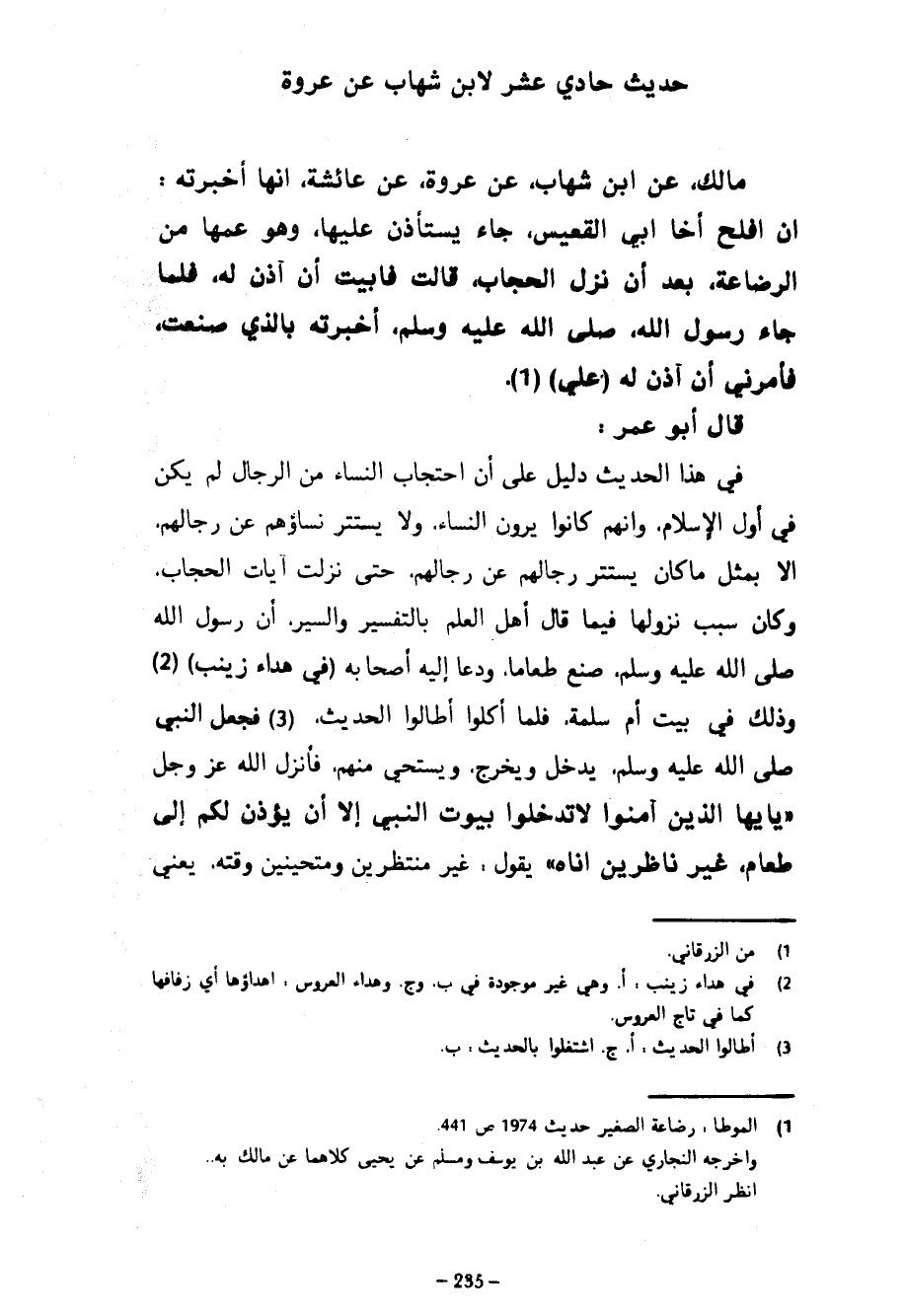 حَدِيثٌ حَادِي عَشَرَ لِابْنِ شِهَابٍ عَنْ عُرْوَةَ مَالِكٌ عَنِ ابْنِ شِهَابٍ عَنْ عُرْوَةَ عَنْ عَائِشَةَ أَنَّهَا أَخْبَرَتْهُ أَنَّ أَفْلَحَ أَخَا أَبِي الْقُعَيْسِ جَاءَ يَسْتَأْذِنُ عَلَيْهَا وَهُوَ عَمُّهَا مِنَ الرَّضَاعَةِ بَعْدَ أَنْ نَزَلَ الْحِجَابُ قَالَتْ فَأَبَيْتُ أَنْ آذَنَ لَهُ فَلَمَّا جَاءَ رَسُولُ اللَّهِ صَلَّى اللَّهُ عَلَيْهِ وَسَلَّمَ أَخْبَرْتُهُ بِالَّذِي صَنَعْتُ فَأَمَرَنِي أَنْ آذَنَ لَهُ (عَلَيَّ (1) - قَالَ أَبُو عُمَرَ فِي هَذَا الْحَدِيثِ دَلِيلٌ عَلَى أَنَّ احْتِجَابَ النِّسَاءِ مِنَ الرِّجَالِ لَمْ يَكُنْ فِي أَوَّلِ الْإِسْلَامِ وَأَنَّهُمْ كَانُوا يَرَوْنَ النِّسَاءَ وَلَا يَسْتَتِرُ نِسَاؤُهُمْ عَنْ رِجَالِهِمْ إِلَّا بِمِثْلِ مَا كَانَ يَسْتَتِرُ رِجَالُهُمْ عَنْ رِجَالِهِمْ حَتَّى نَزَلَتْ آيَاتُ الْحِجَابِ وَكَانَ سَبَبُ نُزُولِهَا فِيمَا قَالَ أَهْلُ الْعِلْمِ بِالتَّفْسِيرِ وَالسِّيَرِ أَنَّ رَسُولَ اللَّهِ صَلَّى اللَّهُ عَلَيْهِ وَسَلَّمَ صَنَعَ طَعَامًا وَدَعَا إِلَيْهِ أَصْحَابَهُ (فِي هِدَاءِ زَيْنَبَ) وَذَلِكَ فِي بَيْتِ أُمِّ سَلَمَةَ فَلَمَّا أَكَلُوا أَطَالُوا الْحَدِيثَ فَجَعَلَ النَّبِيُّ صَلَّى اللَّهُ عَلَيْهِ وَسَلَّمَ يَدْخُلُ وَيَخْرُجُ وَيَسْتَحِي مِنْهُمْ فَأَنْزَلَ اللَّهُ عَزَّ وَجَلَّ يا أيها الَّذِينَ آمَنُوا لَا تَدْخُلُوا بُيُوتَ النَّبِيِّ إِلَّا أَنْ يُؤْذَنَ لَكُمْ إِلَى طَعَامٍ غَيْرَ نَاظِرِينَ إِنَاهُ يَقُولُ غَيْرَ مُنْتَظِرِينَ وَمُتَحَيِّنِينَ وَقْتَهَ يَعْنِي