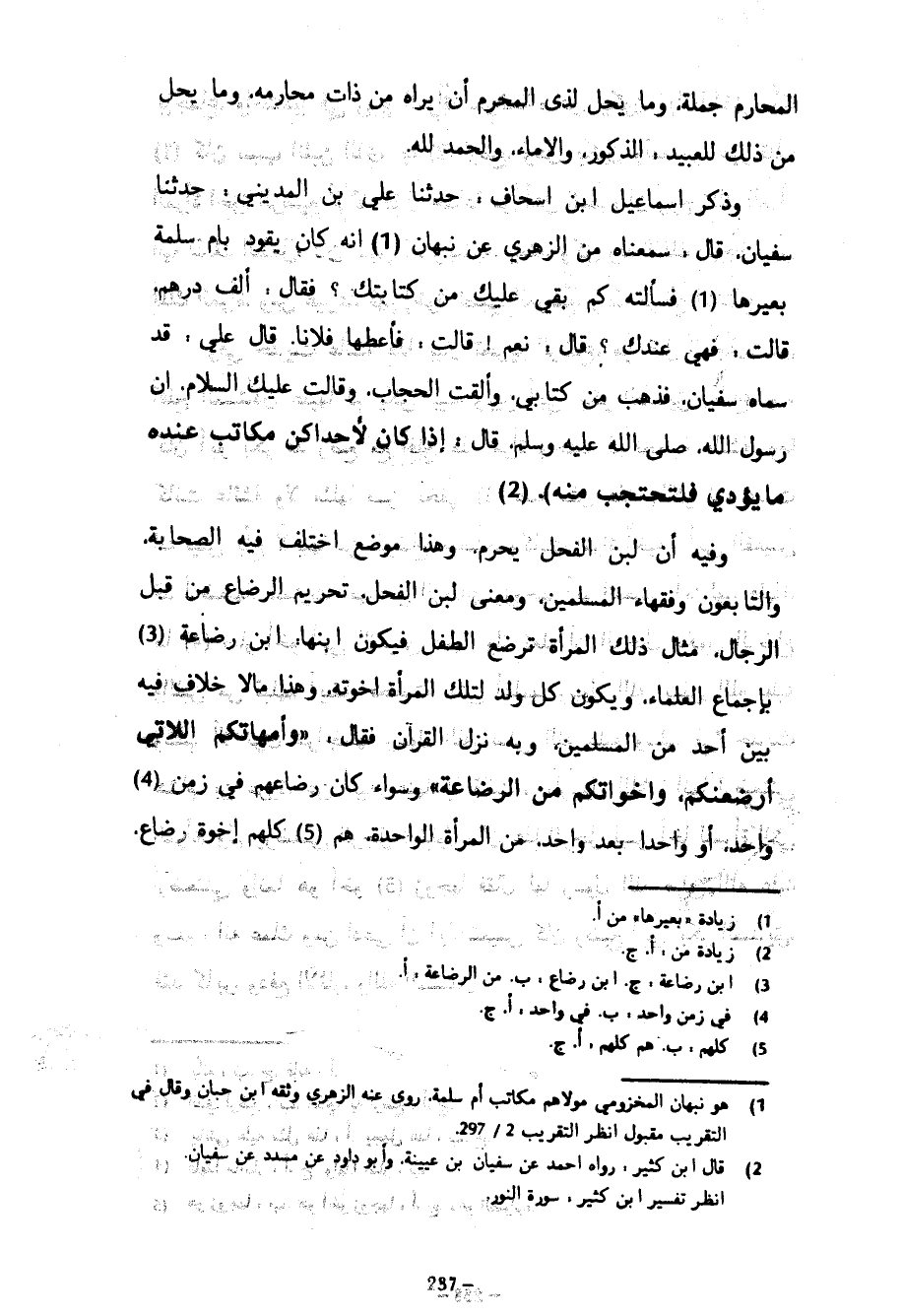 الْمَحَارِمِ جُمْلَةً وَمَا يَحِلُّ لِذِي الْمَحْرَمِ أَنْ يَرَاهُ مِنْ ذَاتِ مَحَارِمِهِ وَمَا يَحِلُّ مِنْ ذَلِكَ لِلْعَبِيدِ الذُّكُورِ وَالْإِمَاءِ وَالْحَمْدُ لِلَّهِ وَذَكَرَ إِسْمَاعِيلُ بْنُ إِسْحَاقَ حَدَّثَنَا عَلِيُّ بْنُ الْمَدِينِيِّ حَدَّثَنَا سُفْيَانُ قَالَ سَمِعْنَاهُ مِنَ الزُّهْرِيِّ عَنْ نَبْهَانَ أَنَّهُ كَانَ يَقُودُ بِأُمِّ سَلَمَةَ بَعِيرَهَا فَسَأَلَتْهُ كَمْ بَقِيَ عَلَيْكَ مِنْ كِتَابَتِكَ فَقَالَ أَلْفُ دِرْهَمٍ قَالَتْ فَهِيَ عِنْدَكَ قَالَ نَعَمْ قَالَتْ فَأَعْطِهَا فُلَانًا قَالَ عَلَيٌّ قَدْ سَمَّاهُ سُفْيَانُ فَذَهَبَ مِنْ كِتَابِي وَأَلْقَتِ الْحِجَابَ وَقَالَتْ عَلَيْكَ السَّلَامُ أَنَّ رَسُولَ اللَّهِ صَلَّى اللَّهُ عَلَيْهِ وَسَلَّمَ قَالَ إِذَا كَانَ لِإِحْدَاكُنَّ مَكَاتِبُ عِنْدَهُ مَا يُؤَدِّي فَلْتَحْتَجِبْ مِنْهُ) وَفِيهِ أَنَّ لَبَنَ الْفَحْلِ يُحَرِّمُ وَهَذَا مَوْضِعٌ اخْتَلَفَ فِيهِ الصَّحَابَةُ وَالتَّابِعُونَ وَفُقَهَاءُ الْمُسْلِمِينَ وَمَعْنَى لَبَنِ الْفَحْلِ تَحْرِيمُ الرَّضَاعِ مِنْ قِبَلِ الرِّجَالِ مِثَالُ ذَلِكَ المرأة ترضع الطفل فَيَكُونُ ابْنُهَا ابْنَ رَضَاعَةٍ بِإِجْمَاعِ الْعُلَمَاءِ وَيَكُونُ كُلُّ وَلَدٍ لِتِلْكَ الْمَرْأَةِ إِخْوَتَهُ وَهَذَا مَا لَا خِلَافَ فِيهِ بَيْنَ أَحَدٍ مِنَ الْمُسْلِمِينَ وَبِهِ نَزَلَ الْقُرْآنُ فَقَالَ وَأُمَّهَاتُكُمُ اللَّاتِي أَرْضَعْنَكُمْ وَأَخَوَاتُكُمْ مِنَ الرَّضَاعَةِ وَسَوَاءٌ كَانَ رَضَاعُهُمْ فِي زَمَنٍ وَاحِدٍ أَوْ وَاحِدًا بَعْدَ وَاحِدٍ مِنَ الْمَرْأَةِ الْوَاحِدَةِ هُمْ كُلُّهُمْ إِخْوَةُ رَضَاعٍ