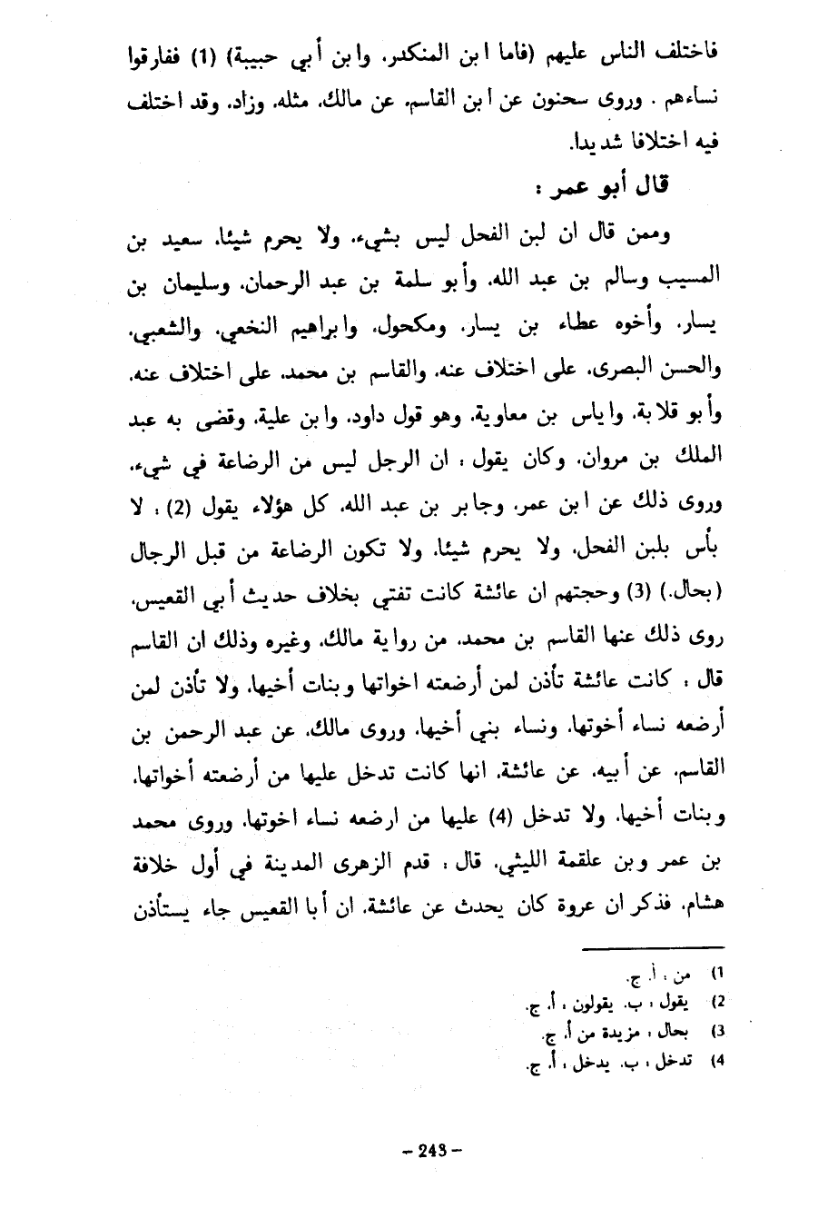 فَاخْتَلَفَ النَّاسُ عَلَيْهِمْ (فَأَمَّا ابْنُ الْمُنْكَدِرِ وَابْنُ أَبِي حَبِيبَةَ) فَفَارَقُوا نِسَاءَهُمْ وَرَوَى سَحْنُونٌ عَنِ ابْنِ الْقَاسِمِ عَنْ مَالِكٍ مَثْلَهُ وَزَادَ وَقَدِ اخْتُلِفَ فِيهِ اخْتِلَافًا شَدِيدًا - قَالَ أَبُو عُمَرَ وَمِمَّنْ قَالَ أَنَّ لَبَنَ الْفَحْلِ لَيْسَ بِشَيْءٍ وَلَا يُحَرِّمُ شَيْئًا سَعِيدِ بْنِ الْمُسَيَّبِ وَسَالِمِ بْنِ عَبْدِ اللَّهِ وَأَبُو سَلَمَةَ بْنُ عَبْدِ الرَّحْمَنِ وَسُلَيْمَانُ بْنُ يَسَارٍ وَأَخُوهُ عَطَاءُ بْنُ يسار ومكحول وإبرهيم النَّخَعِيُّ وَالشَّعْبِيُّ وَالْحَسَنُ الْبَصْرِيُّ عَلَى اخْتِلَافٍ عَنْهُ وَالْقَاسِمُ بْنُ مُحَمَّدٍ عَلَى اخْتِلَافٍ عَنْهُ وَأَبُو قِلَابَةَ وَإِيَاسُ بْنُ مُعَاوِيَةَ وَهُوَ قَوْلُ دَاوُدَ وَابْنِ عُلَيَّةَ وَقَضَى بِهِ عَبْدُ الْمَلِكِ بْنُ مَرْوَانَ وَكَانَ يَقُولُ إِنَّ الرَّجُلَ لَيْسَ مِنَ الرَّضَاعَةِ فِي شَيْءٍ وَرُوِيَ ذَلِكَ عَنِ ابْنِ عُمَرَ وَجَابِرِ بْنِ عَبْدِ اللَّهِ كُلُّ هَؤُلَاءِ يَقُولُ لَا بَأْسَ بِلَبَنِ الْفَحْلِ وَلَا يُحَرِّمُ شَيْئًا وَلَا تَكُونُ الرَّضَاعَةُ مِنْ قِبَلِ الرِّجَالِ (بِحَالٍ) وَحُجَّتُهُمْ أَنَّ عَائِشَةَ كَانَتْ تُفْتِي بِخِلَافِ حَدِيثِ أَبِي الْقُعَيْسِ رَوَى ذَلِكَ عَنْهَا الْقَاسِمُ بْنُ مُحَمَّدٍ مِنْ رِوَايَةِ مَالِكٍ وَغَيْرِهِ وَذَلِكَ أَنَّ الْقَاسِمَ قَالَ كَانَتْ عَائِشَةُ تَأْذَنُ لِمَنْ أَرْضَعَتْهُ أَخَوَاتُهَا وَبَنَاتُ أَخِيهَا وَلَا تَأْذَنُ لِمَنْ أُرْضِعُهُ نِسَاءُ إِخْوَتِهَا وَنِسَاءُ بَنِي أَخِيهَا وَرَوَى مَالِكٌ عَنْ عَبْدِ الرَّحْمَنِ بْنِ الْقَاسِمِ عَنْ أَبِيهِ عَنْ عَائِشَةَ أَنَّهَا كَانَتْ تُدْخِلُ عَلَيْهَا مَنْ أَرْضَعَتْهُ أَخَوَاتُهَا وَبَنَاتُ أَخِيهَا وَلَا تُدْخِلُ عَلَيْهَا مَنْ أَرْضَعَهُ نِسَاءُ إِخْوَتِهَا وَرَوَى مُحَمَّدُ بْنُ عَمْرِو بْنِ عَلْقَمَةَ اللَّيْثِيُّ قَالَ قَدِمَ الزُّهْرِيُّ الْمَدِينَةَ فِي أَوَّلِ خِلَافَةِ هِشَامٍ فَذَكَرَ أَنَّ عُرْوَةَ كَانَ يُحَدِّثُ عَنْ عَائِشَةَ أَنَّ أَبَا الْقُعَيْسِ جَاءَ يَسْتَأْذِنُ