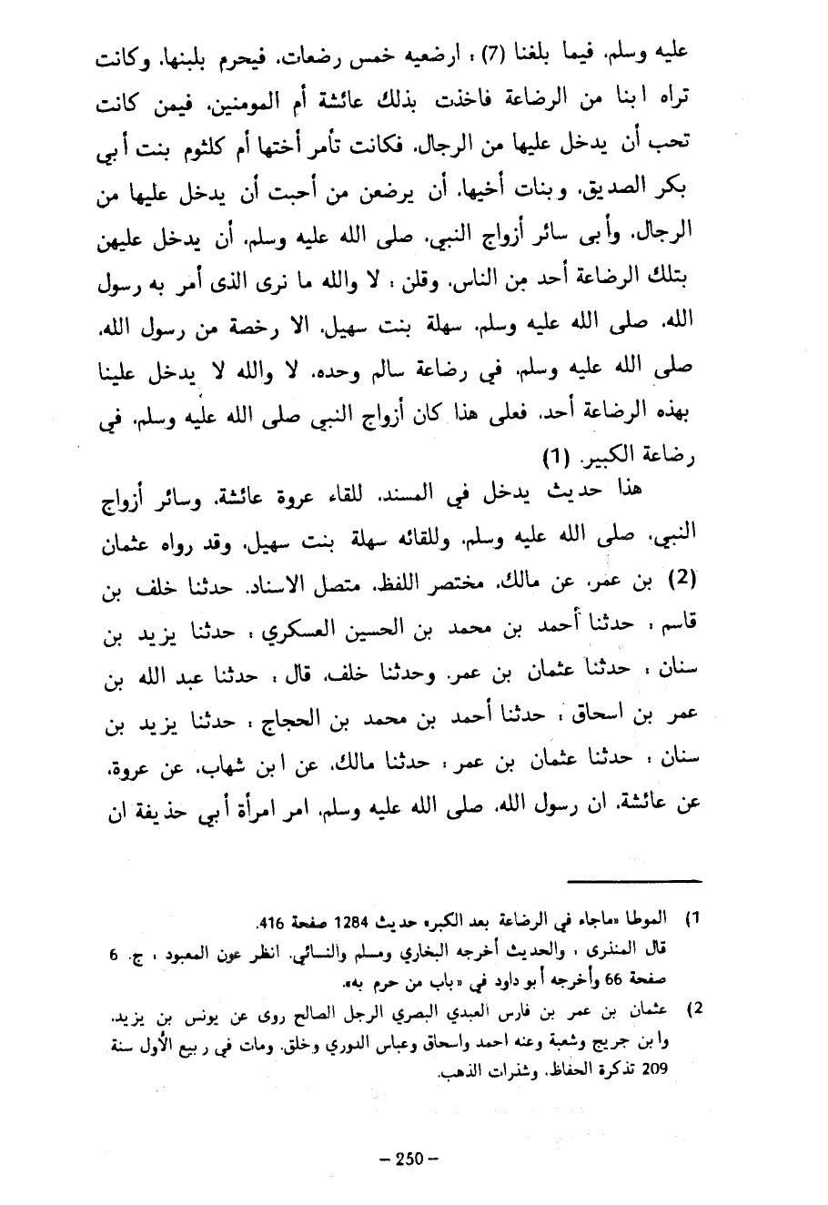 عَلَيْهِ وَسَلَّمَ فِيمَا بَلَغَنَا أَرْضِعِيهِ خَمْسَ رَضَعَاتٍ فَيَحْرُمُ بِلَبَنِهَا وَكَانَتْ تَرَاهُ ابْنًا مِنَ الرَّضَاعَةِ فَأَخَذَتْ بِذَلِكَ عَائِشَةُ أُمُّ الْمُؤْمِنِينَ فِيمَنْ كَانَتْ تُحِبُّ أَنْ يَدْخُلَ عَلَيْهَا مِنَ الرِّجَالِ فَكَانَتْ تَأْمُرُ أُخْتَهَا أُمَّ كُلْثُومٍ بِنْتَ أَبِي بَكْرٍ الصِّدِّيقِ وَبَنَاتِ أَخِيهَا أَنْ يُرْضِعْنَ مَنْ أَحَبَّتْ أَنْ يَدْخُلَ عَلَيْهَا مِنَ الرِّجَالِ وَأَبَى سَائِرُ أَزْوَاجِ النَّبِيِّ صَلَّى اللَّهُ عَلَيْهِ وَسَلَّمَ إِنْ يَدْخُلَ عَلَيْهِنَّ بِتِلْكَ الرَّضَاعَةِ أَحَدٌ مِنَ النَّاسِ وَقُلْنَ لَا وَاللَّهِ مَا نَرَى الَّذِي أَمَرَ بِهِ رَسُولُ اللَّهِ صَلَّى اللَّهُ عَلَيْهِ وَسَلَّمَ سَهْلَةَ بِنْتَ سُهَيْلٍ إِلَّا رُخْصَةً مِنْ رَسُولِ اللَّهِ صَلَّى اللَّهُ عَلَيْهِ وَسَلَّمَ فِي رَضَاعَةِ سَالِمٍ وَحْدَهُ لَا وَاللَّهِ لَا يَدْخُلُ عَلَيْنَا بِهَذِهِ الرَّضَاعَةِ أَحَدٌ فَعَلَى هَذَا كَانَ أَزْوَاجُ النَّبِيِّ صَلَّى اللَّهُ عَلَيْهِ وَسَلَّمَ فِي رَضَاعَةِ الْكَبِيرِ هَذَا حَدِيثٌ يَدْخُلُ فِي الْمُسْنَدِ لِلِقَاءِ عُرْوَةَ عَائِشَةَ وَسَائِرِ أَزْوَاجِ النَّبِيِّ صَلَّى اللَّهُ عَلَيْهِ وَسَلَّمَ وَلِلِقَائِهِ سَهْلَةَ بِنْتَ سُهَيْلٍ وَقَدْ رَوَاهُ عُثْمَانُ بْنُ عُمَرَ عَنْ مَالِكٍ مُخْتَصَرَ اللَّفْظِ مُتَّصِلَ الْإِسْنَادِ حَدَّثَنَا خَلَفُ بْنُ قَاسِمٍ حَدَّثَنَا أَحْمَدُ بْنُ مُحَمَّدِ بْنِ الْحُسَيْنِ الْعَسْكَرِيُّ حدثنا يزيد بن سنان حدثنا عثمان بن عُمَرَ وَحَدَّثَنَا خَلَفٌ قَالَ حَدَّثَنَا عَبْدُ اللَّهِ بْنُ عُمَرَ بْنِ إِسْحَاقَ حَدَّثَنَا أَحْمَدُ بْنُ مُحَمَّدِ بْنِ الْحَجَّاجِ حَدَّثْنَا يَزِيدُ بْنُ سِنَانٍ حَدَّثَنَا عُثْمَانُ بْنُ عُمَرَ حَدَّثَنَا مَالِكٌ عَنِ ابْنِ شِهَابٍ عَنْ عُرْوَةَ عَنْ عَائِشَةَ أَنَّ رَسُولَ اللَّهِ صَلَّى اللَّهُ عَلَيْهِ وسلم أمر امْرَأَةَ أَبِي حُذَيْفَةَ أَنْ