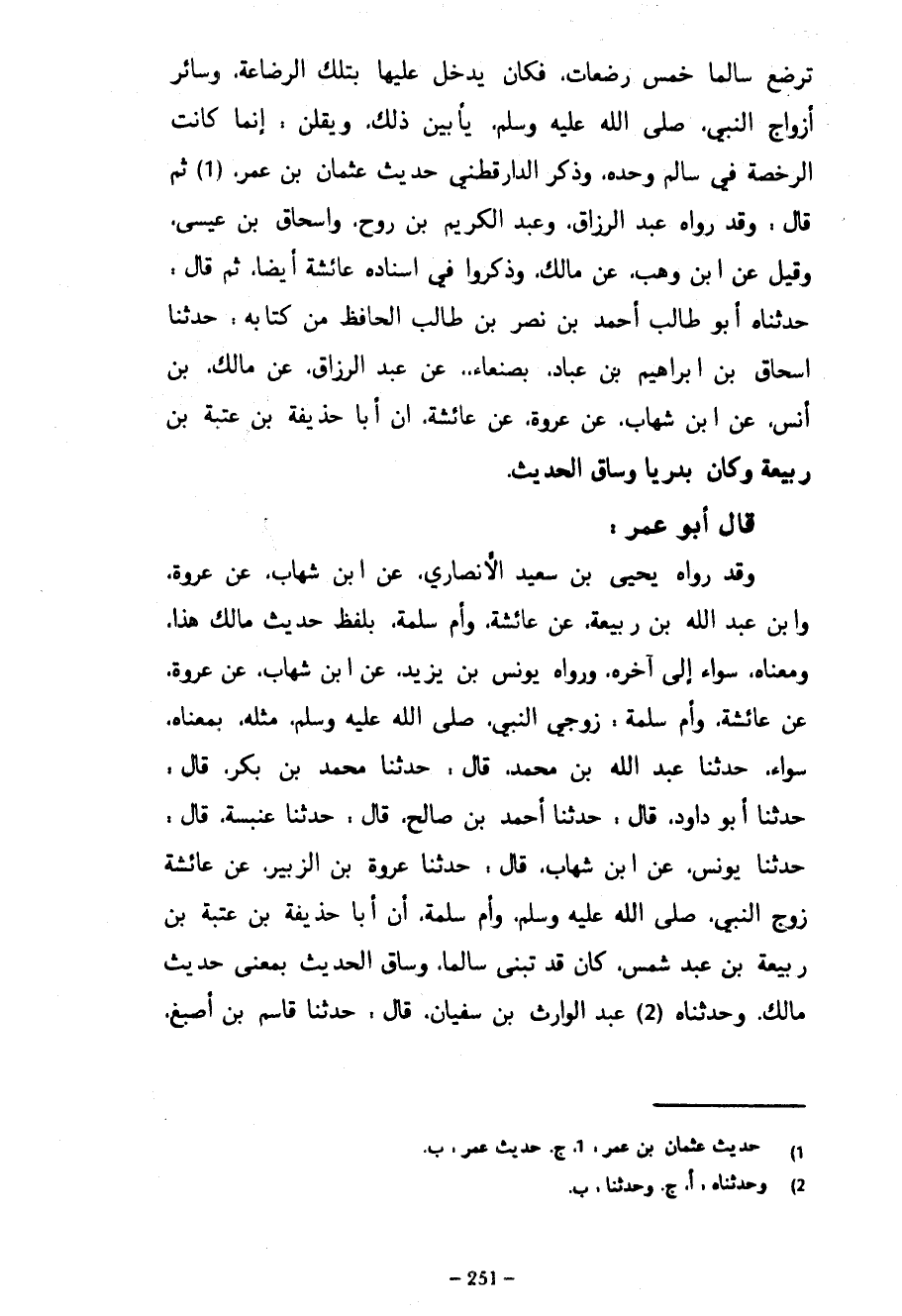 تُرْضِعَ سَالِمًا خَمْسَ رَضَعَاتٍ فَكَانَ يَدْخُلُ عَلَيْهَا بِتِلْكَ الرَّضَاعَةِ وَسَائِرِ أَزْوَاجِ النَّبِيِّ صَلَّى اللَّهُ عَلَيْهِ وَسَلَّمَ يَأْبَيْنَ ذَلِكَ وَيَقُلْنَ إِنَّمَا كَانَتِ الرُّخْصَةُ فِي سَالِمٍ وَحْدَهُ وَذَكَرَ الدَّارَقُطْنِيُّ حَدِيثَ عُثْمَانَ بْنِ عُمَرَ ثُمَّ قَالَ وَقَدْ رَوَاهُ عَبْدُ الرَّزَّاقِ وَعَبْدُ الْكَرِيمِ بْنُ رَوْحٍ وَإِسْحَاقُ بْنُ عِيسَى وَقِيلَ عَنِ ابْنِ وَهْبٍ عَنْ مَالِكٍ وَذَكَرُوا فِي إِسْنَادِهِ عَائِشَةَ أَيْضًا ثُمَّ قَالَ حَدَّثْنَاهُ أَبُو طَالِبٍ أَحْمَدُ بْنُ نَصْرِ بْنِ طَالِبٍ الْحَافِظُ مِنْ كِتَابِهِ حَدَّثَنَا إِسْحَاقُ بْنُ إِبْرَاهِيمَ بْنِ عَبَّادٍ بِصَنْعَاءَ عَنْ عَبْدِ الرَّزَّاقِ عَنْ مَالِكِ بْنِ أَنَسٍ عَنِ ابْنِ شِهَابٍ عَنْ عُرْوَةَ عَنْ عَائِشَةَ أَنَّ أَبَا حُذَيْفَةَ بْنَ عُتْبَةَ بْنِ رَبِيعَةَ وَكَانَ بَدْرِيًّا وَسَاقَ الْحَدِيثَ - قَالَ أَبُو عُمَرَ وَقَدْ رَوَاهُ يَحْيَى بْنُ سَعِيدٍ الْأَنْصَارِيُّ عَنْ ابْنِ شِهَابٍ عَنْ عُرْوَةَ وَابْنِ عَبْدِ اللَّهِ بْنِ رَبِيعَةَ عَنْ عَائِشَةَ وَأُمِّ سَلَمَةَ بِلَفْظِ حَدِيثِ مَالِكٍ هَذَا وَمَعْنَاهُ سَوَاءً إِلَى آخِرِهِ وَرَوَاهُ يُونُسُ بْنُ يَزِيدَ عَنِ ابْنِ شِهَابٍ عَنْ عُرْوَةَ عَنْ عَائِشَةَ وَأُمِّ سَلَمَةَ زَوْجَيِ النَّبِيِّ صَلَّى اللَّهُ عَلَيْهِ وَسَلَّمَ مِثْلَهُ بِمَعْنَاهُ سَوَاءً حَدَّثَنَا عَبْدُ اللَّهِ بْنُ مُحَمَّدٍ قَالَ حَدَّثَنَا مُحَمَّدُ بْنُ بَكْرٍ قَالَ حَدَّثَنَا أَبُو دَاوُدَ قَالَ حَدَّثَنَا أَحْمَدُ بْنُ صَالِحٍ قَالَ حَدَّثَنَا عَنْبَسَةُ قَالَ حَدَّثَنَا يُونُسُ عَنِ ابْنِ شِهَابٍ قَالَ حَدَّثَنَا عُرْوَةَ بْنِ الزُّبَيْرِ عَنْ عَائِشَةَ زَوْجَ النَّبِيِّ صَلَّى اللَّهُ عَلَيْهِ وَسَلَّمَ وَأُمِّ سَلَمَةَ أَنَّ أَبَا حُذَيْفَةَ بْنَ عُتْبَةَ بْنِ رَبِيعَةَ بْنِ عَبْدِ شَمْسٍ كَانَ قَدْ تَبَنَّى سَالِمًا وَسَاقَ الْحَدِيثَ بِمَعْنَى حَدِيثِ مَالِكٍ وَحَدَّثَنَاهُ عَبْدُ الْوَارِثِ بْنُ سُفْيَانَ قَالَ حَدَّثَنَا قَاسِمُ بْنُ أَصْبَغَ