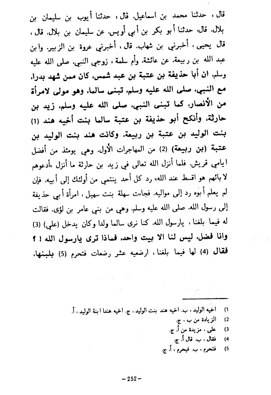 قَالَ حَدَّثَنَا مُحَمَّدُ بْنُ إِسْمَاعِيلَ قَالَ حَدَّثَنَا أَيُّوبُ بْنُ سُلَيْمَانَ بْنِ بِلَالٍ قَالَ حَدَّثَنَا أَبُو بَكْرِ بْنُ أَبِي أُوَيْسٍ عَنْ سُلَيْمَانَ بْنِ بِلَالٍ قَالَ قَالَ يَحْيَى أَخْبَرَنِي ابْنُ شِهَابٍ قَالَ أَخْبَرَنِي عُرْوَةُ بْنُ الزُّبَيْرِ وَابْنُ عبد الله بن ربيعة عَنْ عَائِشَةَ وَأُمِّ سَلَمَةَ زَوْجَيِ النَّبِيِّ صَلَّى اللَّهُ عَلَيْهِ وَسَلَّمَ أَنَّ أَبَا حُذَيْفَةَ بْنَ عُتْبَةَ بْنِ عَبْدِ شمس كان من شَهِدَ بَدْرًا مَعَ النَّبِيِّ صَلَّى اللَّهُ عَلَيْهِ وَسَلَّمَ تَبَنَّى سَالِمًا وَهُوَ مَوْلًى لِامْرَأَةٍ مِنَ الْأَنْصَارِ كَمَا تَبَنَّى النَّبِيُّ صَلَّى اللَّهُ عَلَيْهِ وَسَلَّمَ زَيْدَ بْنَ حَارِثَةَ وَأَنْكَحَ أَبُو حُذَيْفَةَ بن عتبة سالما بنت أخيه ند بِنْتَ الْوَلِيدِ بْنِ عُتْبَةَ بْنِ رَبِيعَةَ وَكَانَتْ هند بنت الوليد بن عتبة (بن ربيعة) مِنَ الْمُهَاجِرَاتِ الْأُوَلِ وَهِيَ يَوْمَئِذٍ مِنْ أَفْضَلِ أَيَامَى قُرَيْشٍ فَلَمَّا أَنْزَلَ اللَّهُ تَعَالَى فِي زَيْدِ بْنِ حَارِثَةَ مَا أَنْزَلَ ادْعُوهُمْ لِآبَائِهِمْ هُوَ أَقْسَطُ عِنْدَ اللَّهِ رُدَّ كُلُّ أَحَدٍ يَنْتَمِي مِنْ أُولَئِكَ إِلَى أَبِيهِ فَإِنْ لَمْ يعلم أبوه رد إلى مواليه فجاءت سهلة بِنْتُ سُهَيْلٍ امْرَأَةُ أَبِي حُذَيْفَةَ إِلَى رَسُولِ اللَّهِ صَلَّى اللَّهُ عَلَيْهِ وَسَلَّمَ وَهِيَ مِنْ بَنِي عَامِرِ بْنِ لُؤَيٍّ فَقَالَتْ لَهُ فِيمَا بَلَغَنَا يَا رَسُولَ اللَّهِ كُنَّا نَرَى سَالِمًا وَلَدًا وَكَانَ يَدْخُلُ (عَلِيَّ) وَأَنَا فُضُلٌ لَيْسَ لَنَا إِلَّا بَيْتٌ وَاحِدٌ فَمَاذَا تَرَى يَا رَسُولَ اللَّهِ فَقَالَ لَهَا فِيمَا بَلَغَنَا أَرْضِعِيهِ عَشْرَ رَضَعَاتٍ فَتَحْرُمُ بِلَبَنِهَا