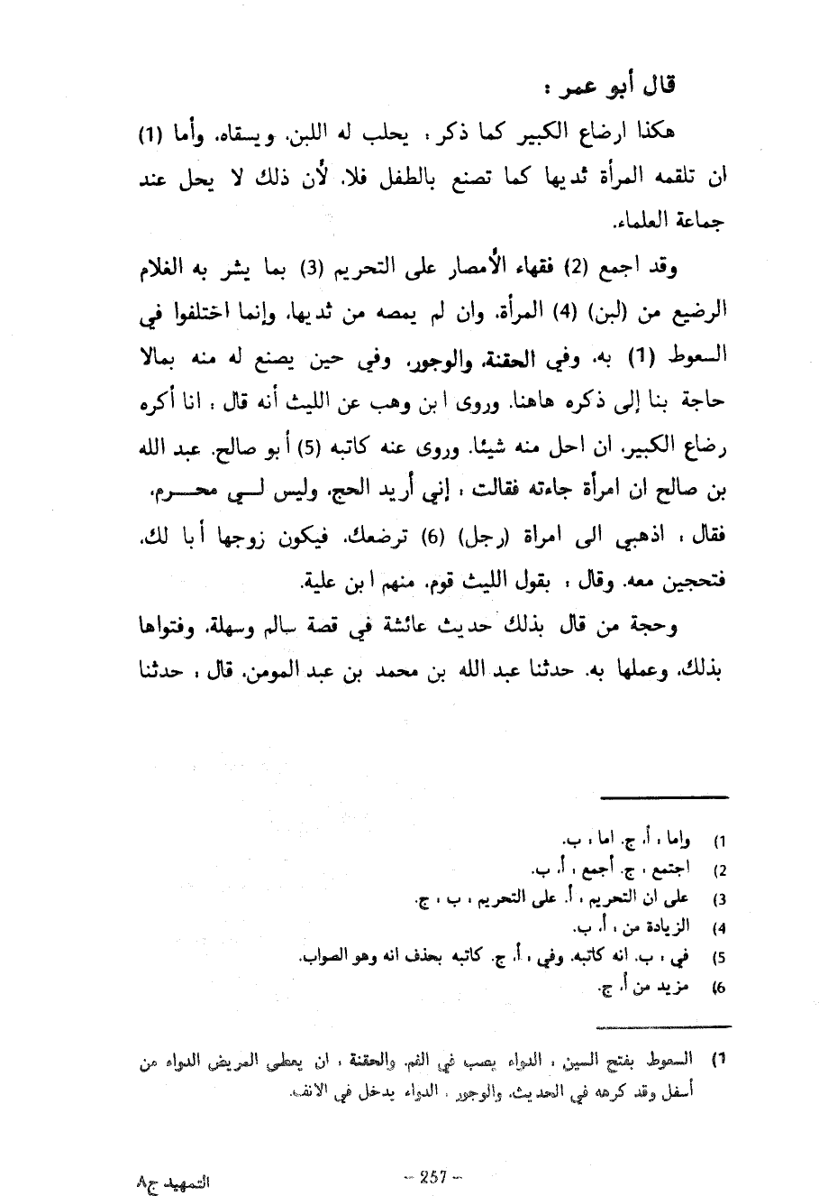 - قَالَ أَبُو عُمَرَ هَكَذَا إِرْضَاعُ الْكَبِيرِ كَمَا ذَكَرَ يُحْلَبُ لَهُ اللَّبَنُ وَيُسْقَاهُ وَأَمَّا أَنْ تُلْقِمَهُ الْمَرْأَةُ ثَدْيَهَا كَمَا تَصْنَعُ بِالطِّفْلِ فَلَا لِأَنَّ ذَلِكَ لَا يَحِلُّ عِنْدَ جَمَاعَةِ الْعُلَمَاءِ وَقَدْ أَجْمَعَ فُقَهَاءُ الْأَمْصَارِ عَلَى التَّحْرِيمِ بِمَا يَشْرَبُهُ الْغُلَامُ الرَّضِيعُ مِنْ (لَبَنِ) الْمَرْأَةِ وَإِنْ لَمْ يَمُصَّهُ مِنْ ثَدْيِهَا وَإِنَّمَا اخْتَلَفُوا فِي السَّعُوطِ بِهِ وَفِي الْحُقْنَةِ وَالْوُجُورِ وَفِي حِينِ يَصْنَعُ لَهُ مِنْهُ بِمَا لَا حَاجَةَ بِنَا إلى ذكره هاهنا وَرَوَى ابْنُ وَهْبٍ عَنِ اللَّيْثِ أَنَّهُ قَالَ أَنَا أَكْرَهُ رَضَاعَ الْكَبِيرِ أَنْ أُحِلَّ مِنْهُ شَيْئًا وَرَوَى عَنْهُ كَاتِبُهُ أَبُو صَالِحٍ عَبْدُ اللَّهِ بْنُ صَالِحٍ أَنَّ امْرَأَةً جَاءَتْهُ فَقَالَتْ إِنِّي أُرِيدُ الْحَجَّ وَلَيْسَ لِي مَحْرَمٌ فَقَالَ اذْهَبِي إِلَى امْرَأَةِ (رَجُلٍ) تُرْضِعُكِ فَيَكُونُ زَوْجُهَا أَبًا لَكِ فَتَحُجِّينَ مَعَهُ وَقَالَ بِقَوْلِ اللَّيْثِ قَوْمٌ مِنْهُمُ ابْنُ عُلَيَّةَ وَحُجَّةُ مَنْ قَالَ بِذَلِكَ حَدِيثُ عَائِشَةَ فِي قِصَّةِ سَالِمٍ وَسَهْلَةَ وَفَتْوَاهَا بِذَلِكَ وَعَمَلُهَا بِهِ حَدَّثَنَا عَبْدُ اللَّهِ بْنُ مُحَمَّدِ بْنِ عَبْدِ الْمُؤْمِنِ قَالَ حَدَّثَنَا