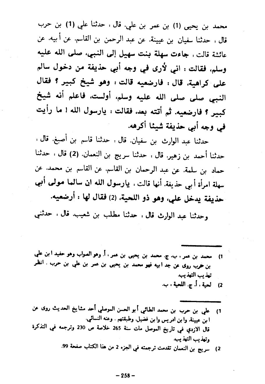 مُحَمَّدُ بْنُ يَحْيَى بْنِ عُمَرَ بْنِ عَلِيٍّ قَالَ حَدَّثَنَا عَلِيُّ بْنُ حَرْبٍ قَالَ حَدَّثَنَا سُفْيَانُ بْنُ عُيَيْنَةَ عَنْ عَبْدِ الرَّحْمَنِ بْنِ الْقَاسِمِ عَنْ أَبِيهِ عَنْ عَائِشَةَ قَالَتْ جَاءَتْ سَهْلَةُ بِنْتُ سُهَيْلٍ إِلَى النَّبِيِّ صَلَّى اللَّهُ عَلَيْهِ وَسَلَّمَ فَقَالَتْ إِنِّي لَأَرَى فِي وَجْهِ أَبِي حُذَيْفَةَ مِنْ دُخُولِ سَالِمٍ عَلَيَّ كَرَاهِيَةً قَالَ فَأَرْضِعِيهِ قَالَتْ وَهُوَ شَيْخٌ كَبِيرٌ فَقَالَ النبي صلى الله عليه وسلم أولست فاعلم أَنَّهُ شَيْخٌ كَبِيرٌ فَأَرْضِعِيهِ ثُمَّ أَتَتْهُ بَعْدُ فَقَالَتْ يَا رَسُولَ اللَّهِ مَا رَأَيْتُ فِي وَجْهِ أَبِي حُذَيْفَةَ شَيْئًا أَكْرَهُهُ حَدَّثَنَا عَبْدُ الْوَارِثِ بْنُ سُفْيَانَ قَالَ حَدَّثَنَا قَاسِمُ بْنُ أَصْبَغَ قَالَ حَدَّثَنَا أَحْمَدُ بْنُ زُهَيْرٍ قَالَ حَدَّثَنَا سُرَيْجُ بْنُ النُّعْمَانِ قَالَ حَدَّثَنَا حَمَّادُ بْنُ سَلَمَةَ عَنْ عَبْدِ الرَّحْمَنِ بْنِ الْقَاسِمِ عَنِ الْقَاسِمِ بْنِ مُحَمَّدٍ عَنْ سَهْلَةَ امْرَأَةِ أَبِي حُذَيْفَةَ أَنَّهَا قَالَتْ يَا رَسُولَ اللَّهِ إِنَّ سَالِمًا مَوْلَى أَبِي حُذَيْفَةَ يَدْخُلُ عَلَيَّ وَهُوَ ذُو اللِّحْيَةِ فَقَالَ لَهَا أَرْضِعِيهِ وَحَدَّثَنَا عَبْدُ الْوَارِثِ قَالَ حَدَّثَنَا مُطَّلِبُ بْنُ شُعَيْبٍ قَالَ حَدَّثَنِي