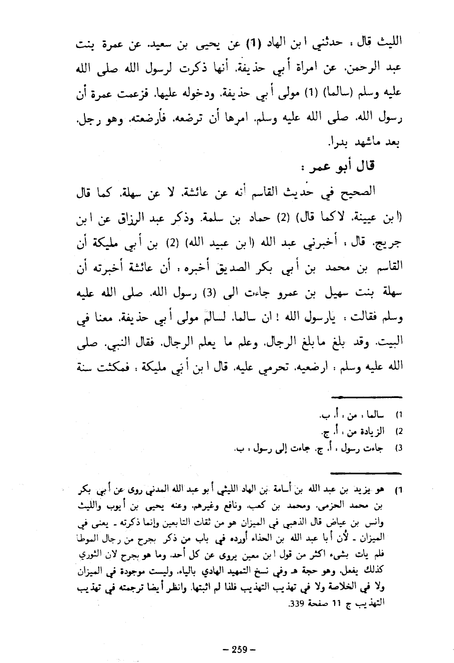 اللَّيْثُ قَالَ حَدَّثَنِي ابْنُ الْهَادِ عَنْ يَحْيَى بْنِ سَعِيدٍ عَنْ عَمْرَةَ بِنْتِ عَبْدِ الرَّحْمَنِ عَنِ امْرَأَةِ أَبِي حُذَيْفَةَ أَنَّهَا ذَكَرَتْ لِرَسُولِ اللَّهِ صَلَّى اللَّهُ عَلَيْهِ وَسَلَّمَ (سَالِمًا) مَوْلَى أَبِي حُذَيْفَةَ وَدُخُولَهُ عَلَيْهَا فَزَعَمَتْ عَمْرَةُ أَنَّ رَسُولَ اللَّهِ صَلَّى اللَّهُ عَلَيْهِ وَسَلَّمَ أَمَرَهَا أَنْ تُرْضِعَهُ فَأَرْضَعَتْهُ وَهُوَ رَجُلٌ بَعْدُ مَا شَهِدَ بَدْرًا - قَالَ أَبُو عُمَرَ الصَّحِيحُ فِي حَدِيثِ الْقَاسِمِ أَنَّهُ عَنْ عَائِشَةَ لَا عَنْ سَهْلَةَ كَمَا قَالَ (ابْنُ عُيَيْنَةَ لَا كَمَا قَالَ) حَمَّادُ بْنُ سَلَمَةَ وَذَكَرَ عَبْدُ الرَّزَّاقِ عَنِ ابْنِ جُرَيْجٍ قَالَ أَخْبَرَنِي عَبْدُ اللَّهِ (ابْنُ عُبَيْدِ اللَّهِ) بْنِ أَبِي مُلَيْكَةَ أَنَّ الْقَاسِمِ بْنِ مُحَمَّدِ بْنِ أَبِي بَكْرٍ الصَّدِيقِ أَخْبَرَهُ أَنَّ عَائِشَةَ أَخْبَرَتْهُ أَنَّ سَهْلَةَ بِنْتَ سُهَيْلِ بْنِ عَمْرِو جَاءَتْ إِلَى رَسُولِ اللَّهِ صَلَّى اللَّهُ عَلَيْهِ وَسَلَّمَ فَقَالَتْ يَا رَسُولَ اللَّهِ إِنَّ سَالِمًا لِسَالِمٍ مَوْلَى أَبِي حُذَيْفَةَ مَعَنَا فِي الْبَيْتِ وَقَدْ بَلَغَ مَا بَلَغَ الرِّجَالُ وَعَلِمَ مَا يَعْلَمُ الرِّجَالُ فَقَالَ النَّبِيُّ صَلَّى اللَّهُ عَلَيْهِ وَسَلَّمَ أَرْضِعِيهِ تَحْرُمِي عَلَيْهِ قَالَ ابْنُ أَبِي مُلَيْكَةَ فَمَكَثْتُ سَنَةً