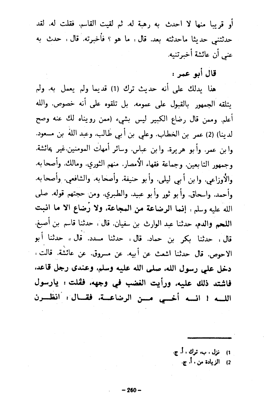أَوْ قَرِيبًا مِنْهَا لَا أُحَدِّثُ بِهِ رَهْبَةً لَهُ ثُمَّ لَقِيتُ الْقَاسِمَ فَقُلْتُ لَهُ لَقَدْ حَدَّثْتَنِي حَدِيثًا مَا حَدَّثْتُهُ بَعْدُ قَالَ مَا هُوَ فَأَخْبَرْتُهُ قَالَ حَدِّثْ بِهِ عَنِّي أَنَّ عَائِشَةَ أَخْبَرَتْنِيهِ - قَالَ أَبُو عُمَرَ هَذَا يَدُلُّكَ عَلَى أَنَّهُ حَدِيثٌ تُرِكَ قَدِيمًا وَلَمْ يُعْمَلْ بِهِ وَلَمْ يَتَلَقَّهُ الْجُمْهُورُ بِالْقَبُولِ عَلَى عُمُومِهِ بَلْ تَلَقَّوْهُ عَلَى أَنَّهُ خُصُوصٌ وَاللَّهُ أَعْلَمُ وَمِمَّنْ قَالَ رَضَاعُ الْكَبِيرِ لَيْسَ بِشَيْءٍ (مِمَّنْ رَوَيْنَاهُ لَكَ عَنْهُ وَصَحَّ لَدَيْنَا) عُمَرَ بْنِ الْخَطَّابِ وَعَلِيِّ بْنِ أَبِي طَالِبٍ وَعَبْدُ اللَّهِ بْنِ مَسْعُودٍ وَابْنُ عُمَرَ وَأَبُو هُرَيْرَةَ وَابْنُ عَبَّاسٍ وَسَائِرُ أُمَّهَاتِ الْمُؤْمِنِينَ غَيْرَ عَائِشَةَ وَجُمْهُورُ التَّابِعِينَ وَجَمَاعَةُ فُقَهَاءِ الْأَمْصَارِ مِنْهُمُ الثَّوْرِيُّ وَمَالِكٌ وَأَصْحَابُهُ وَالْأَوْزَاعِيُّ وَابْنُ أَبِي لَيْلَى وَأَبُو حَنِيفَةَ وَأَصْحَابُهُ وَالشَّافِعِيُّ وَأَصْحَابُهُ وَأَحْمَدُ وَإِسْحَاقُ وَأَبُو ثَوْرٍ وَأَبُو عُبَيْدٍ وَالطَّبَرِيُّ وَمِنْ حُجَّتِهِمْ قَوْلُهُ صَلَّى اللَّهُ عَلَيْهِ وَسَلَّمَ إِنَّمَا الرَّضَاعَةُ مِنَ الْمَجَاعَةِ وَلَا رَضَاعَ إِلَّا مَا أَنْبَتَ اللَّحْمَ وَالدَّمَ حَدَّثَنَا عَبْدُ الْوَارِثِ بْنُ سُفْيَانَ قَالَ حَدَّثَنَا قَاسِمُ بْنُ أَصْبَغَ قَالَ حَدَّثَنَا بَكْرُ بْنُ حَمَّادٍ قَالَ حَدَّثَنَا مُسَدَّدٌ قَالَ حَدَّثَنَا أَبُو الأحوص قال حدثنا أشعث عَنْ أَبِيهِ عَنْ مَسْرُوقٍ عَنْ عَائِشَةَ قَالَتْ دَخَلَ عَلَيَّ رَسُولُ اللَّهِ صَلَّى اللَّهُ عَلَيْهِ وَسَلَّمَ وَعِنْدِي رَجُلٌ قَاعِدٌ فَاشْتَدَّ ذَلِكَ عَلَيْهِ وَرَأَيْتُ الْغَضَبَ فِي وَجْهِهِ فَقُلْتُ يَا رَسُولَ اللَّهِ إِنَّهُ أَخِي مَنِ الرَّضَاعَةِ فَقَالَ انْظُرْنَ